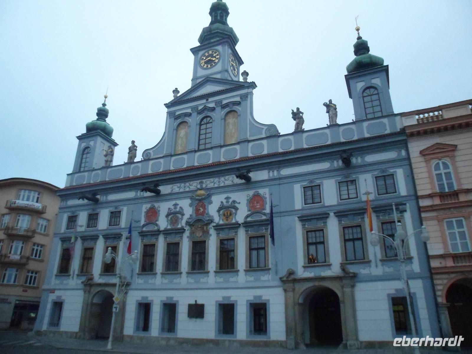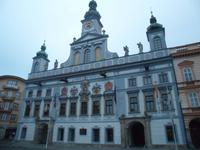 Unser Rundgang führte uns durch den historischen Kern der Stadt zum Marktplatz - der zu den größten Plätzen Mitteleuropas gehört - welcher von farbenfrohen Laubenhäusern im Stil des Barock und Klassizismus umrahmt ist. Er bildet ein fast vollkommenes Quadrat (133 m x 133 m). Unser Weg führte zunächst zum auffälligsten Gebäude am Markt - das hellblaue, dreitürmige Rathaus mit dem Budweiser Stadtwappen. Wir sahen die imposanten Wasserspeier in Drachenform und die Statuen, welche Gerechtigkeit, Tapferkeit, Tugend und Weisheit symbolisieren.