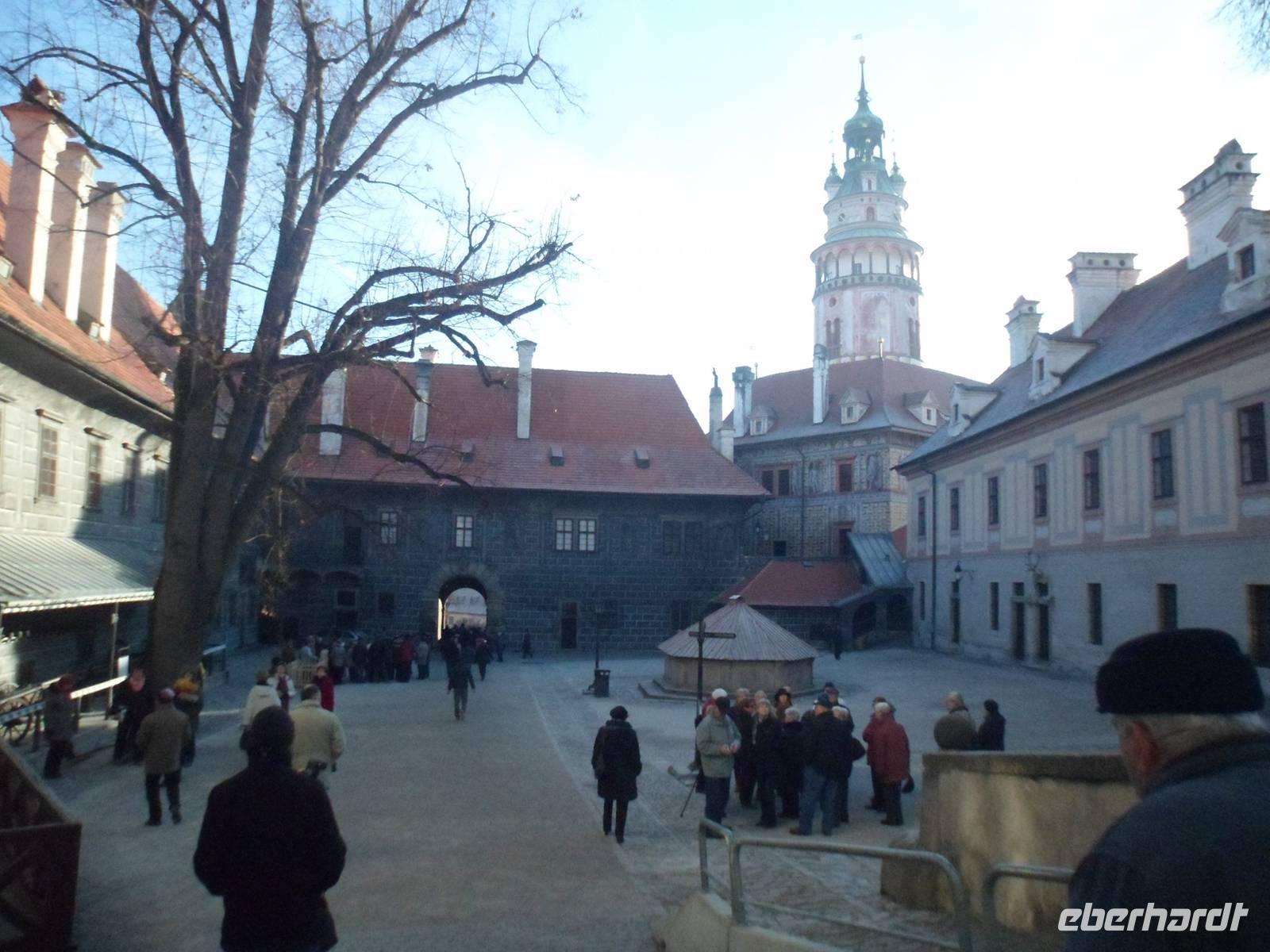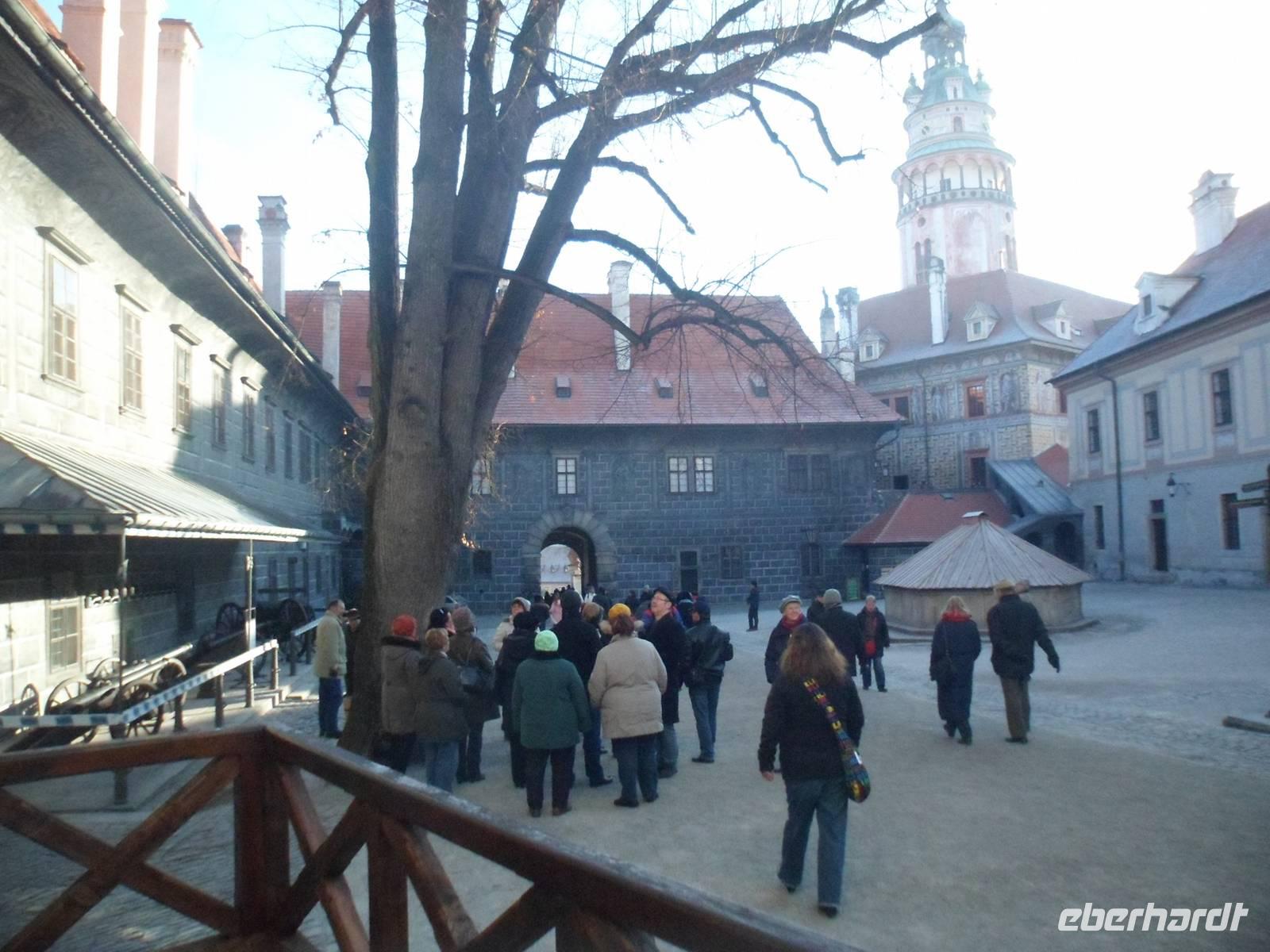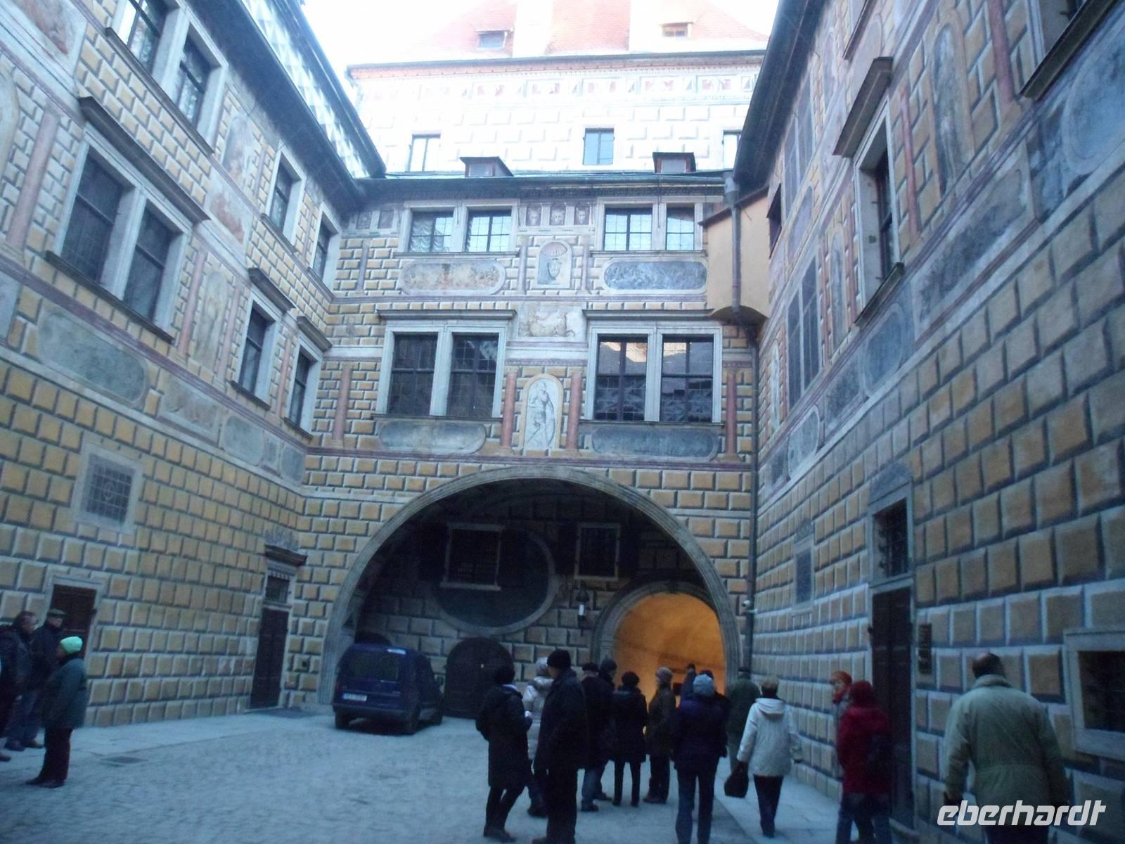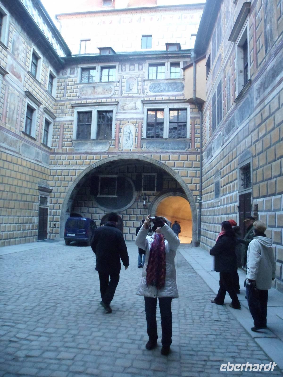 Die drei großen Adelsgeschlechter Südböhmens, die Rosen-, Eggen- und Schwarzenbergs haben hier immer wieder um-, an- und neu gebaut. Entstanden ist, nach Prag, die zweitgrößte Burganlage Böhmens mit fünf Schlosshöfen, um die sich zahlreiche Gebäude gruppieren. Unser Abstieg führte uns durch die vielen Schlosshöfe, durchs Bärentor und durch viele kleine schmale Gassen zum Marktplatz, weiter bis zur Kirche. Hier endete unser gemeinsamer Rundgang. Jeder konnte selbst die Stadt mit den schmalen Gassen und den vielen kleinen Einkaufsläden erkunden.