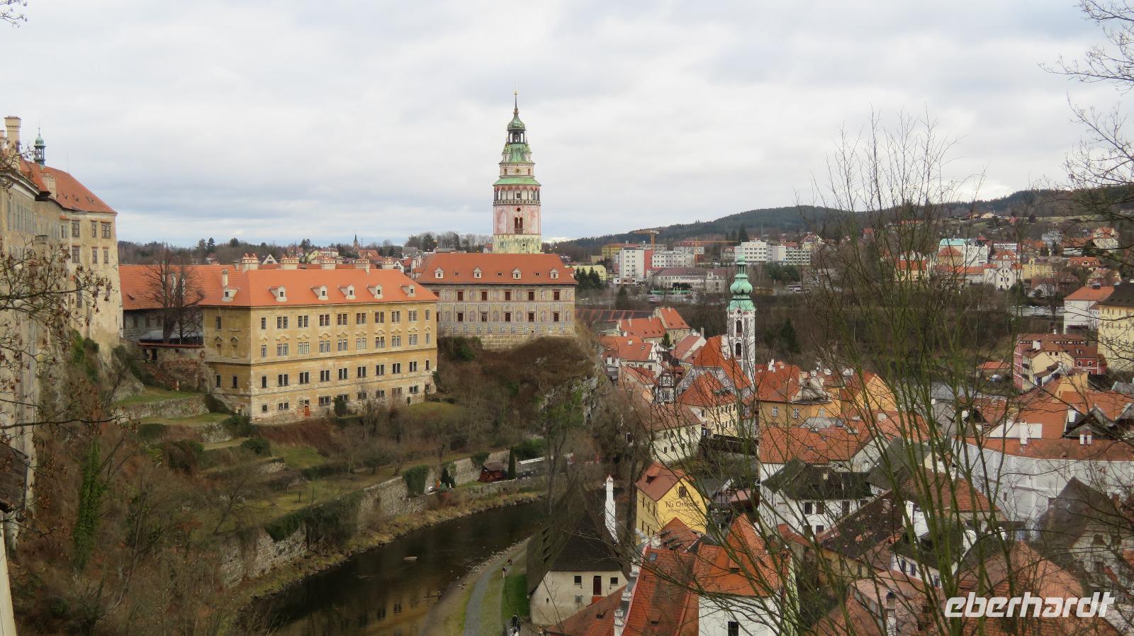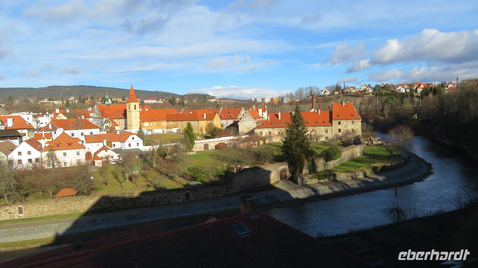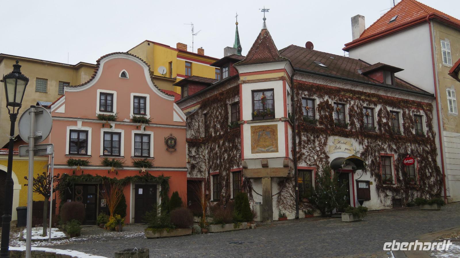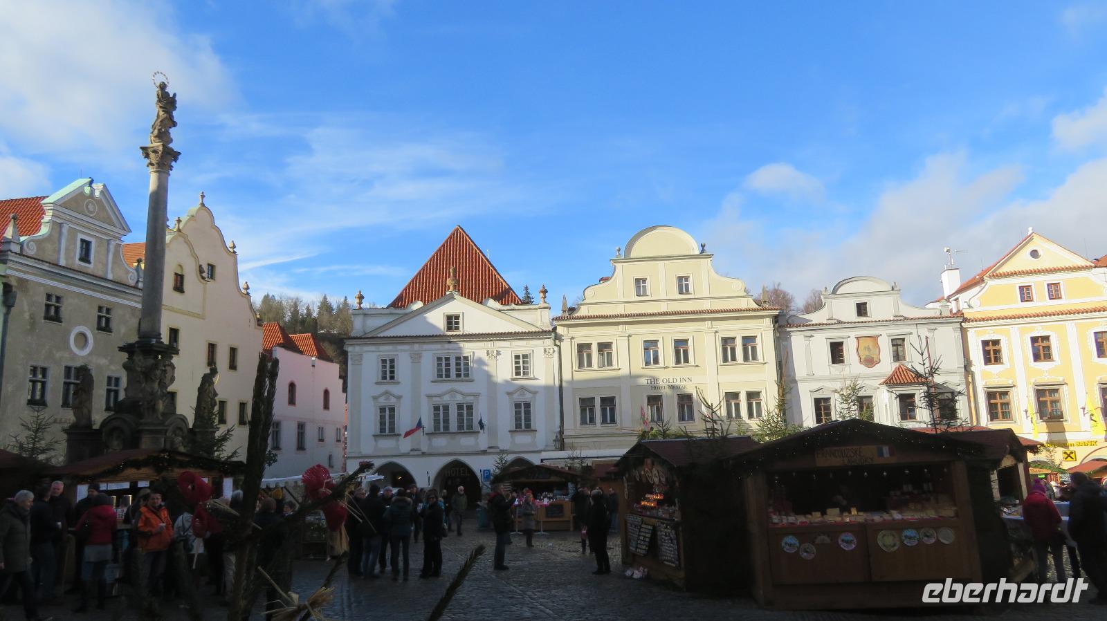 Auf dem Masaryk-Platz mit herrlich renovierten Laubenganghäusern bewundern wir die Fassaden im Stil der Renaissance und des Barock. Das Renaissance-Schloss der Familie Schwarzenberg, eines der größten des Landes, ist in der Winterzeit nur von außen zu besichtigen. Auch für den Englischen Garten reicht die Zeit nur für einen kurzen Blick.