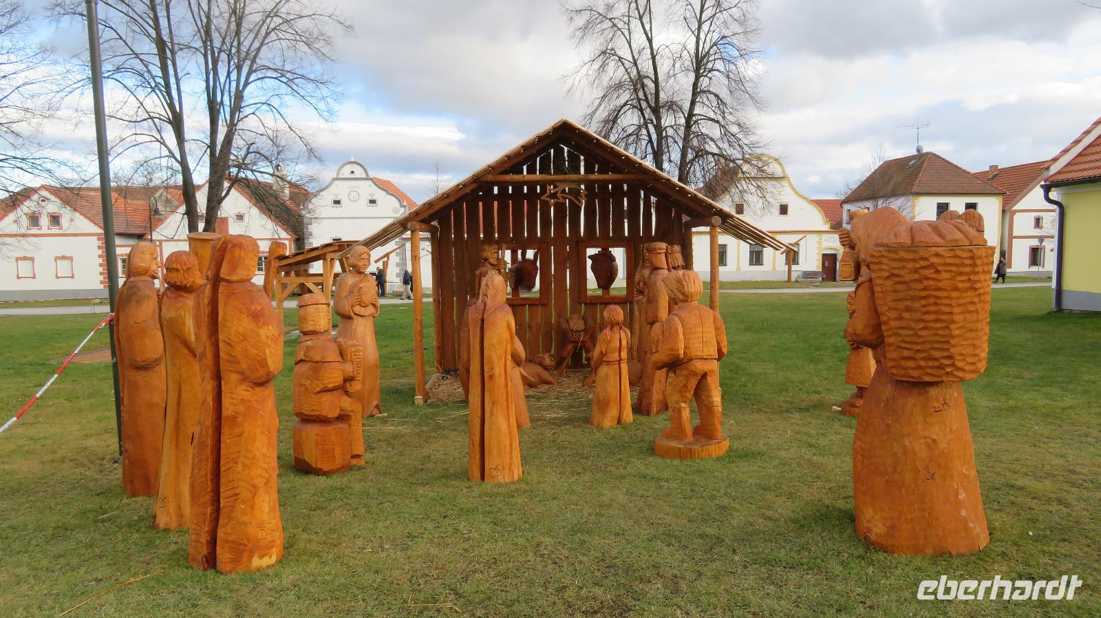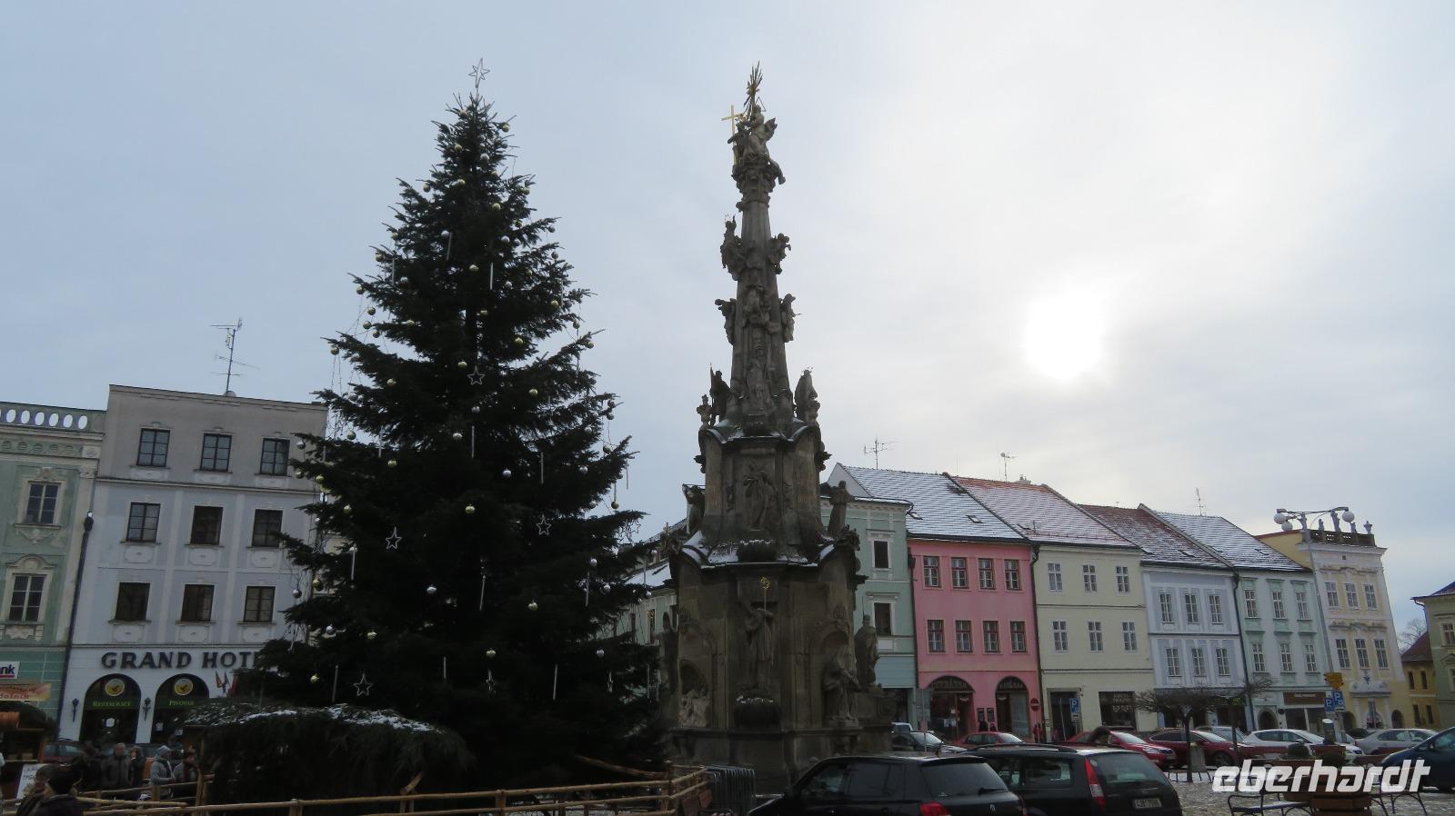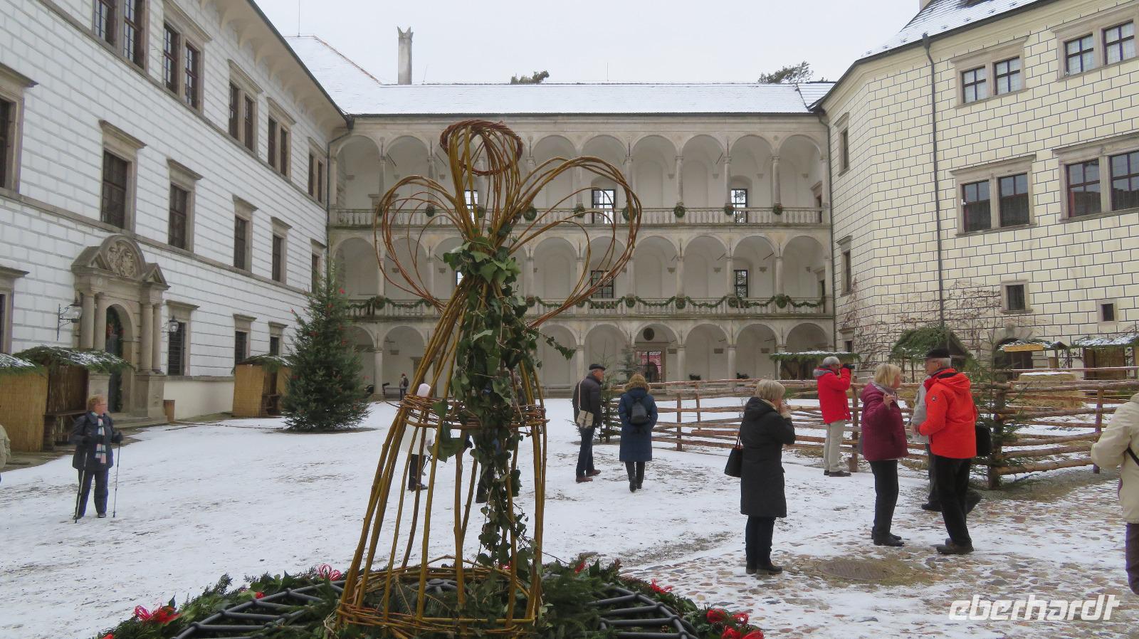 In der Mittagzeit besuchen wir Jindrichuv Hradec - Neuhaus. Hier befindet sich der drittgrößte Schlosskomplex der Tschechischen Republik. Auf dem "Platz des Friedens" ist der obligatorische Weihnachtsmarkt noch geöffnet, überall in den Städten, die wir besuchen, mit wunderschönen handgefertigten Krippen. Auch hier können wir leider nur den imposanten Innenhof des Schlosses mit dem Rondell besichtigen. Alles ist noch sehr schön weihnachtlich dekoriert. Jana bringt uns zum 15. Meridian, der mitten durch die Stadt führt.