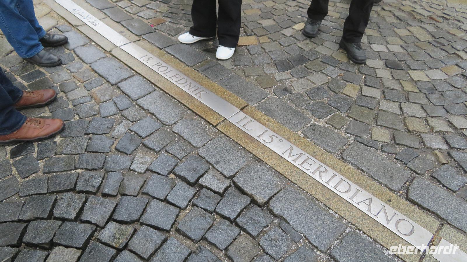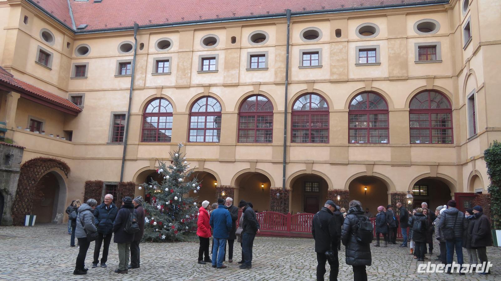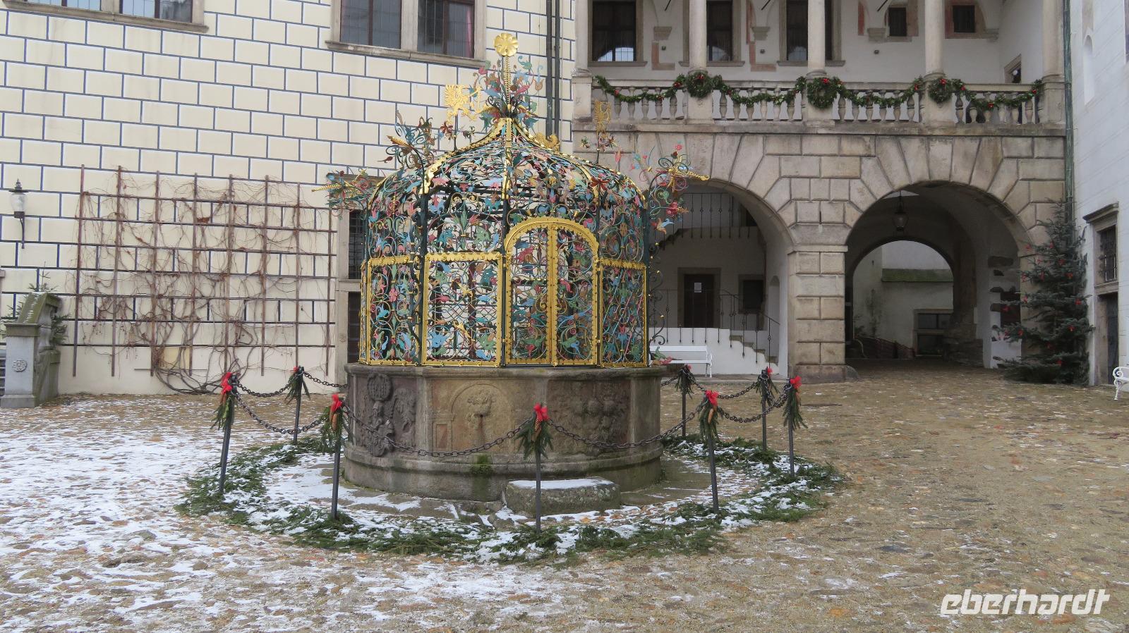 In der Mittagzeit besuchen wir Jindrichuv Hradec - Neuhaus. Hier befindet sich der drittgrößte Schlosskomplex der Tschechischen Republik. Auf dem "Platz des Friedens" ist der obligatorische Weihnachtsmarkt noch geöffnet, überall in den Städten, die wir besuchen, mit wunderschönen handgefertigten Krippen. Auch hier können wir leider nur den imposanten Innenhof des Schlosses mit dem Rondell besichtigen. Alles ist noch sehr schön weihnachtlich dekoriert. Jana bringt uns zum 15. Meridian, der mitten durch die Stadt führt.