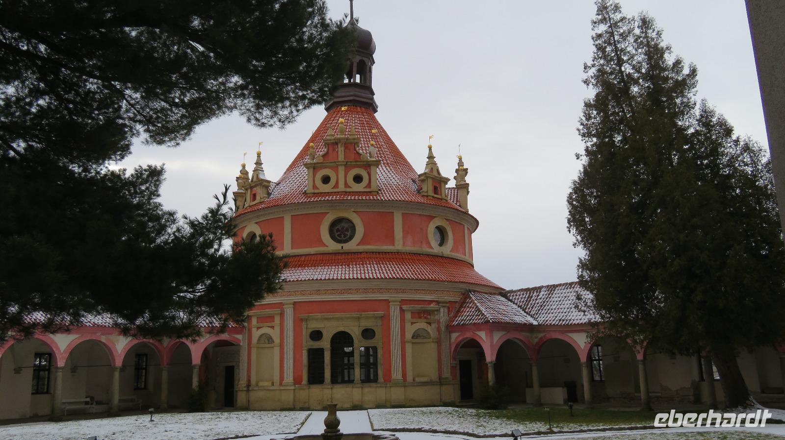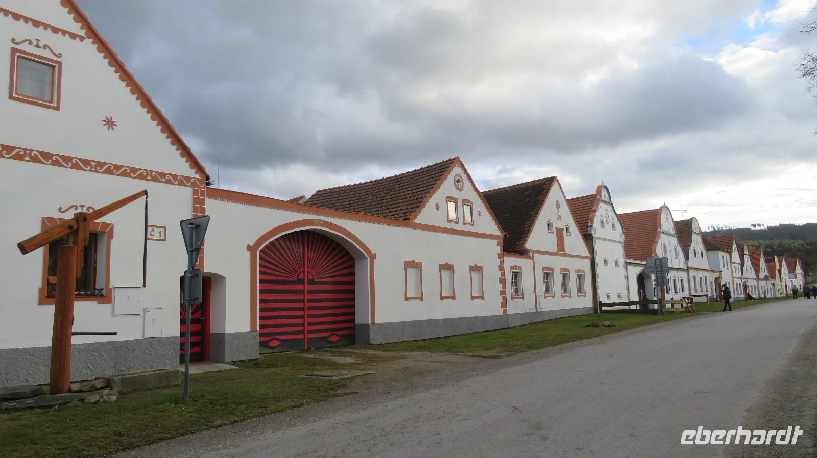 Am letzten Tag des Jahres führt uns die Fahrt in eines der bekanntesten und malerischsten Städte von Tschechien, nach Cesky Krumlov - Böhmisch Krumau. Auch diese Stadt hat die UNESCO unter Denkmalsschutz gestellt. Nicht umsonst wird die Stadt als "Perle des Böhmerwaldes" oder "Venedig an der Moldau" bezeichnet. Im Sommer hoffnungslos überlaufen, sind wir auch am Silvestertag nicht die einzigen Gäste. Aber es ist überschaubar, im wahrsten Sinne des Wortes. Jana bringt uns zuerst auf den Burgberg, und von dort haben wir einen herrlichen Blick über die Dächer der Altstadt, mit engen Gassen, mit der Schleife der Moldau... Wir durchqueren den zweitgrößten Burgkomplex Tschechiens nach dem Prager Hradschin, immer natürlich begleitet von den interessanten Informationen zu Land und Leuten von unserer Stadtführerin Jana. Imposant der 54 m hohe Schlossturm, das Wahrzeichen der Stadt. Am Ringplatz, dem Mittelpunkt der Stadt, mit seinem Weihnachtsmarkt, bleibt genügend Zeit zur Stärkung und um die Gassen und Kirchen auf eigene Faust zu erkunden. Petra gibt noch ein kleines Fläschchen Becherovka aus, die Spezialität des Landes, die man auch gerne als Erinnerung mit nach Hause nehmen kann. Unsere Reise hat noch ein letztes berühmtes Dorf auf dem Programm, welches ebenfalls von der UNESCO unter Schutz gestellt wurde, Holasovice. Es gilt als einzigartiges Beispiel von böhmischer dörflicher Architektur, ist für den Bauernbarock bekannt. Hier haben sich an die zwanzig Höfe aus der Mitte des 19.Jahrhunderts erhalten, die in neuem Glanz erstrahlen.