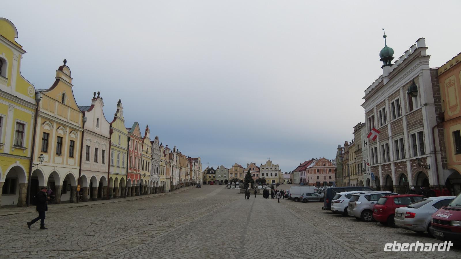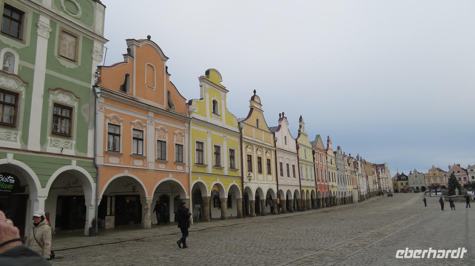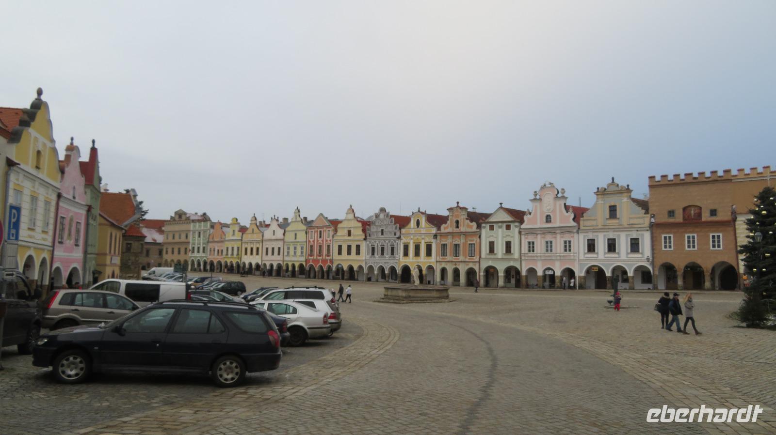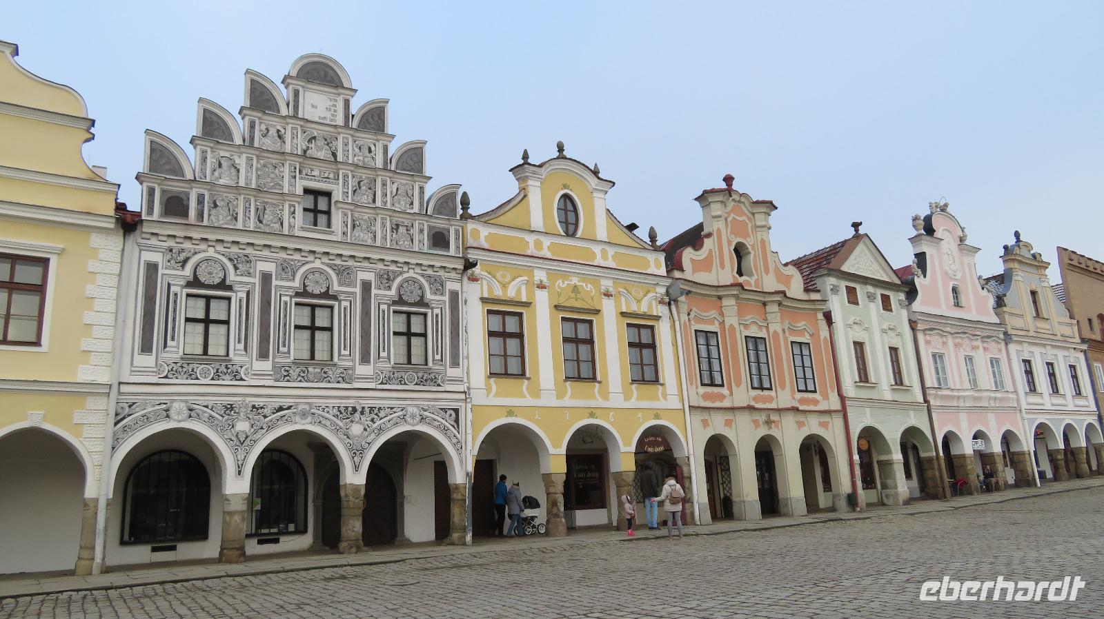 Nach einer kleinen Mittagspause fahren wir durch die dünnbesiedelte waldreiche Landschaft von Böhmisch Kanada und Jana zeigt uns das seit 1992 unter UNESCO-Schutz stehende Renaissance-Städtchen Teltsch, einer der schönsten Orte des Landes. Die Attraktion ist der riesige Zachariasplatz mit einer harmonischen Reihe von Häusern und Kirchen, in den letzten Jahren liebevoll restauriert. Fast jedes ein Kleinod! Kein Wunder, dass der Ort gern als Kulisse für Filme genutzt wird. Für das prächtige Renaissanceschloss bleibt auch hier keine Zeit.