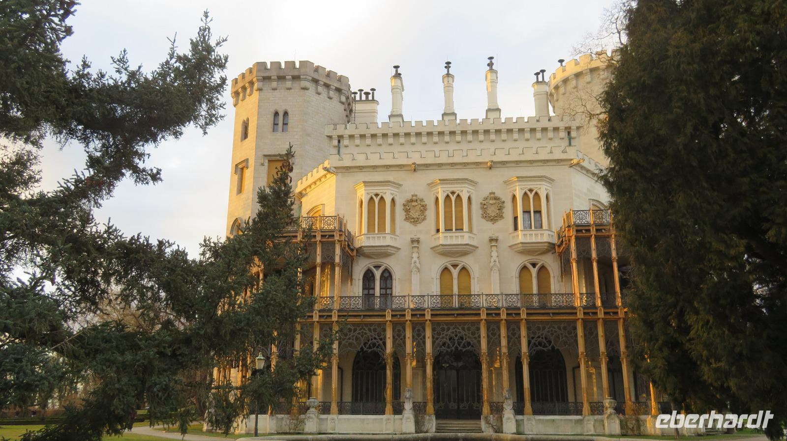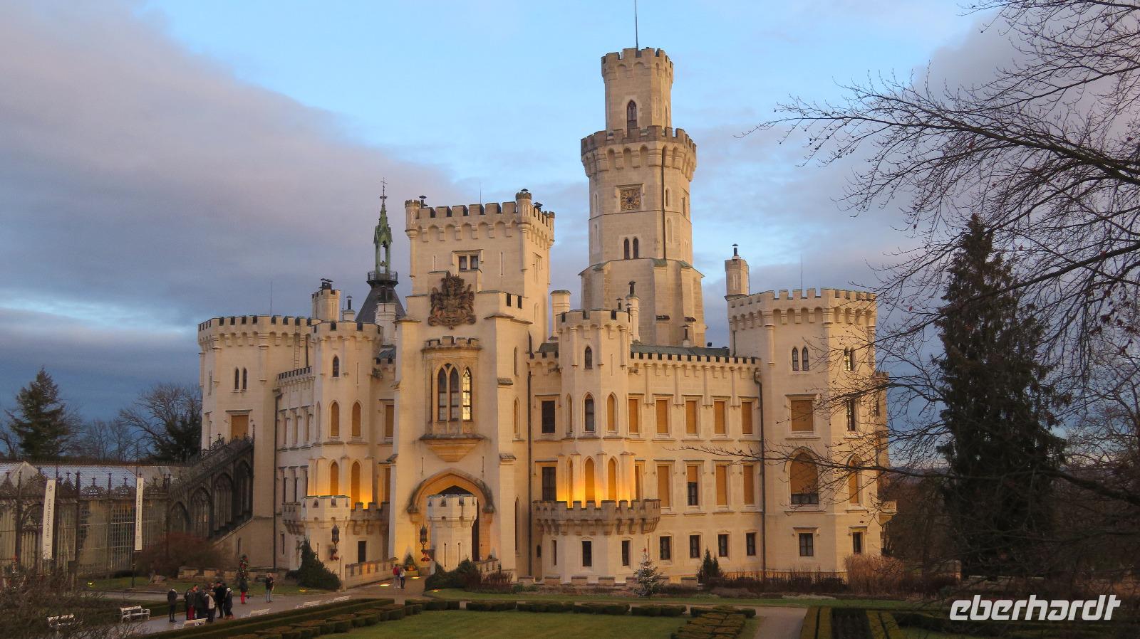 Am Nachmittag sind wir wieder in den Hotels und wer noch Lust und Kraft zu einem Spaziergang hat, der steigt hinauf zu dem bekannten Märchenschloss Hluboka, dem böhmischen Neuschwanstein. Die Sonne schickt ihre letzten Strahlen und verleiht dem Schloss einen goldenen Schimmer.