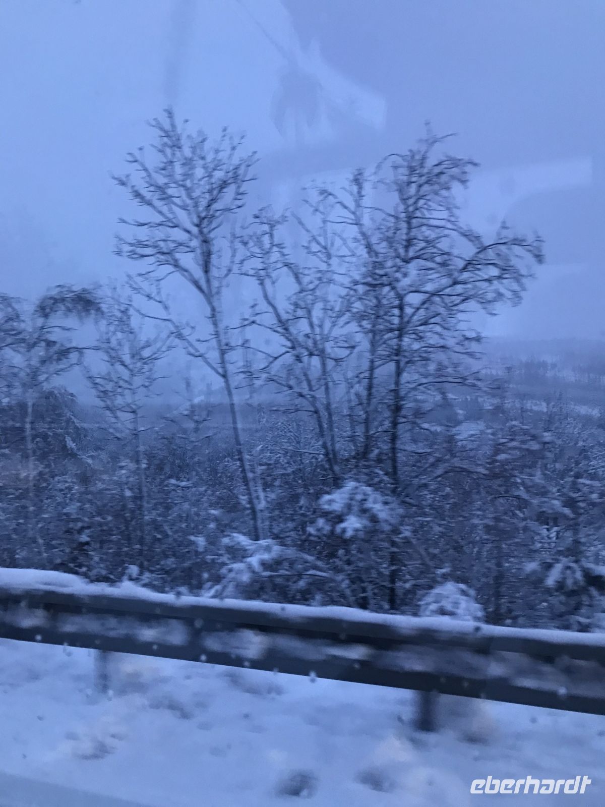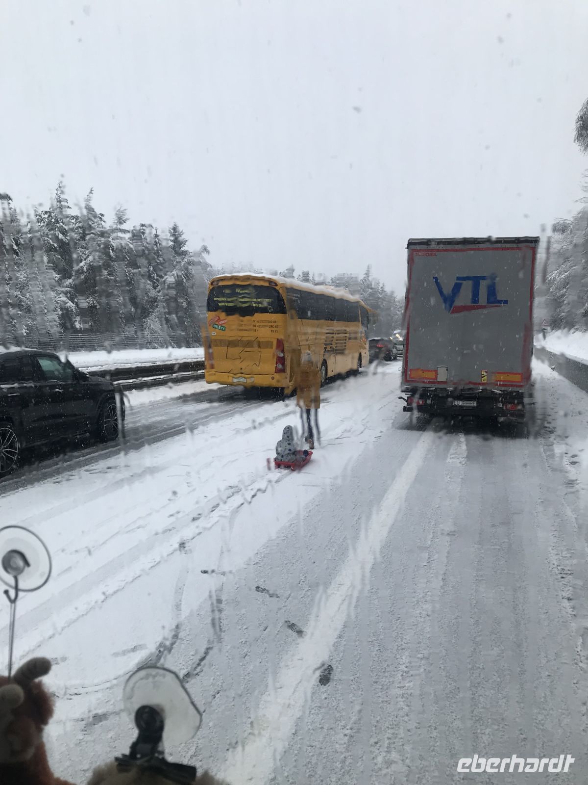 Kurz nach der Grenze wurde aus dem Regen Schnee. Leider hielt sich die Freude nicht lange, gegen 13:30 bei Regen stellten wir uns im Stau an, es ging ab und an nur stockend vorwärts.