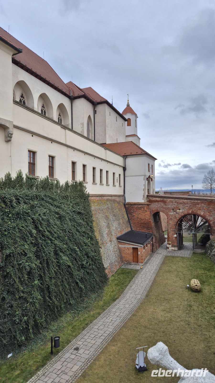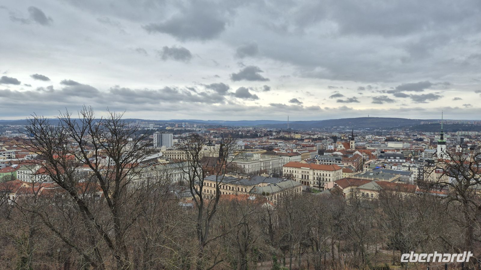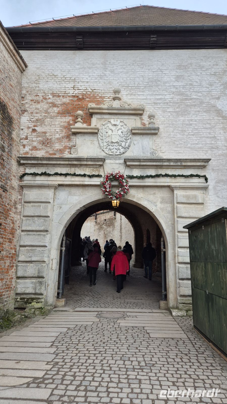 Der Morgen des Heiligen Abends erwartet uns mit eisiger Kälte und ein paar Schneeflocken. Heute steht die richtige Erkundung Brünns auf dem Programm, dazu bekommen wir Unterstützung von der freundlichen Stadtführerin Lenka. Mit dem Bus brechen wir zunächst zu einer Stadtrundfahrt auf. Es geht vorbei am Mendelplatz und dem Augustinerkloster, in dem der Naturwissenschaftler forschte, dann hinauf zur Stadtbefestigung Spielberg. Glücklicherweise können wir den Großteil der Strecke mit dem Bus hinauffahren und müssen nur noch ein kleines Stück in die Festung hinein gehen. Am heutigen Feiertag haben die Museen geschlossen, aber das liebevoll restaurierte Bauwerk und die tolle Aussicht auf die Stadt können wir genießen. Zurück am Bus erwartet uns unser Fahrer Jan mit heißem Glühwein - genau das Richtige jetzt.