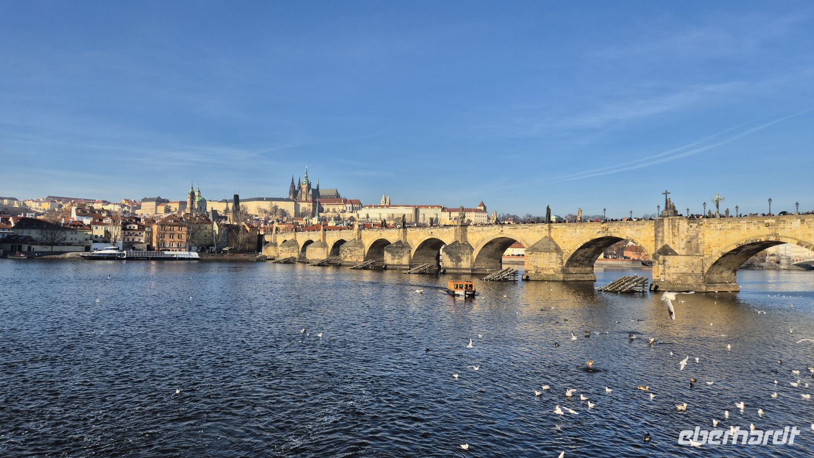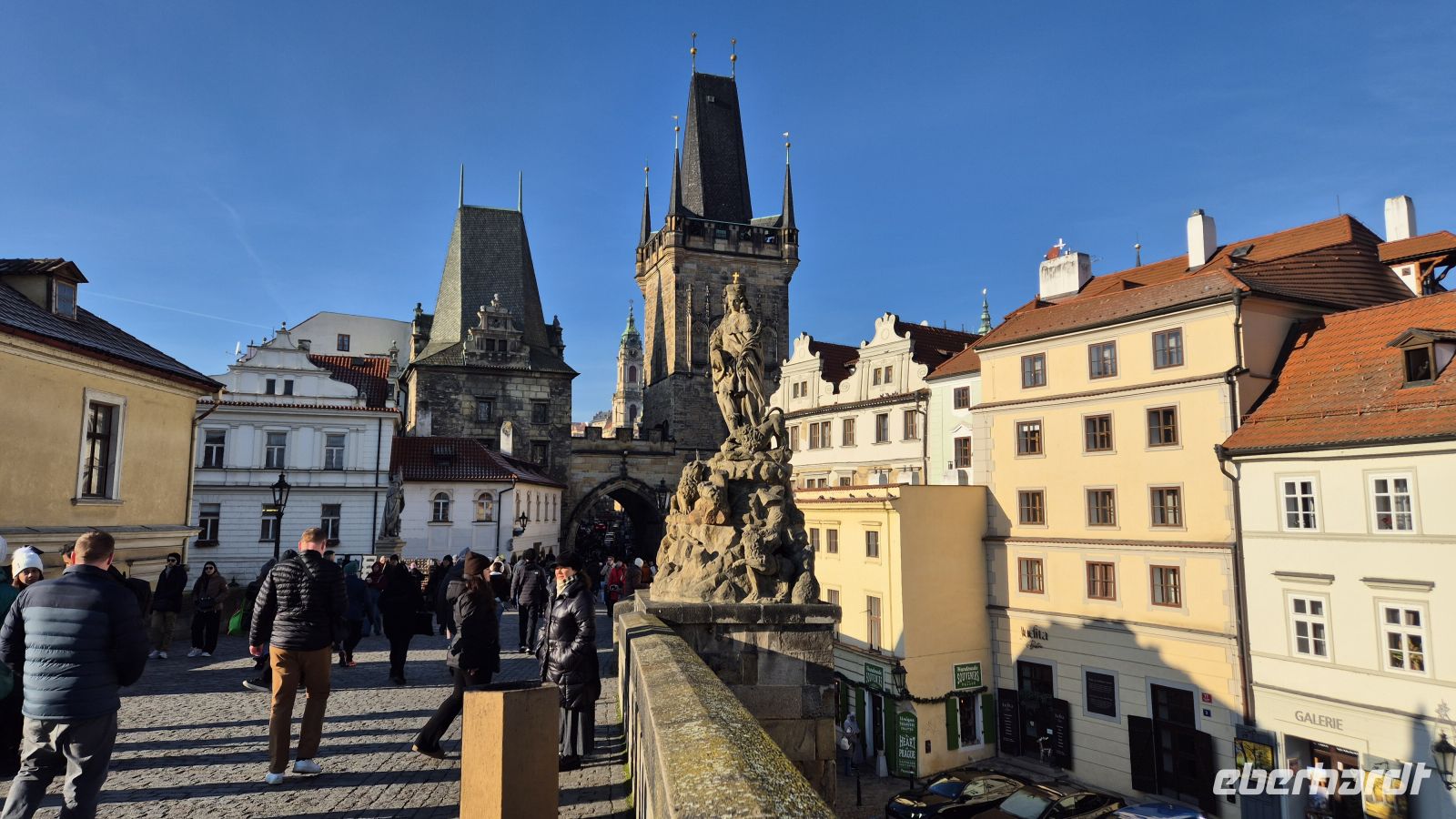 Auf dem Rückweg steht jedoch noch der Besuch in der Hauptstadt Prag auf dem Programm. Die Sonne scheint, blauer Himmel, ein schöner klarer Wintertag. Es geht über den Wenzelsplatz zum Altstädter Ring mit seinem schönen Weihnachtsmarkt. Der Prager Schinken brutzelt über offenem Feuer mitten in der Stadt und verströmt einen verlockenden Duft. Bei schleichendem Fußgängerverkehr lassen wir uns mitziehen durch die engen Gassen zur Karlsbrücke. Menschen, wohin man blickt und tritt. Wie schön ruhig war es da in Brünn und den bezaubernden Orten, die wir besucht haben.