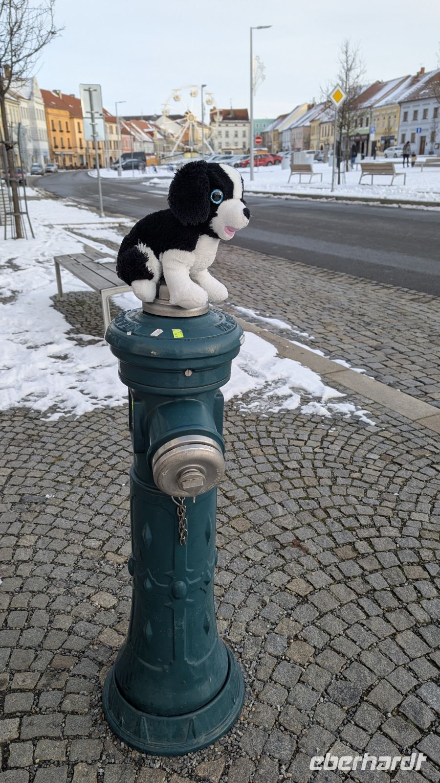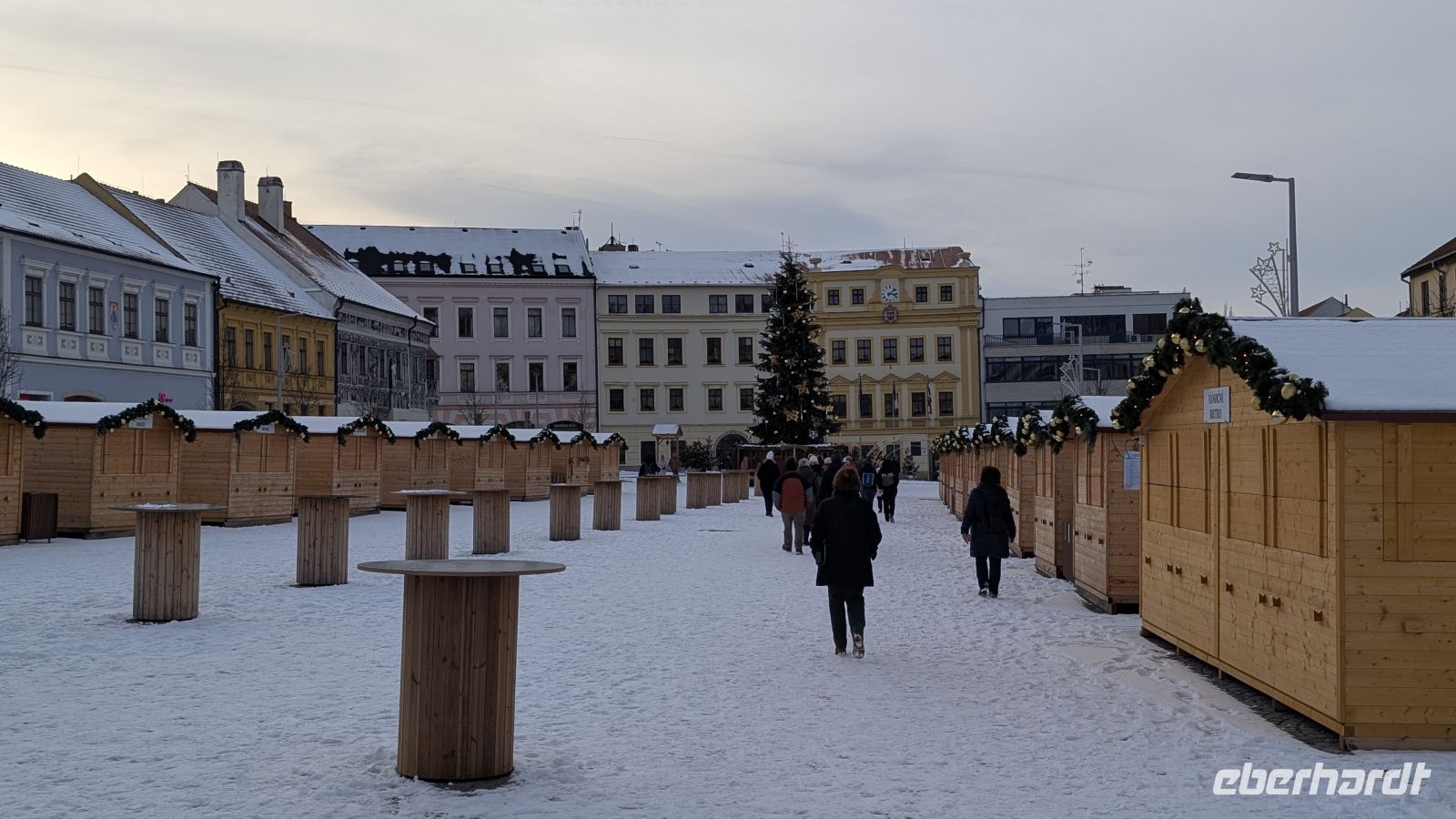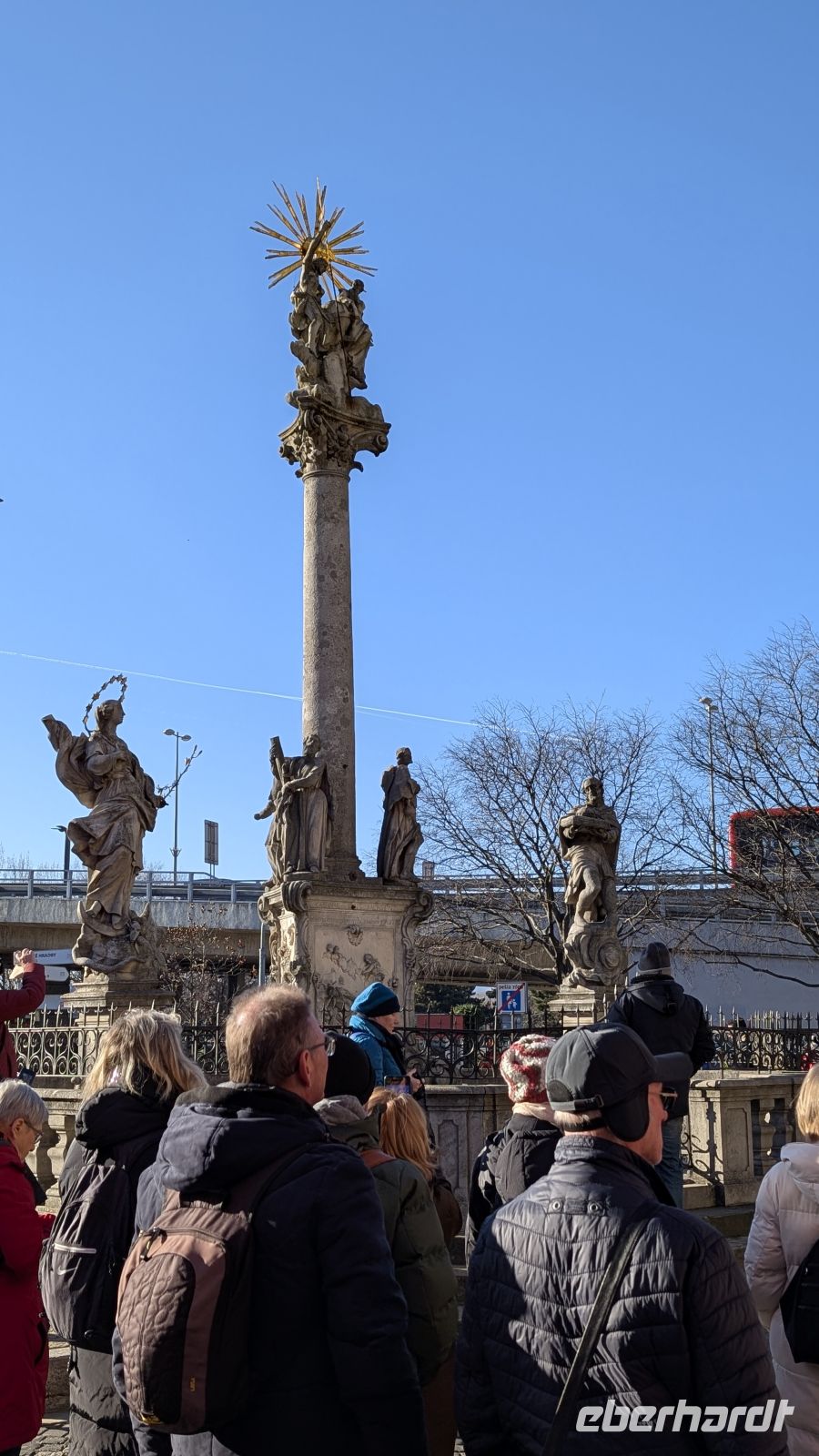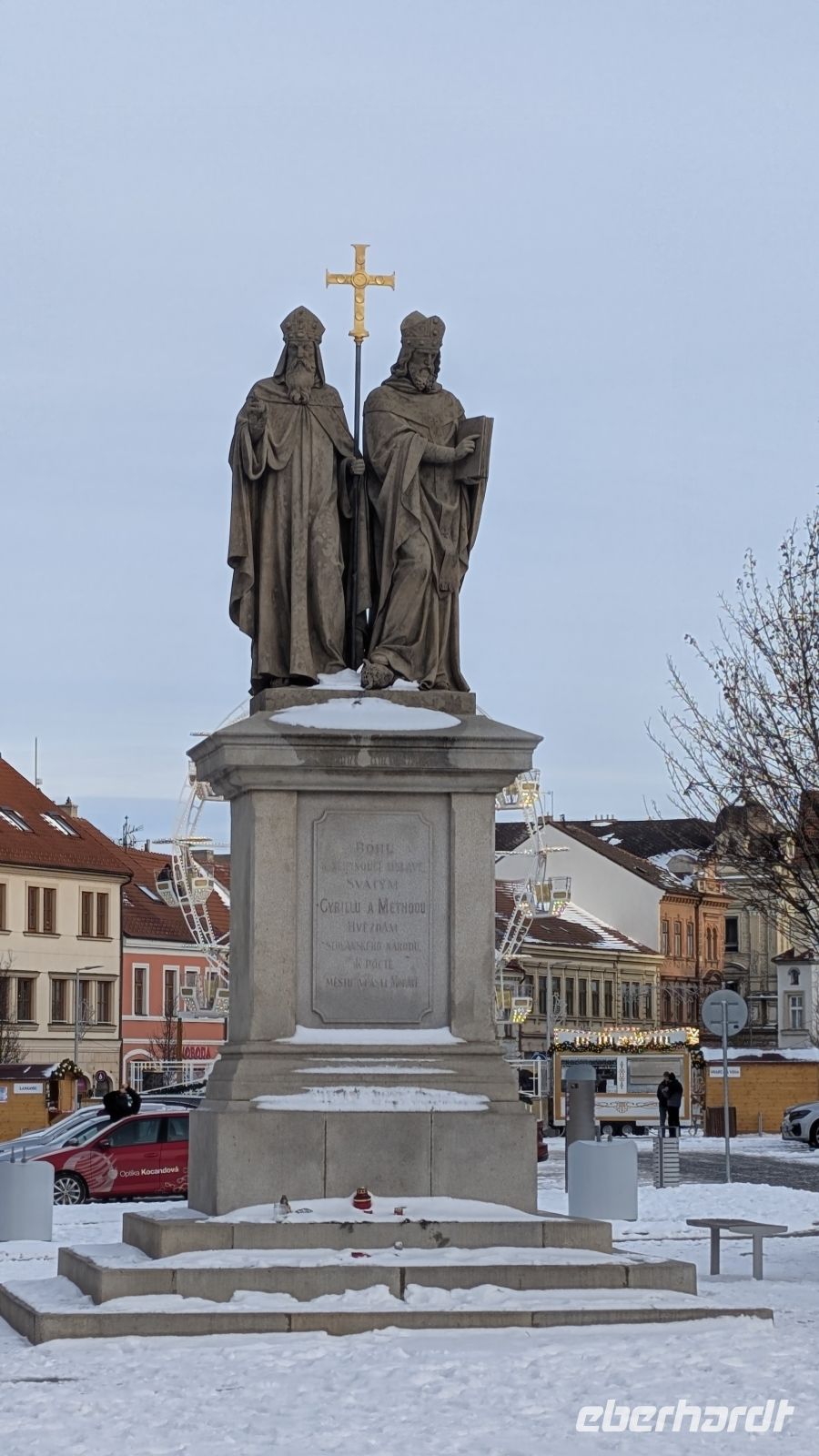 Den Abschluss unseres Rundganges durch das kleine Städtchen, bevor es zurück zum Bus ging, machte der Karlsplatz. Einer der größten Plätze Tschechiens mit 22.000qm. Die verschlossenen Holzbuden waren stumme Zeugen des vergangenen Weihnachtsmarktes. In der Mitte des Platzes, die Statuen der beiden Herren aus Thessaloniki, Kyrill und Method, die Begründer der kyrillischen Sprache und Aposteln des Christentums in Tschechien. Der Fuß von Method ruht auf dem Kopf eines heidnischen Götzen, als Zeichen dafür, dass das Heidentum verbannt wurde.