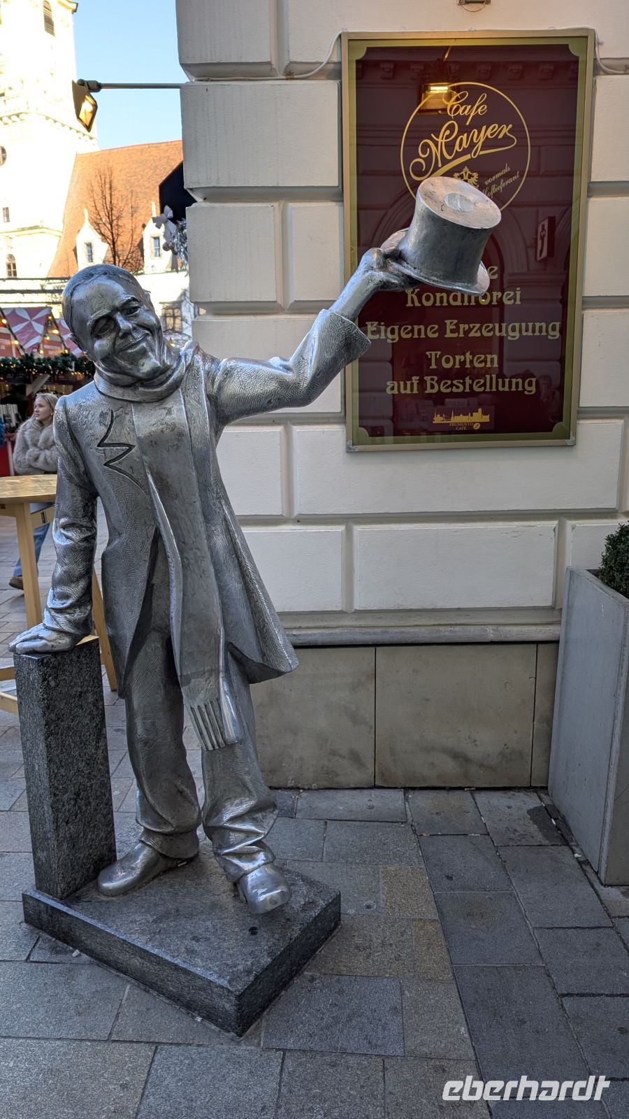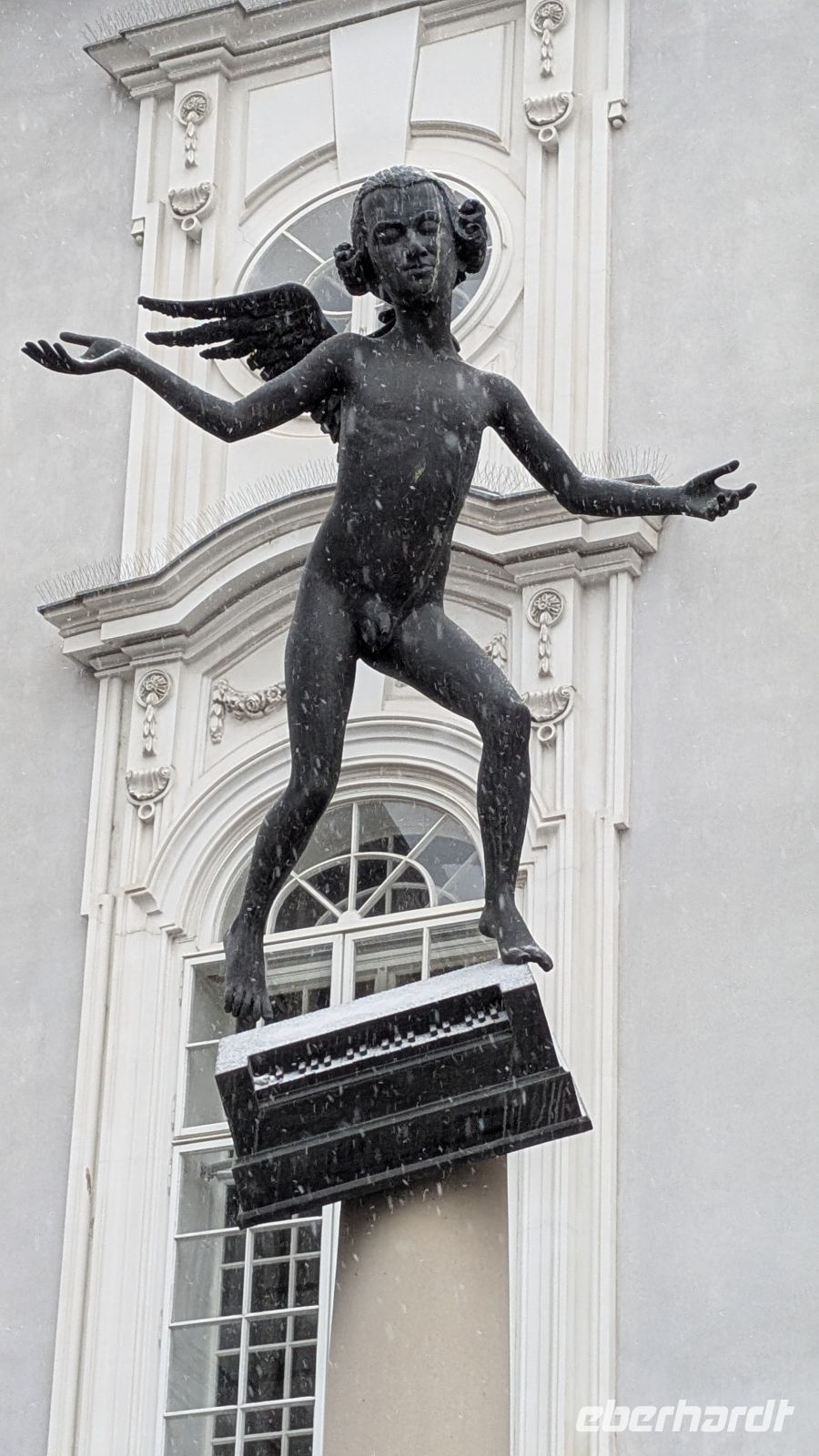Am Krautmarkt empfing uns die Statue des kindlichen Mozart, der hier als 11 jähriger 1767 ein Konzert gab. Das Besondere, die kindliche Gestalt mit Flügeln hat den Kopf des erwachsenen Mozart.