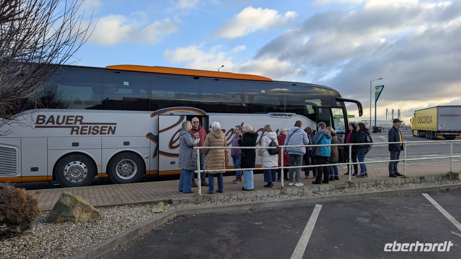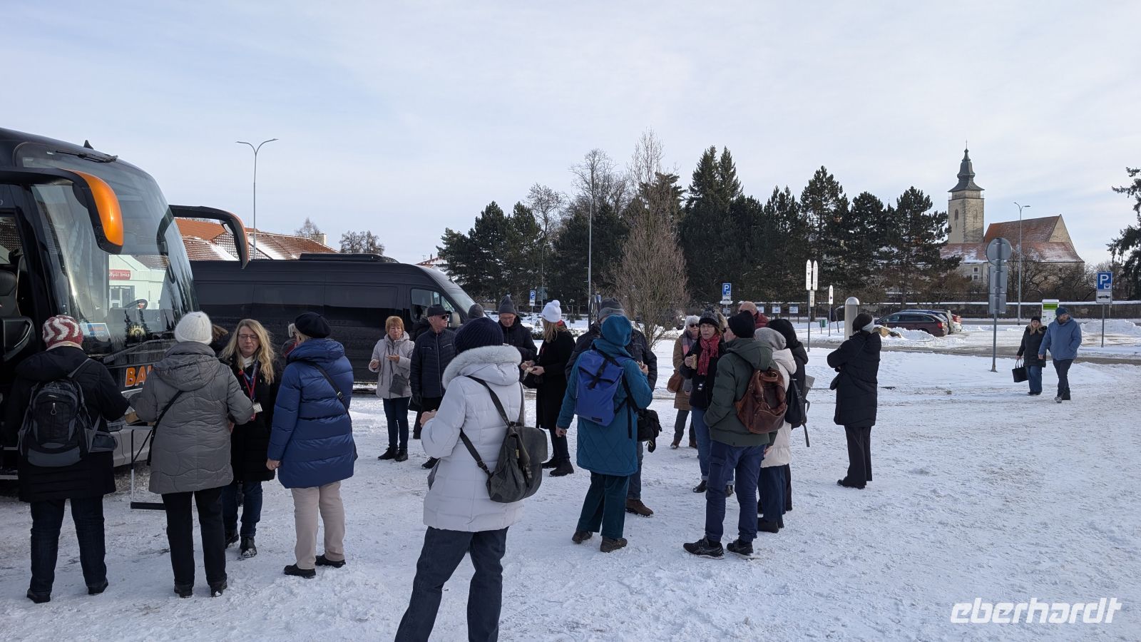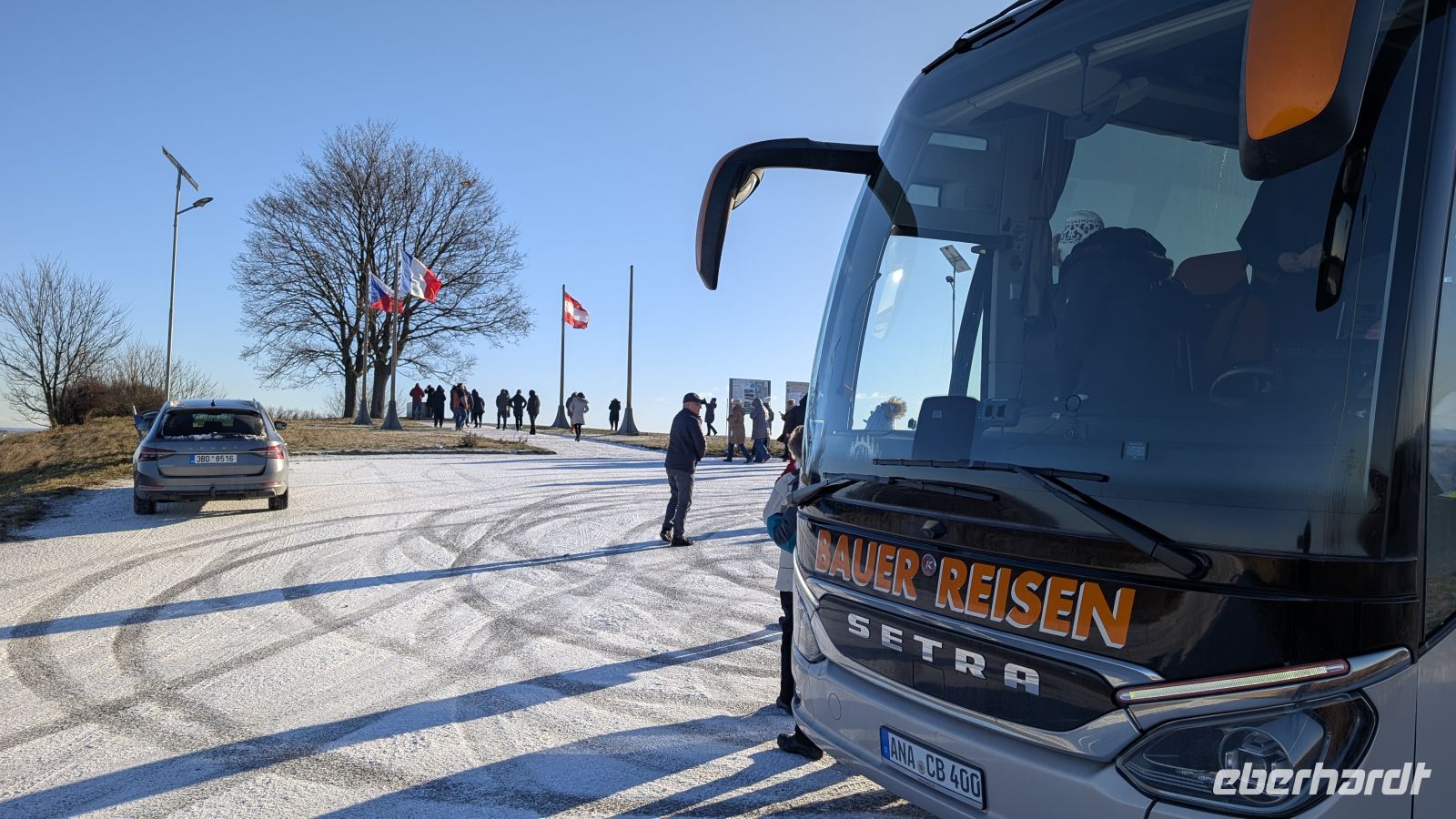 Eisige Kälte in Chemnitz und Umgebung. Unser Bus, der Firma Bauer, kam aus dem Erzgebirge, hoch oben vom Fichtelberg. Große Rutschgefahr, besonders für große, lange und schwere Busse. Gut, dass ich Sven, den Busfahrer, schon von früheren Reisen her kannte und weiß, ich kann mich auf ihn 100%ig verlassen.