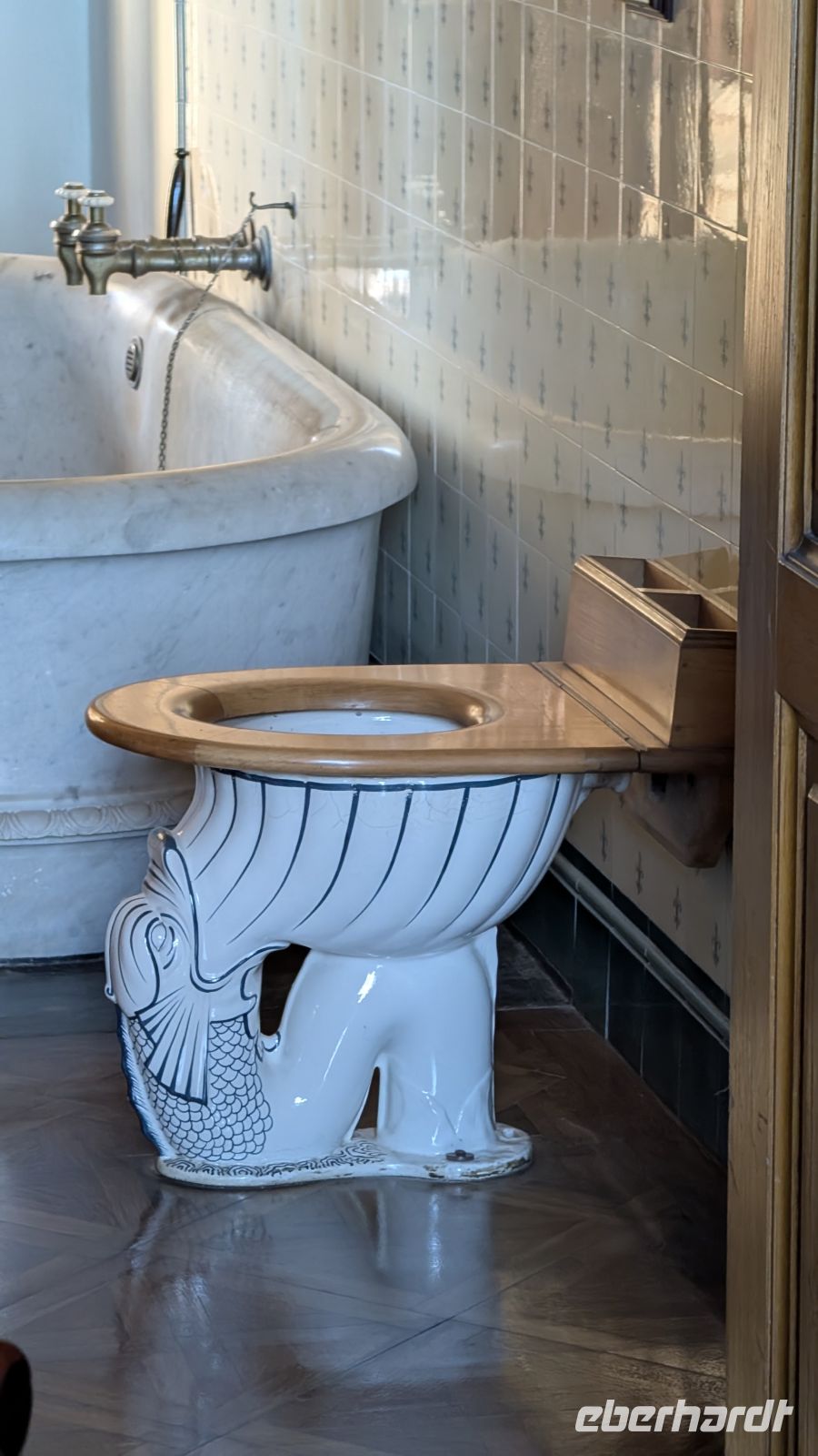 Besonders interessant war die Toilettenschüssel in Form eines sitzenden Fisches, der etwas einzusaugen scheint und daneben gleich die riesige Badewanne aus weißem Marmor.