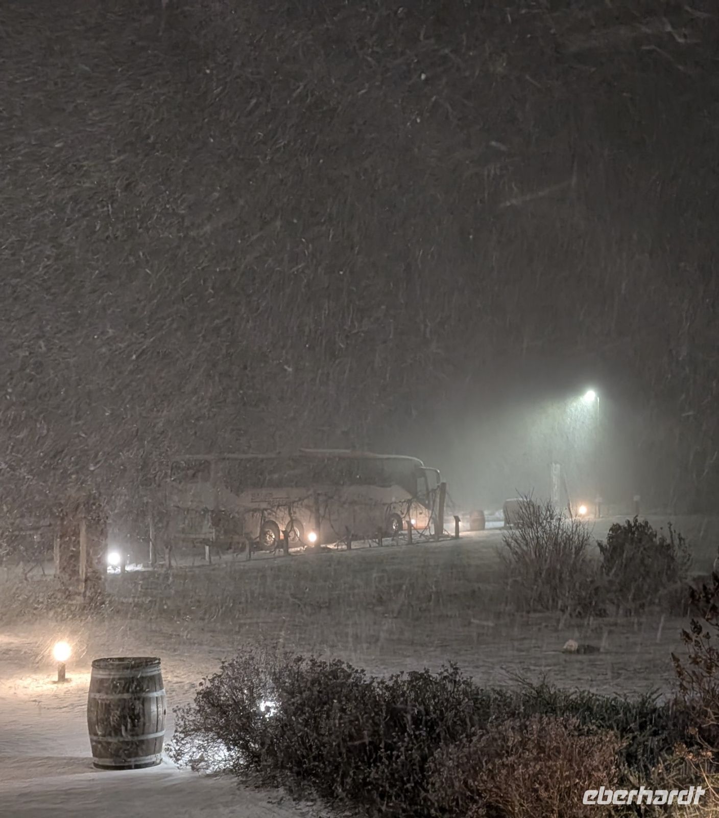 Während wir so friedlich im Lokal saßen und genüsslich unsere Hähnchen aßen, begann es draußen heftig zu schneien und zwar so heftig, dass man den Bus am nahen Parkplatz kaum mehr erkennen konnte. Nach einer guten Viertelstunde war der Schauer dann vorbei, aber die Straße war weiß.