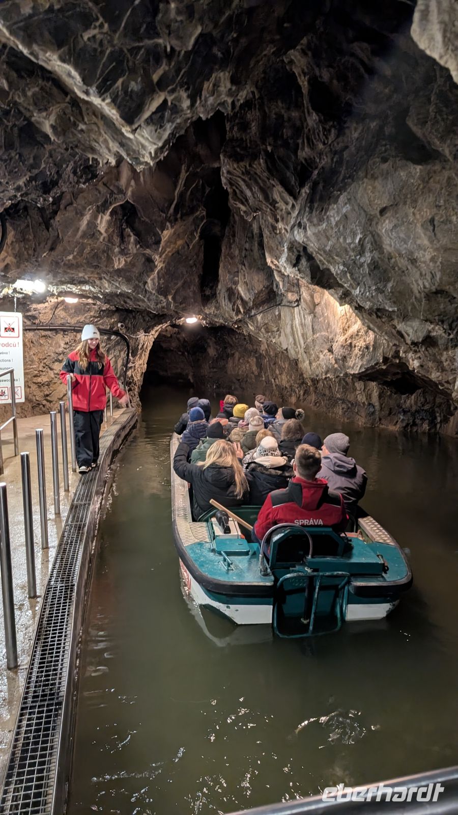 Noch ein paar Stufen hinunter in die geheimnisvolle Tiefe. Leise, kaum spürbar fließt hier der Fluss Punkva durch die dunklen Höhlengänge. Die flachen Aluboote mit Außenborder warteten bereits auf unsere Gruppe und mit 14 bis 16 Personen im Boot startete eine wirklich abenteuerliche und spannende Reise durch die Unterwelt des mährischen Karstes.