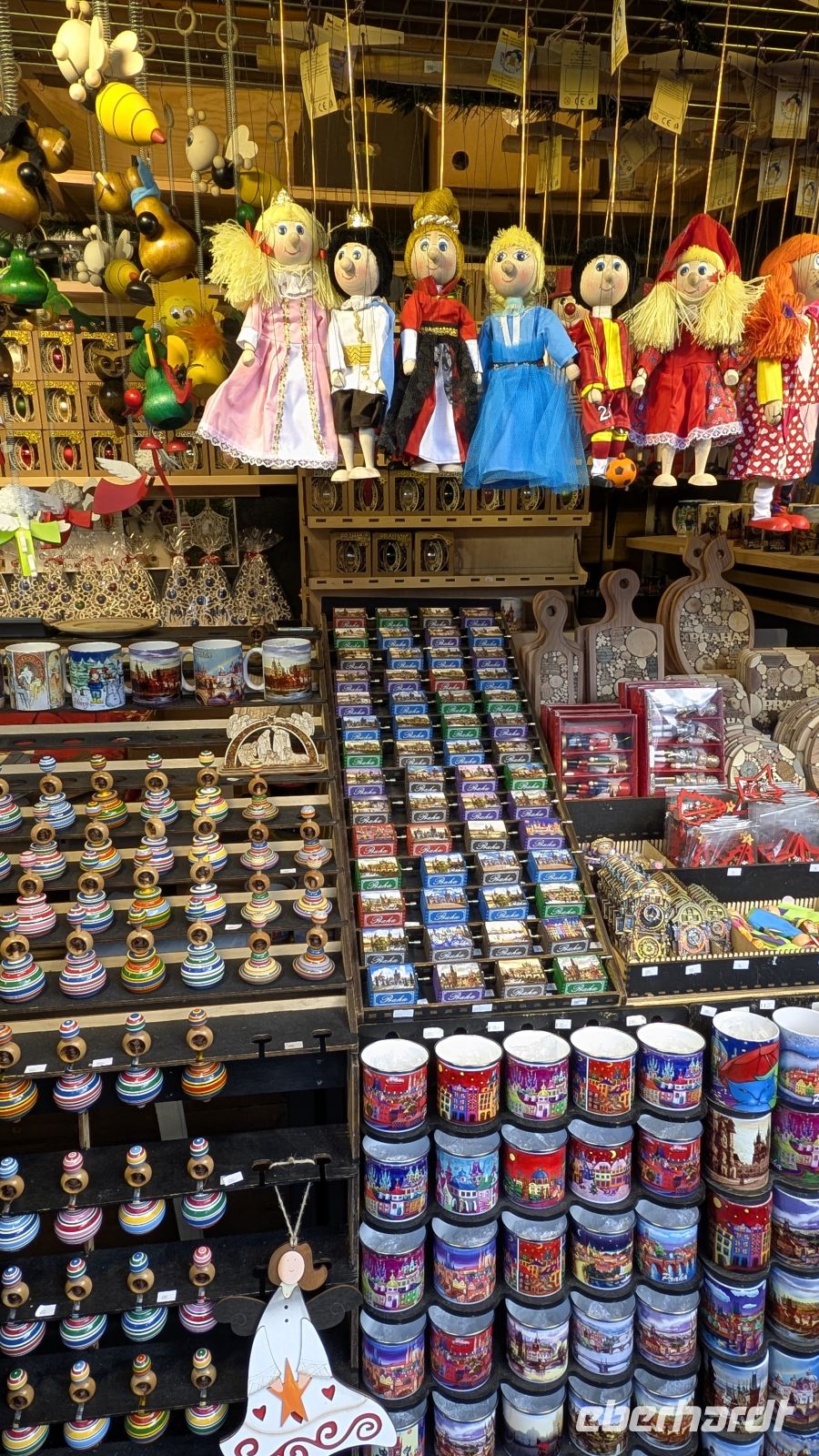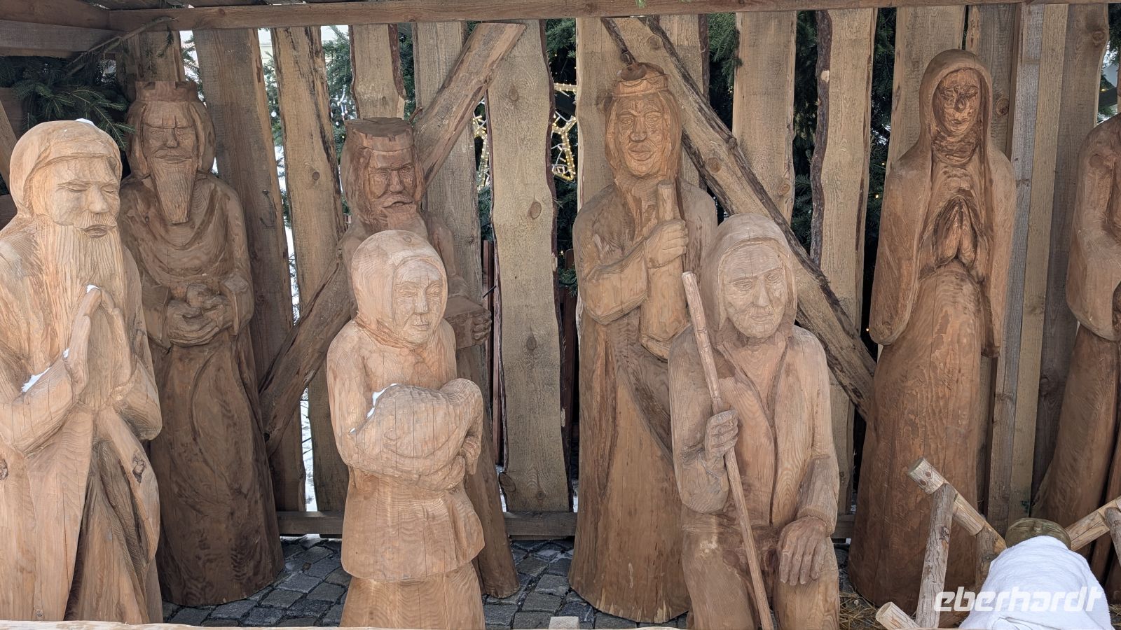 Am Ende des Platzes der Christbaum, darunter eine geschnitzte Weihnachtskrippe mit ausdrucksstarken Gesichtern, die fast lebendig wirkten. Mir ist aufgefallen, dass unter der Vielzahl der Heiligen 3 Könige, die man gewöhnlich in Krippen sieht, diese 3 Könige die Einzigen sind, die ein Lächeln auf den Lippen haben und sich freuen, den Erlöser der Welt gefunden zu haben. Achtet mal darauf, denn die meisten der 3 Könige haben einen eher traurigen Gesichtsausdruck.