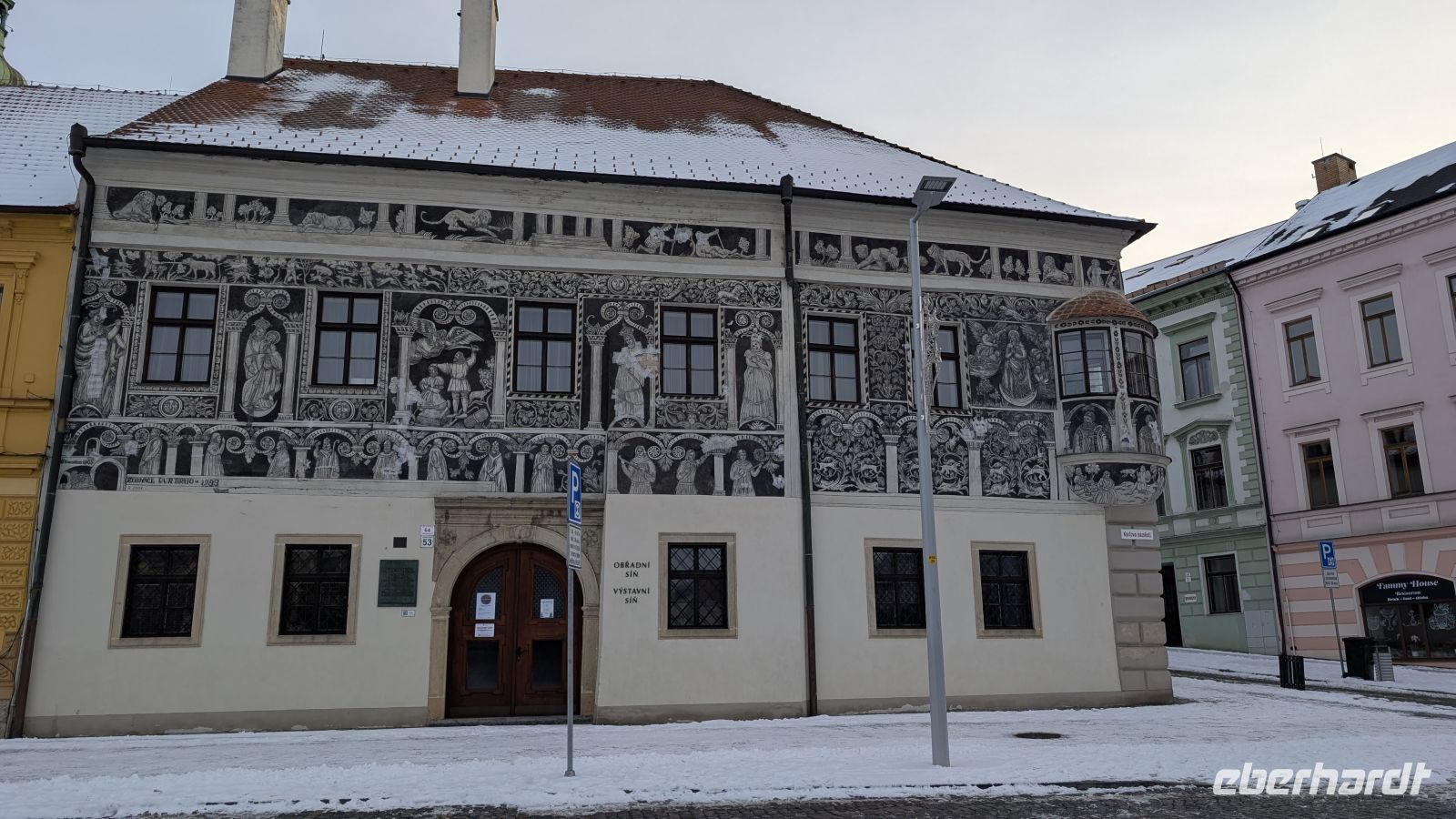Große Bewunderung fand auch das Schwarze Haus, ebenfalls am Ende des Karlsplatzes zu finden, durch die aufwändige Sgraffitiverziehrung.