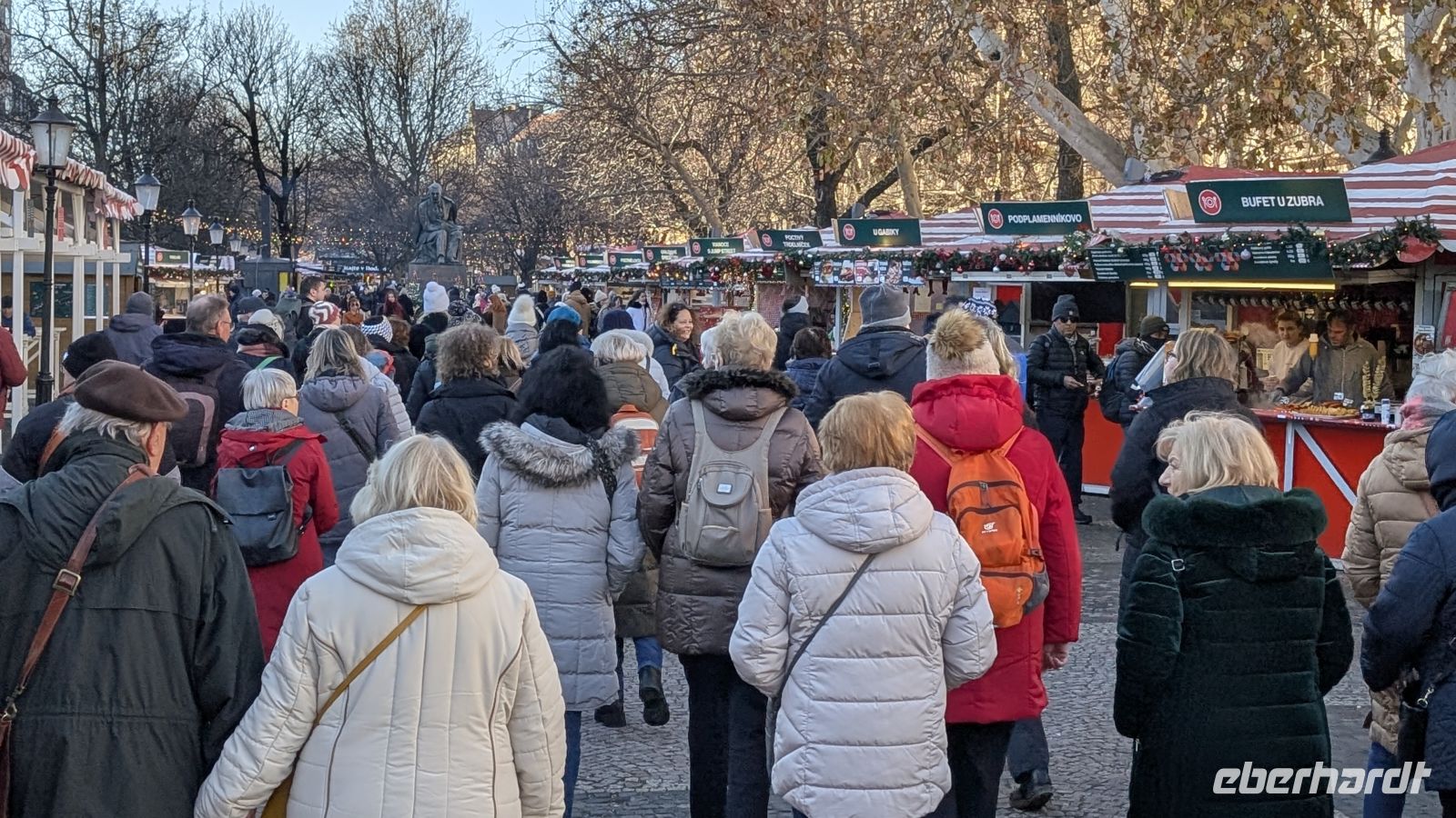 Der Duft von Glühwein, geräucherter Schinken über Holzfeuer und anderen Spezialitäten begleiteten uns hinüber zur Pestsäule, vorbei am der Statue von Hans Christian Anderson und dem „Denkmal des Alkohols“.