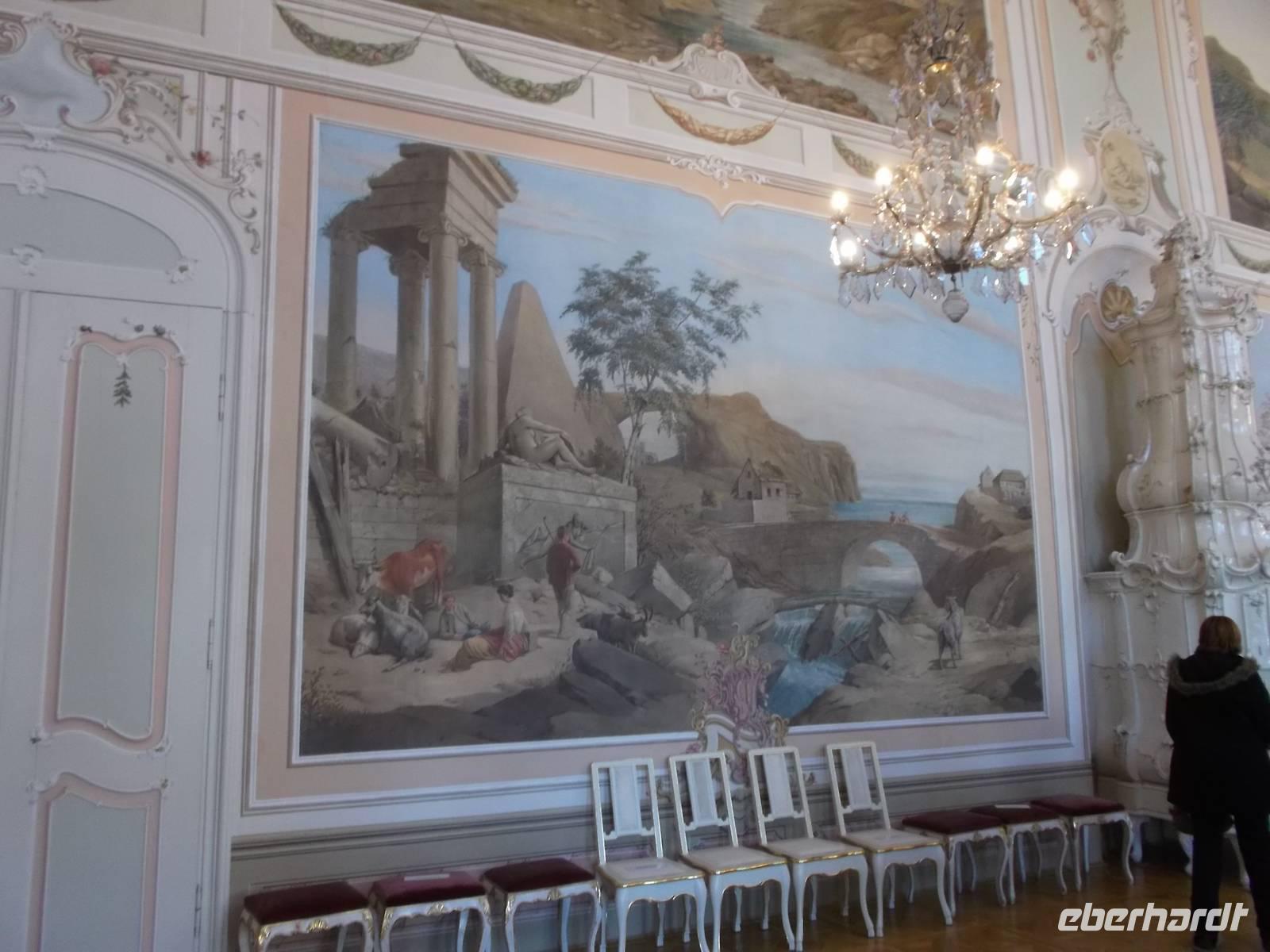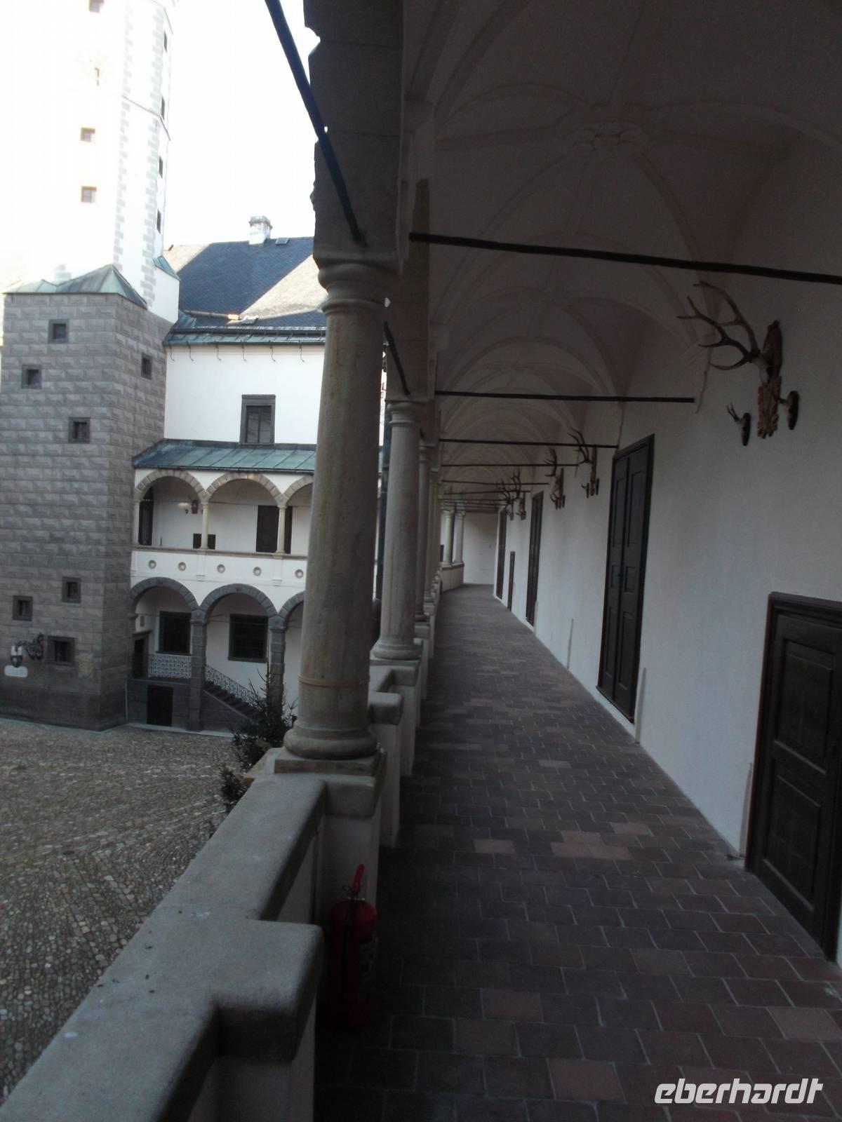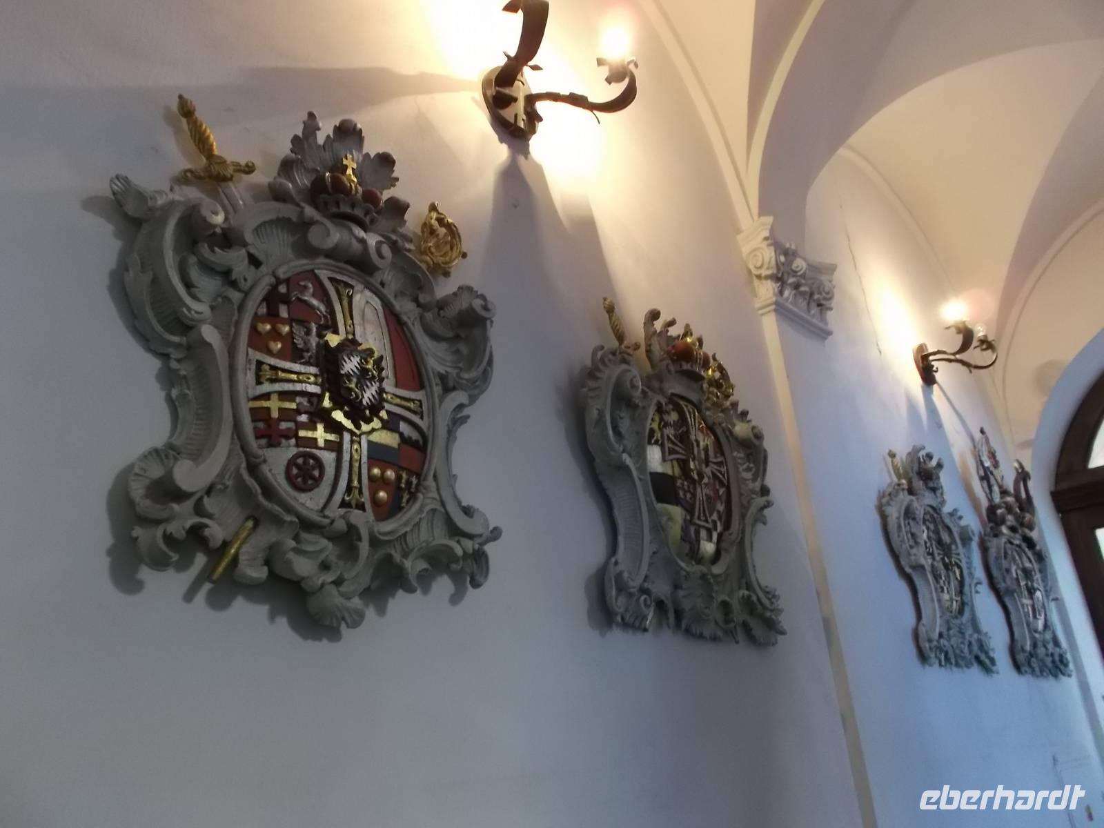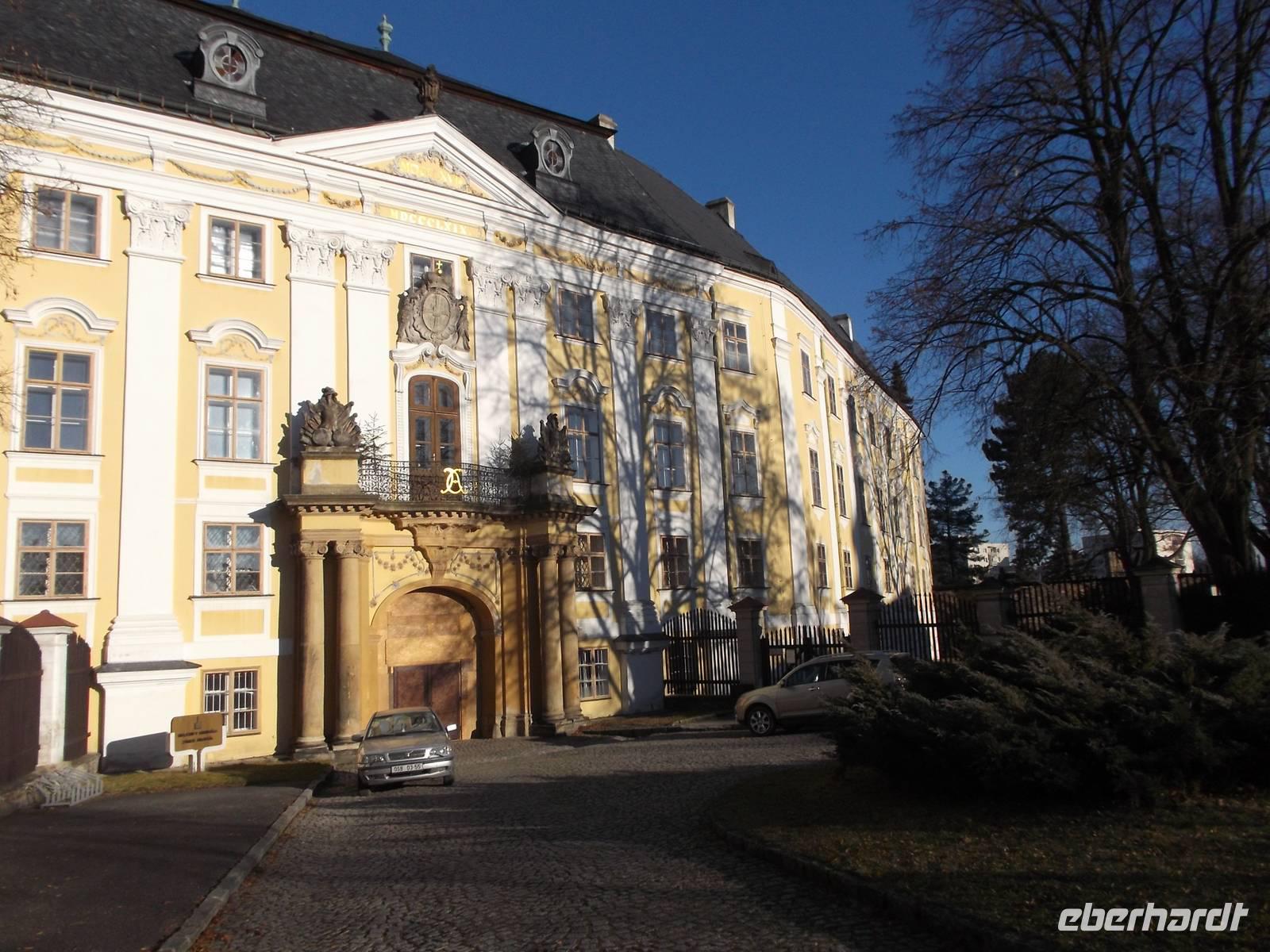 Nach dem Frühstück brachen wir auf zu einem Ausflug ins Altvatergebirge. Dieser Ausläufer der Ostdudeten, der dem bekannteren Riesengebirge ähnelt, hat mehr als 50 Gipfel, die die Höhenmarke von tausend Metern überschreiten. An seiner Westseite liegt der Ort Bruntál, mit deutschem Namen Freudenthal. Das kleine Bezirksstädtchen, das zu den ältesten Böhmischen Königsstädten zählt und damit früher unmittelbar der Zentralmacht unterstellt war, hat als besondere Sehenswürdigkeit ein Schloss zu bieten, dessen heutiges Ambiente auf seine ungewöhnliche Geschichte zurückgeht. Ursprünglich als gotische Wohnburg erbaut und in der Renaissance „modernisiert", wurde es in den Wirren des 30jährigen Krieges seinen Besitzern weggenommen und dem Deutschen Ritterorden übergeben, um fortan als Ordensmeistersitz zu dienen. Die Ordensherren ließen die Anlage im 18. Jh. barock und repräsentativ aus- und umbauen und noch heute erinnern Arbeits-, Repräsentations- und Versammlungsräume an die Nachfolger der zur Zeit der Kreuzzüge gegründeten Ordensrittergemeinschaft. Bei der Führung durch die zahlreichen gut ausgestatteten und renovierten Räumlichkeiten der großen Schlossanlage, die auf dem Grundriss eines Kreissegments errichtet wurde, entdeckten wir vieles, was an den Orden und seine Geschichte erinnerte - nicht nur Porträts der diversen Ordensmeister, von denen viele aus dem Haus Habsburg stammten, sondern auch Arbeits- und Versammlungsräume, Historiengemälde und vieles andere, was die besondere Atmosphäre eines solchen Ordenssitzes schuf.