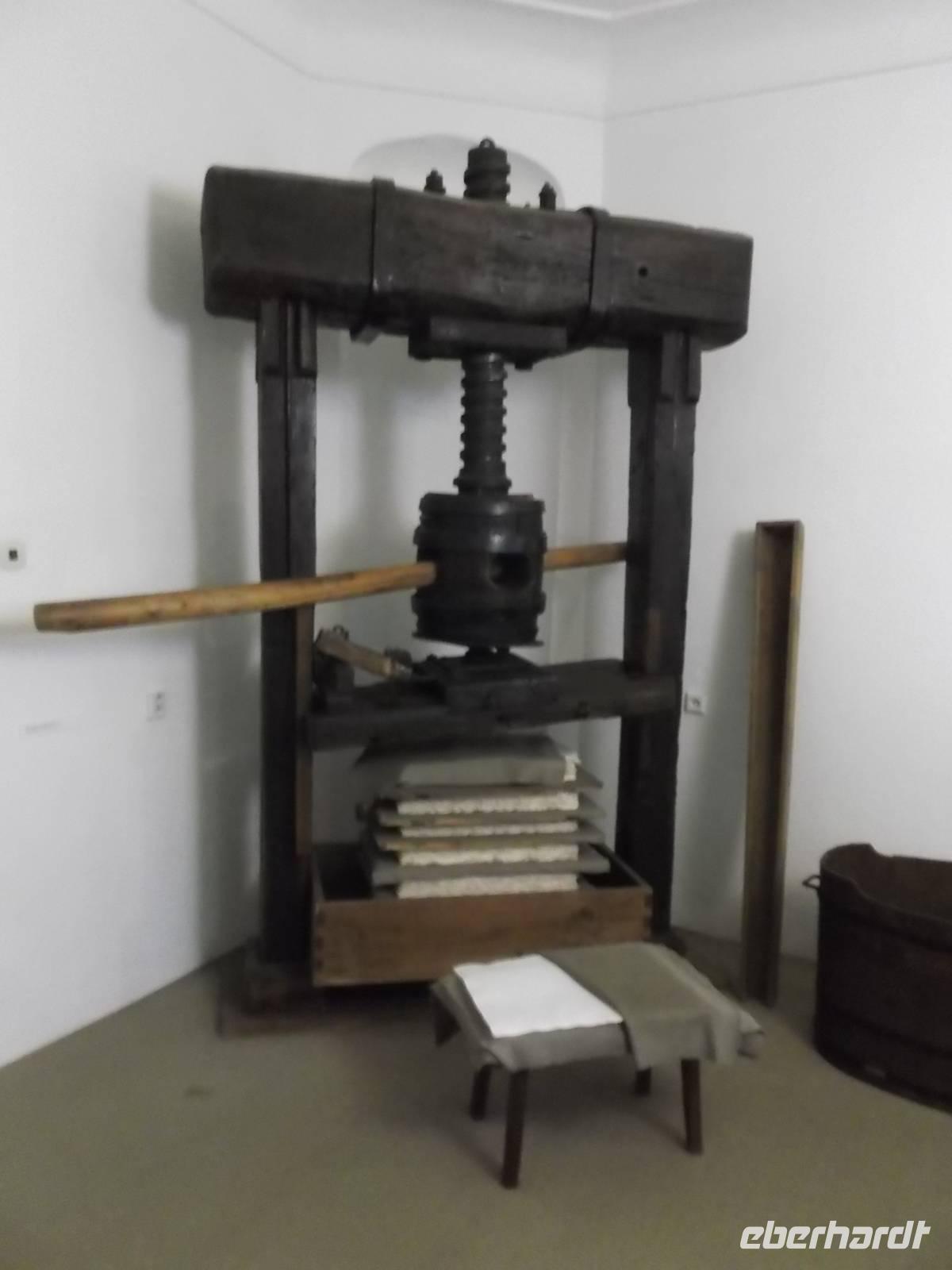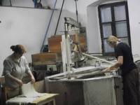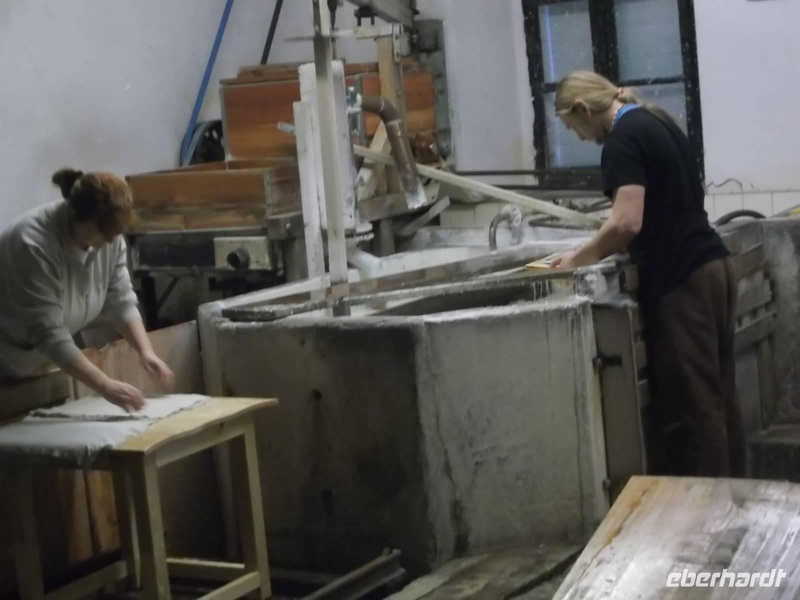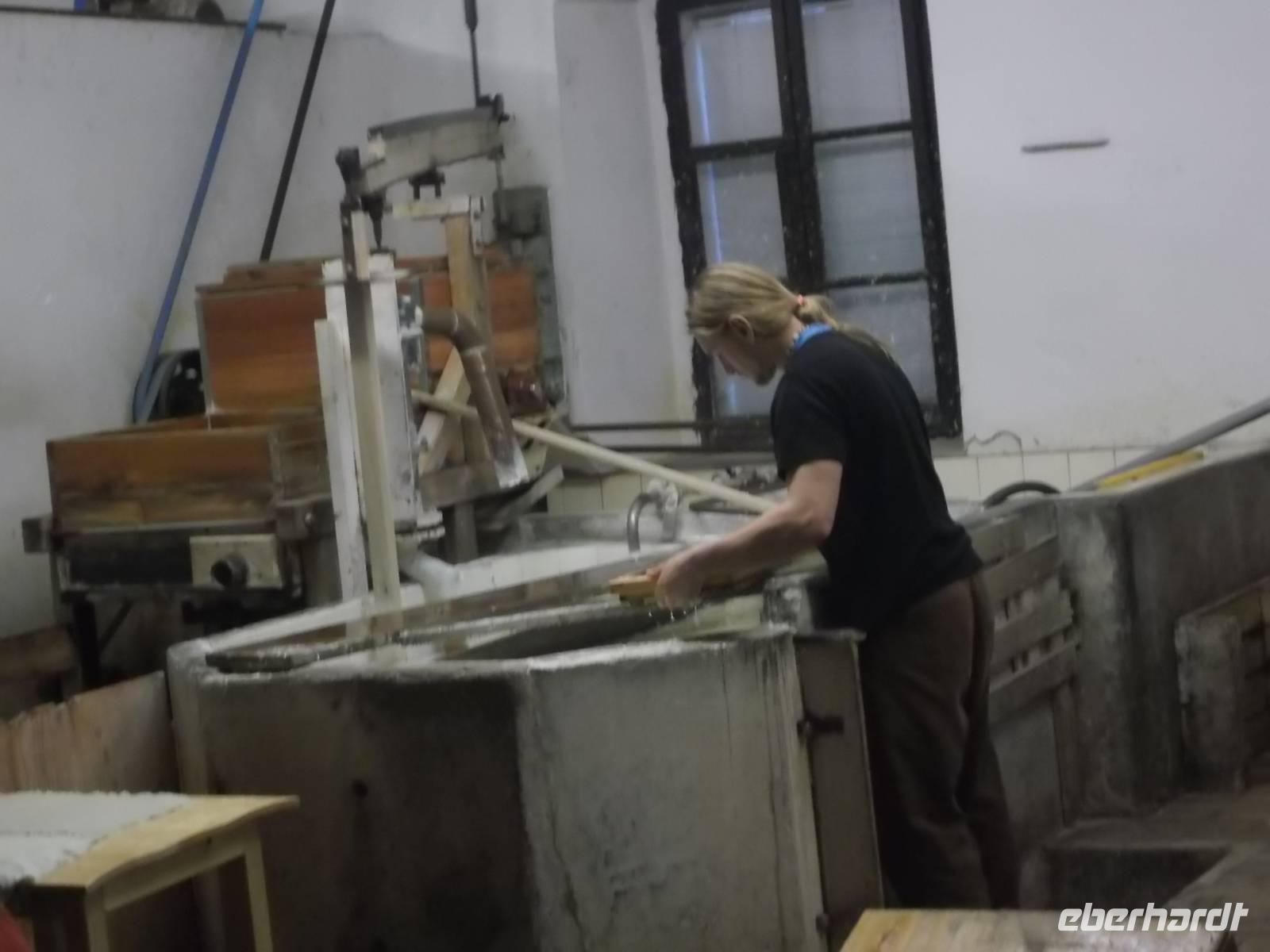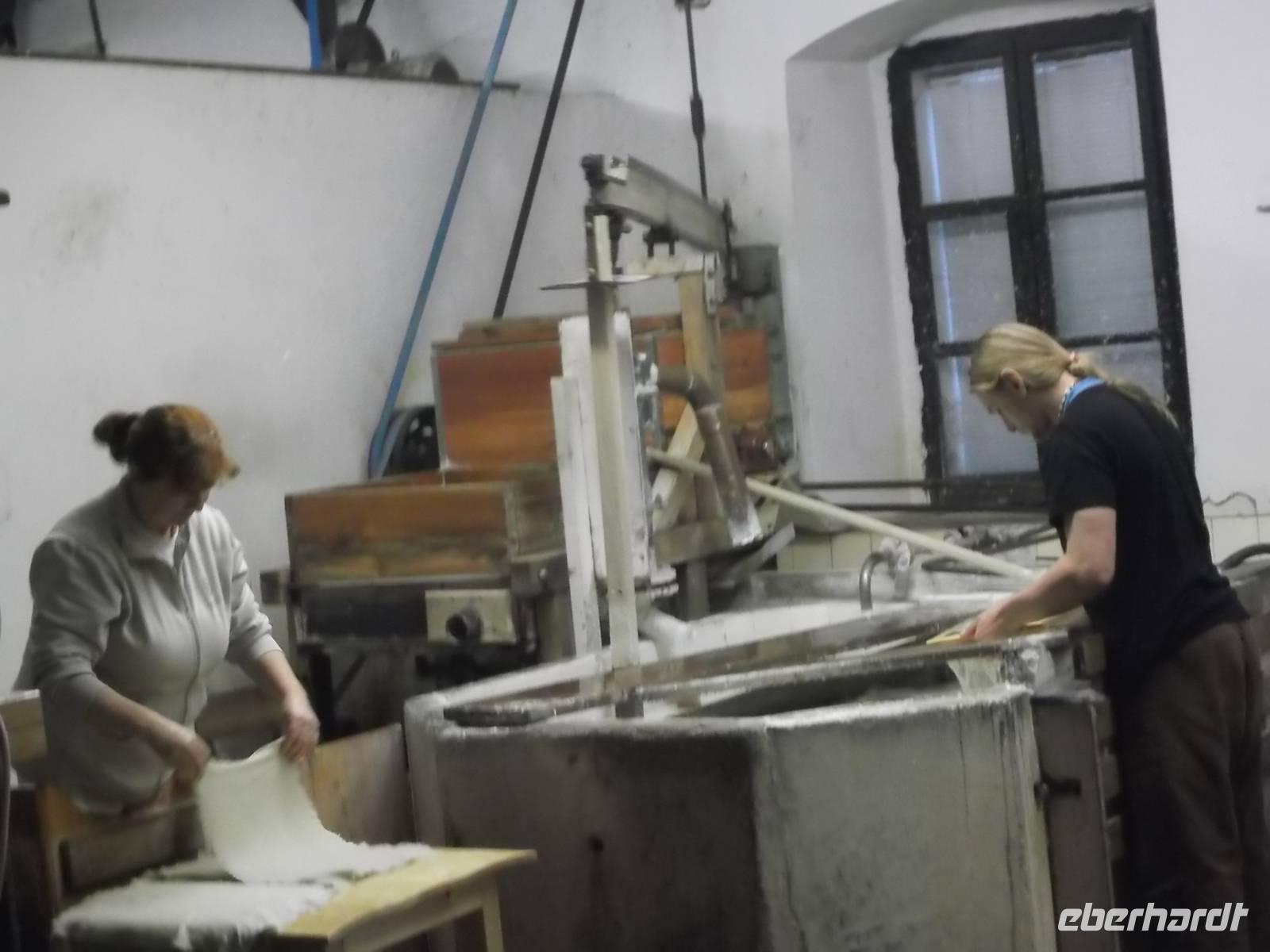 Ein weiterer Höhepunkt des Tages war die Weiterfahrt durch das Altvatergebirge, die uns in den Ort Velké Losiny (Groß Ullersdorf) führte. In der Geschichte ist der von einem großen Schloss - leider derzeit in Restaurierung befindlich - beherrschte Ort durch zwei Dinge bekannt: eher unrühmlich für seine gewalttätigen Hexenprozesse in der zweiten Hälfte des 16. Jh. und durch eine der ältesten noch arbeitenden Papiermanufakturen Mitteleuropas. Auf dem handgeschöpften Büttenpapier der Papiermühle von Velké Losiny sind schon viele bedeutende Verträge niedergelegt worden. Wir konnten uns im Museum der seit dem Ende des 16. Jh. bestehenden Manufaktur Vieles zur Geschichte und Bedeutung der Papierherstellung ansehen und dann auch in der Werkstatt den tatsächlichen Vorgang der Handschöpfung von Papier beobachten.