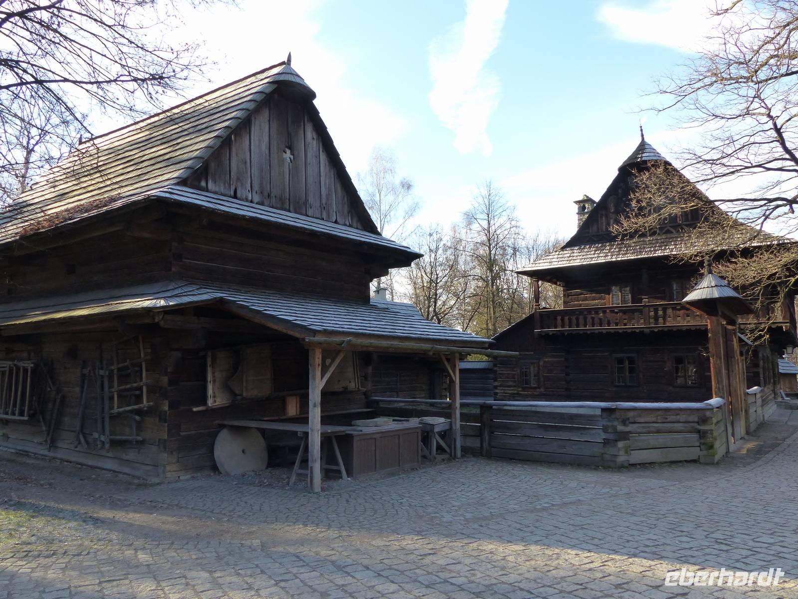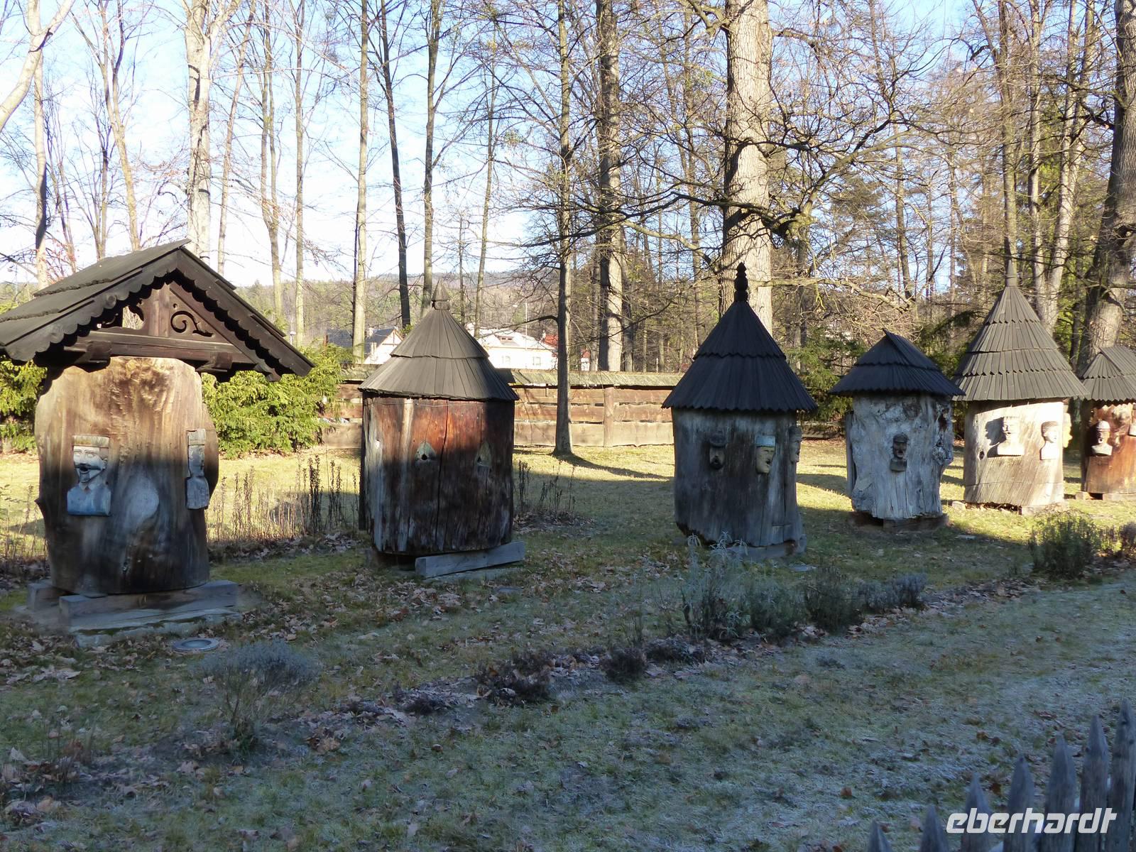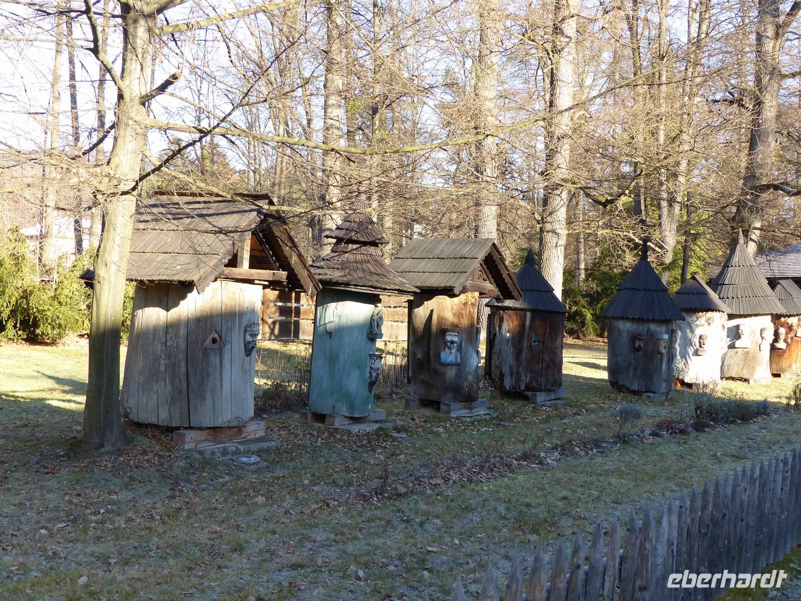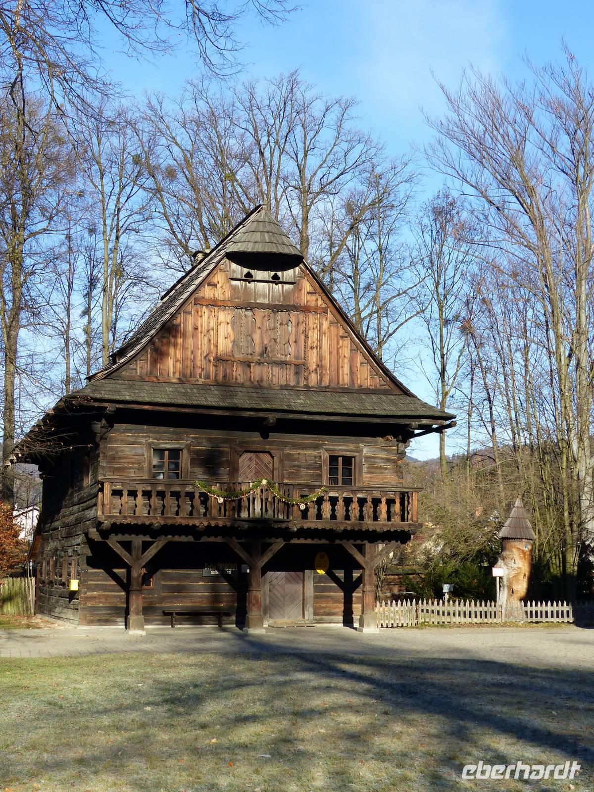 Ein Ausflug in die Mährisch-Schlesischen Beskiden oder Westbeskiden, wie die letzten Ausläufer der Westkarpaten in einem noch populären, aber veraltendem Ausdruck genannt werden, stand auf dem heutigen Tagesprogramm. Etwa eineinhalb Busstunden von Olomouc entfernt und nur wenig mehr als 20 km westlich der Grenze zur Slowakei, liegt das Städtchen Rožnov pod Radhoštem (deutsch = Rosenau unter dem Radhoscht). Rožnov war ursprünglich ein Luftkurort des 19. Jh., bekannt für sonniges Wetter und trockene Bergluft, bis ihn in den 50er Jahren des 20. Jh. die Errichtung von Industrie diesen Status kostete. Heute ist das Städtchen hingegen weithin bekannt für sein einzigartiges Freilichtmuseum. Hier liegt das Zentrum der Mährischen Walachei, jenes böhmisch-mährischen Gebietes, in das vor allem im späten Mittelalter Menschen vorwiegend rumänischer Herkunft und Sprecher balkanromanischer Dialekte eingewandert sind. Die Siedler wurden zwar in die slawischstämmige Bevölkerungsmehrheit integriert, haben sich aber bis heute große Eigenständigkeit in Sprache, Sitten und Bräuchen, vor allem aber in Trachten und Architektur bewahrt. Ein ganz besonderes Kleinod stellt das überwiegend im Stadtpark von Rožnov liegende Walachische Freilichtmuseum dar, in dem Alltags-Gegenstände und Besonderheiten der regionalen walachischen Volkskultur und des Handwerks zu sehen sind. Schon in einer Völkerkundlichen Ausstellung in Prag Ende des 19. Jh. hatte es ein kurzzeitig aufgebautes walachisches Museumsdorf gegeben, aber der erste Weltkrieg hatte den Aufbau eines ständigen Volkskunde und Volkskunst-Museums verhindert. Nach 1925 trug man dann Wohnhäuser, ein Gasthaus und schließlich vom Abriss bedrohte, aber erhalten gebliebene Holzhäuser aus hiesigen Städten und Dörfern. Schließlich wurden Holzbauten vom Rožnover Marktplatz und auch eine der heiligen Anna gewidmete Holzkirche hierher gebracht und wieder aufgebaut, so dass der Eindruck eines völlig intakten Dorfes entsteht. Wir besichtigten einige der mit verschiedensten Möbeln und Gebrauchsgegenständen eingerichteten Häuser und lernten vieles über das tägliche Leben der Walachen. In der anschließenden Freizeit konnten wir die ungewöhnlichen historischen Bienenstöcke der Freilichtausstellung bewundern, die anderen Holzbauwerke ansehen oder auch gemütlich einen heißen Honigwein oder Glühwein trinken, der auf der Terrasse der Museumsgaststätte bei kaltem, aber herrlichen Sonnenwetter feilgeboten wurde.