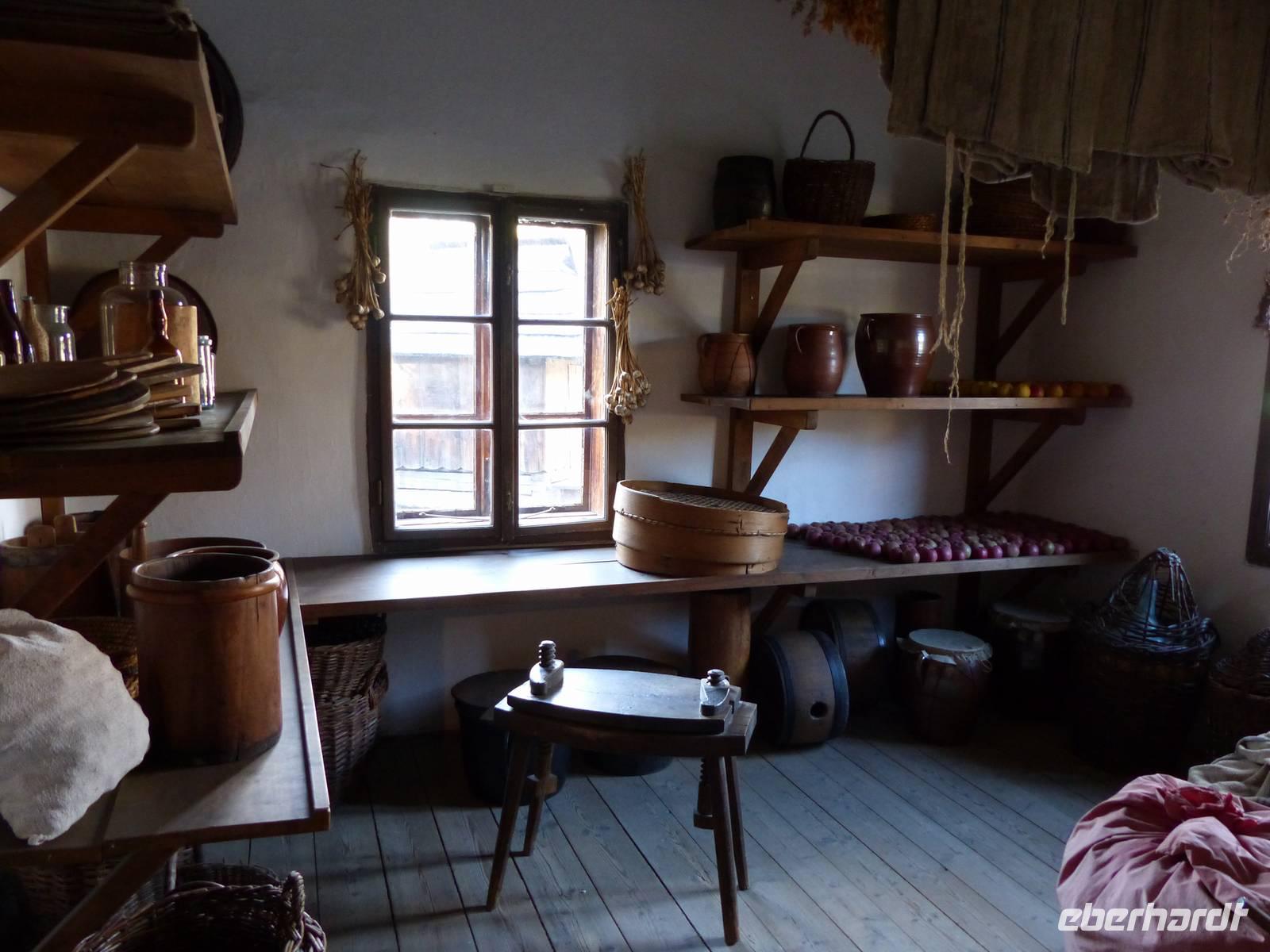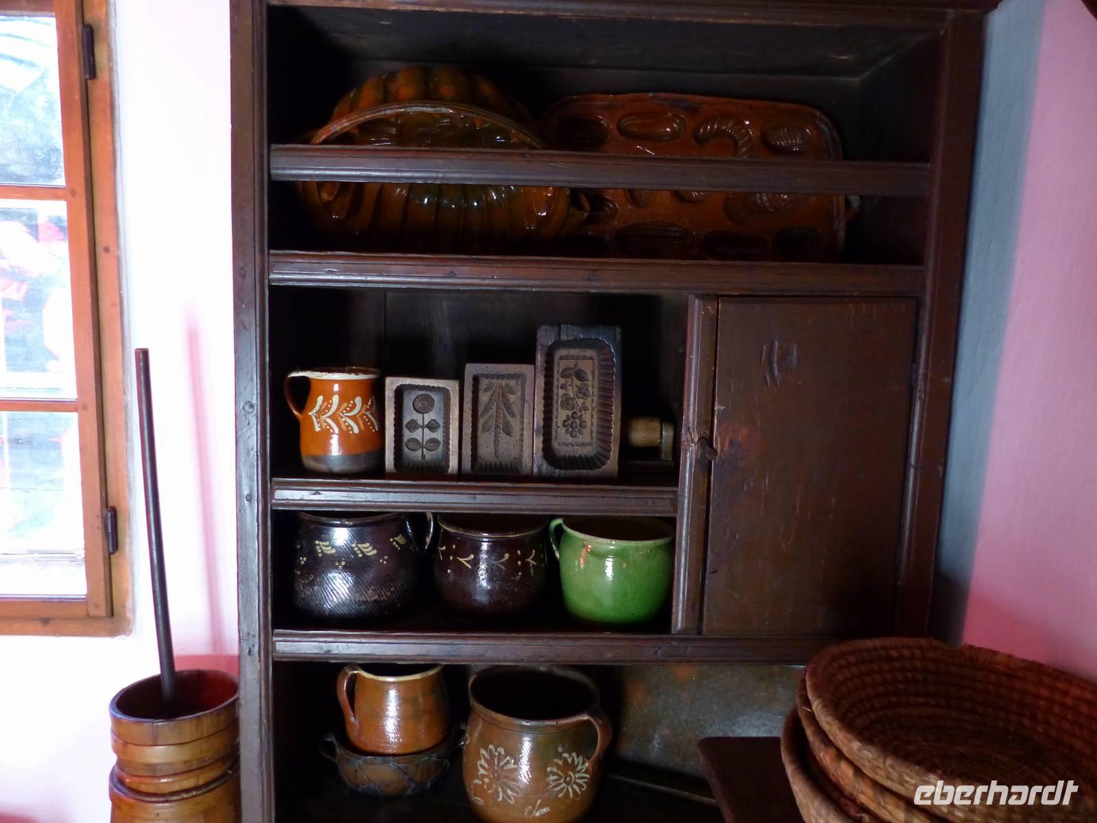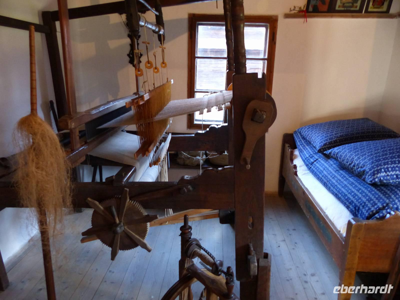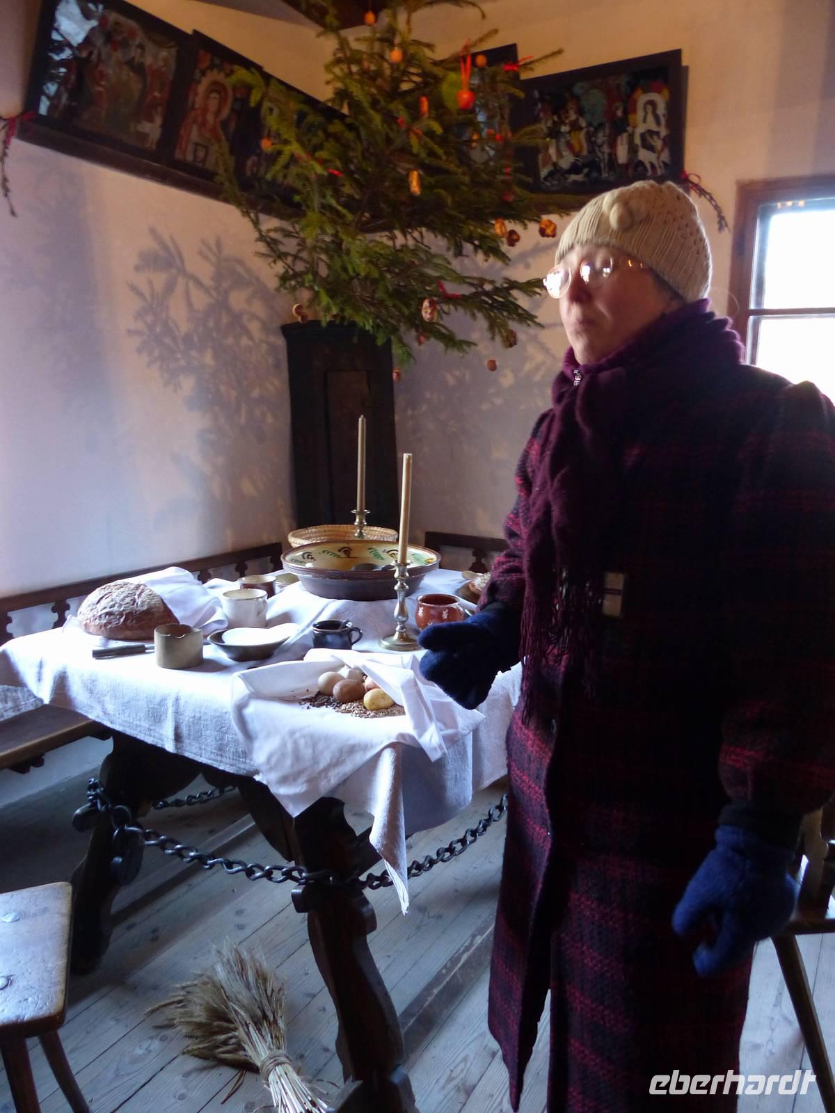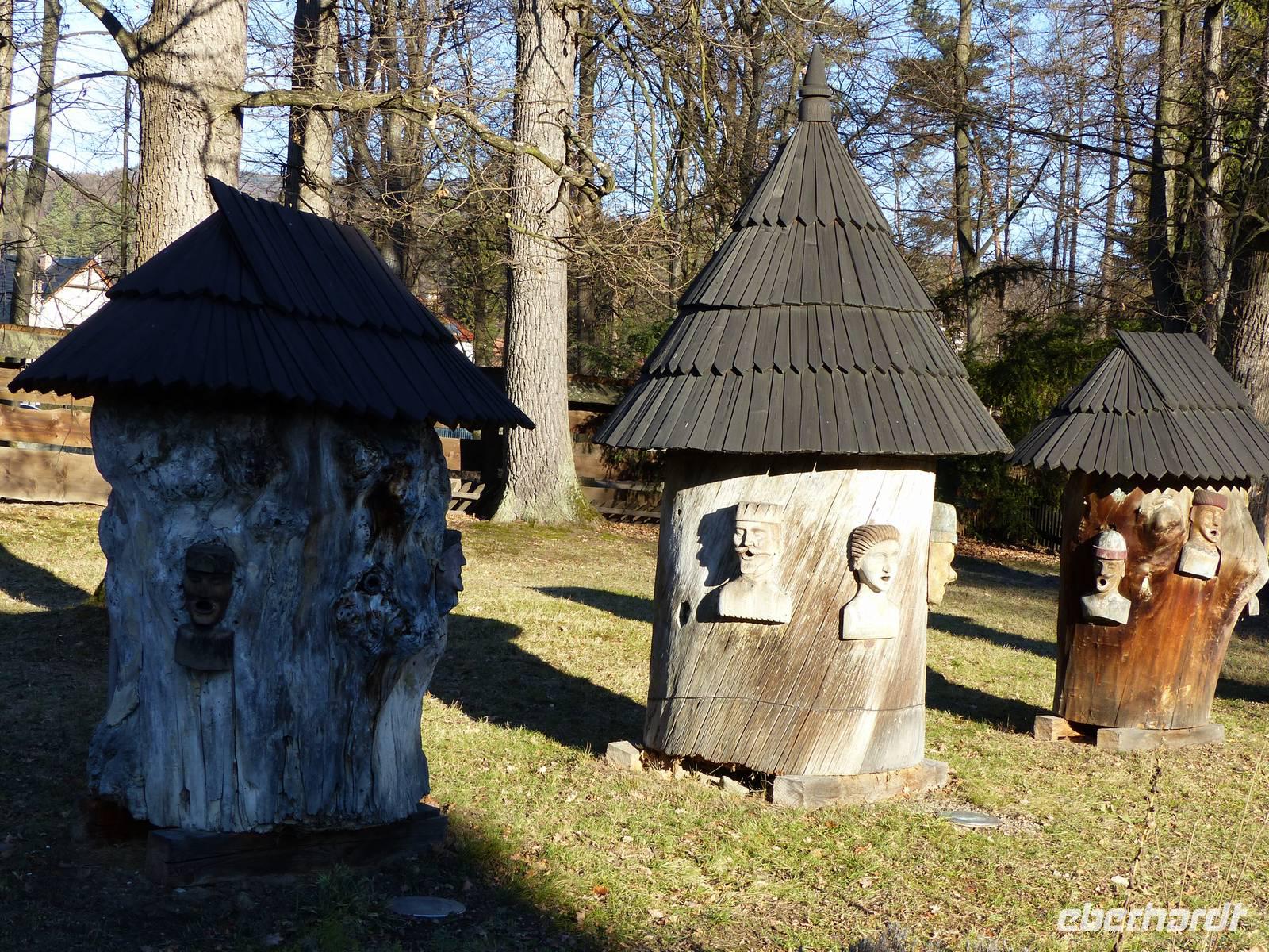 Ein Ausflug in die Mährisch-Schlesischen Beskiden oder Westbeskiden, wie die letzten Ausläufer der Westkarpaten in einem noch populären, aber veraltendem Ausdruck genannt werden, stand auf dem heutigen Tagesprogramm. Etwa eineinhalb Busstunden von Olomouc entfernt und nur wenig mehr als 20 km westlich der Grenze zur Slowakei, liegt das Städtchen Rožnov pod Radhoštem (deutsch = Rosenau unter dem Radhoscht). Rožnov war ursprünglich ein Luftkurort des 19. Jh., bekannt für sonniges Wetter und trockene Bergluft, bis ihn in den 50er Jahren des 20. Jh. die Errichtung von Industrie diesen Status kostete. Heute ist das Städtchen hingegen weithin bekannt für sein einzigartiges Freilichtmuseum. Hier liegt das Zentrum der Mährischen Walachei, jenes böhmisch-mährischen Gebietes, in das vor allem im späten Mittelalter Menschen vorwiegend rumänischer Herkunft und Sprecher balkanromanischer Dialekte eingewandert sind. Die Siedler wurden zwar in die slawischstämmige Bevölkerungsmehrheit integriert, haben sich aber bis heute große Eigenständigkeit in Sprache, Sitten und Bräuchen, vor allem aber in Trachten und Architektur bewahrt. Ein ganz besonderes Kleinod stellt das überwiegend im Stadtpark von Rožnov liegende Walachische Freilichtmuseum dar, in dem Alltags-Gegenstände und Besonderheiten der regionalen walachischen Volkskultur und des Handwerks zu sehen sind. Schon in einer Völkerkundlichen Ausstellung in Prag Ende des 19. Jh. hatte es ein kurzzeitig aufgebautes walachisches Museumsdorf gegeben, aber der erste Weltkrieg hatte den Aufbau eines ständigen Volkskunde und Volkskunst-Museums verhindert. Nach 1925 trug man dann Wohnhäuser, ein Gasthaus und schließlich vom Abriss bedrohte, aber erhalten gebliebene Holzhäuser aus hiesigen Städten und Dörfern. Schließlich wurden Holzbauten vom Rožnover Marktplatz und auch eine der heiligen Anna gewidmete Holzkirche hierher gebracht und wieder aufgebaut, so dass der Eindruck eines völlig intakten Dorfes entsteht. Wir besichtigten einige der mit verschiedensten Möbeln und Gebrauchsgegenständen eingerichteten Häuser und lernten vieles über das tägliche Leben der Walachen. In der anschließenden Freizeit konnten wir die ungewöhnlichen historischen Bienenstöcke der Freilichtausstellung bewundern, die anderen Holzbauwerke ansehen oder auch gemütlich einen heißen Honigwein oder Glühwein trinken, der auf der Terrasse der Museumsgaststätte bei kaltem, aber herrlichen Sonnenwetter feilgeboten wurde.