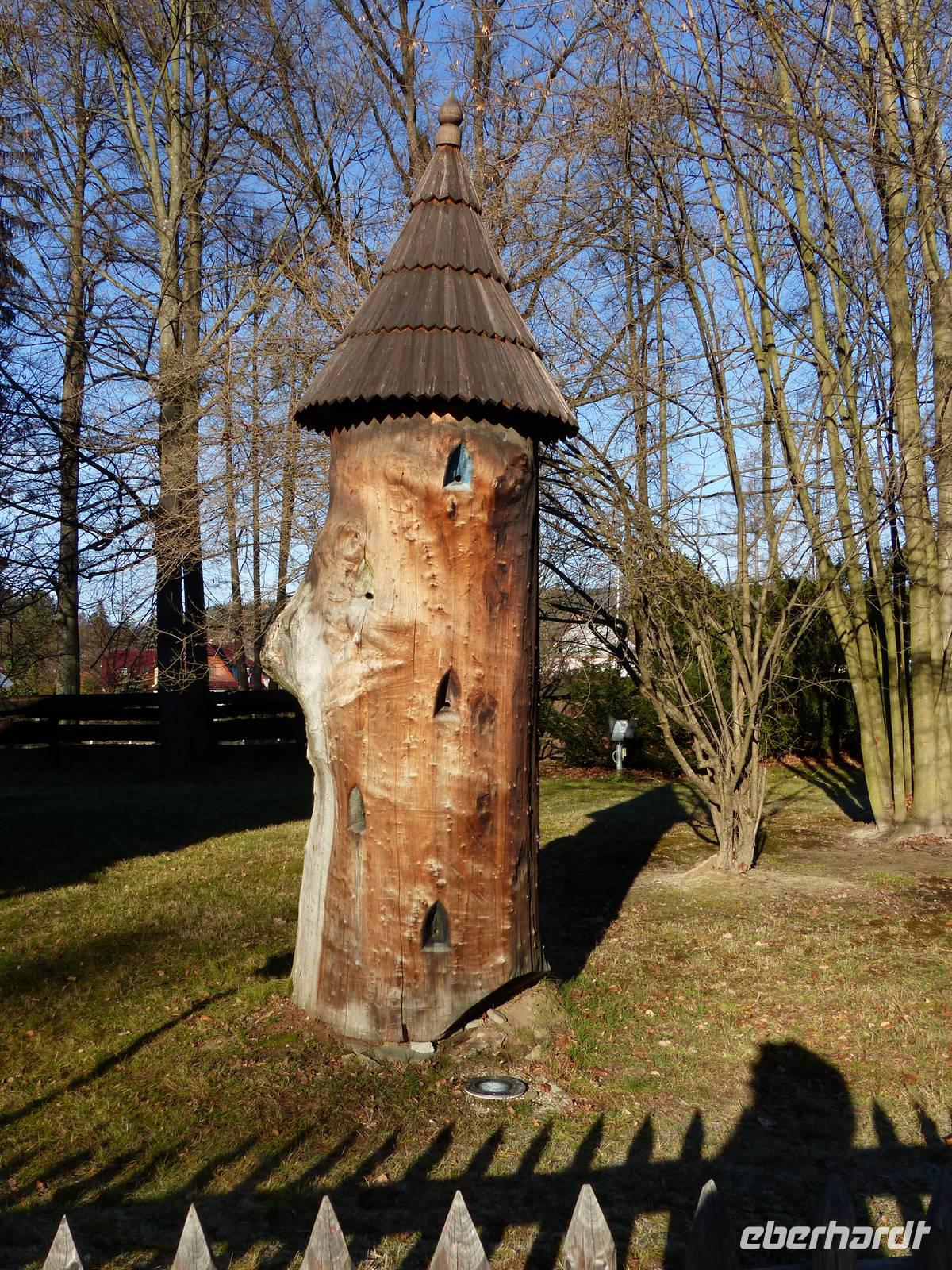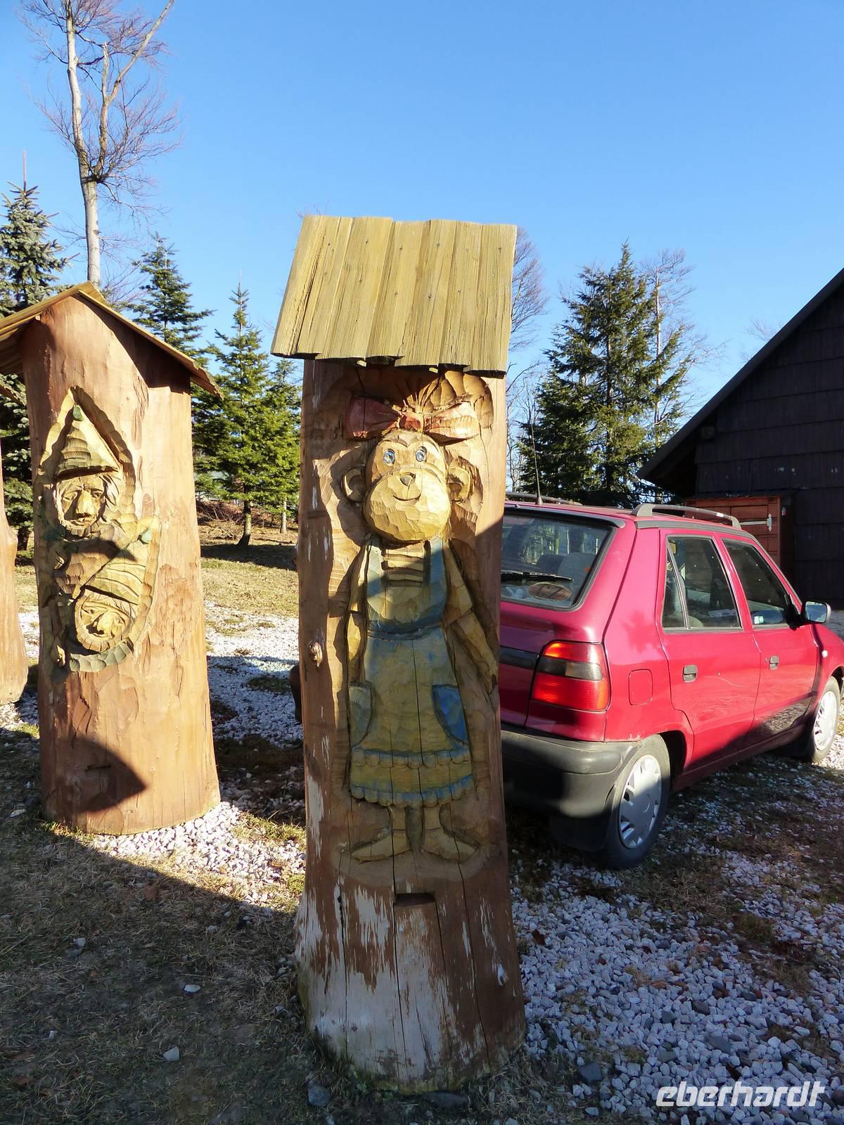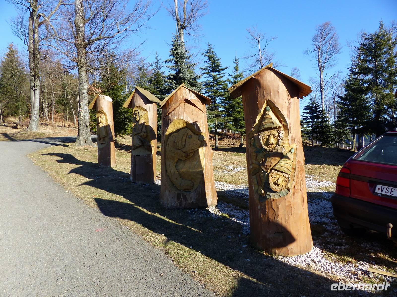 Von Rožnov aus fuhren wir in die Beskiden, zum Bergort Pustevny an der Flanke des nach dem Slawengott Radegast benannten höchsten Berges Radhošt'. Pustevny war ursprünglich ein schwer erreichbar Einsiedlerhof, der in 1010 m Höhe auf einem Bergsattel lag. Nachdem der Ort Ende des 19. Jh. als Kurort entdeckt wurde und der bekannte slowakische Architekt Dušan Jurkovic zwei große Restaurant-Pensionen im Stil der örtlichen Volksarchitektur errichtete, gelangte der Ort zu Bekanntheit und erfreut sich heute als Ausflugsziel und Skigebiet großer Beliebtheit. Obwohl eines der prunkvollen Gasthäuser - beide erst 2003 vollständig restauriert - kürzlich abgebrannt war, suchen hier zahlreiche Urlauber und Ausflügler Erholung und frische Luft bei Wanderungen oder Waldspaziergängen. Wir konnten uns unter die tausende von „Lufthungrigen" mischen, denn trotz der bei herrlichstem, eiskalten und etwas windigen Sonnenwetter die Straßen zugeparkt waren, fand Buschauffeur Gunter Spörl einen Weg und zum Schluss sogar einen freien Busparkplatz.