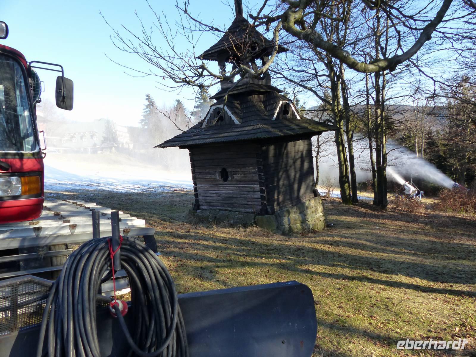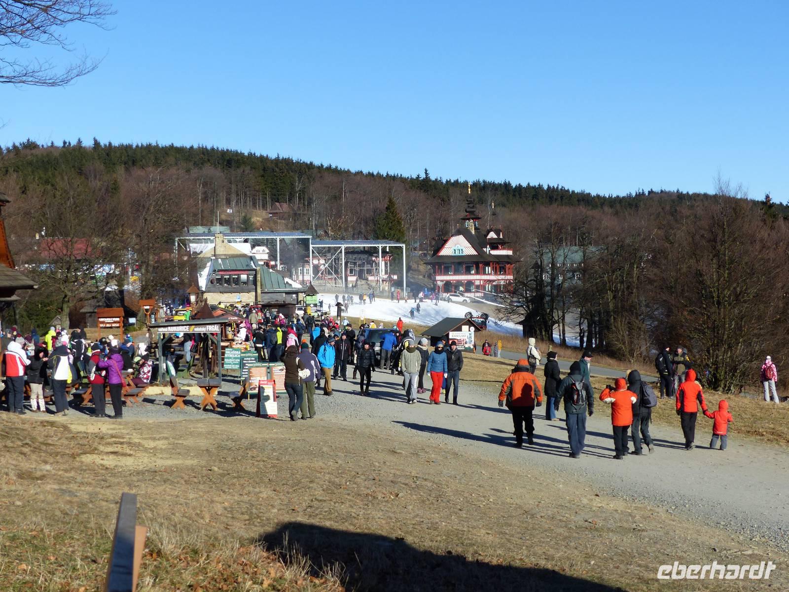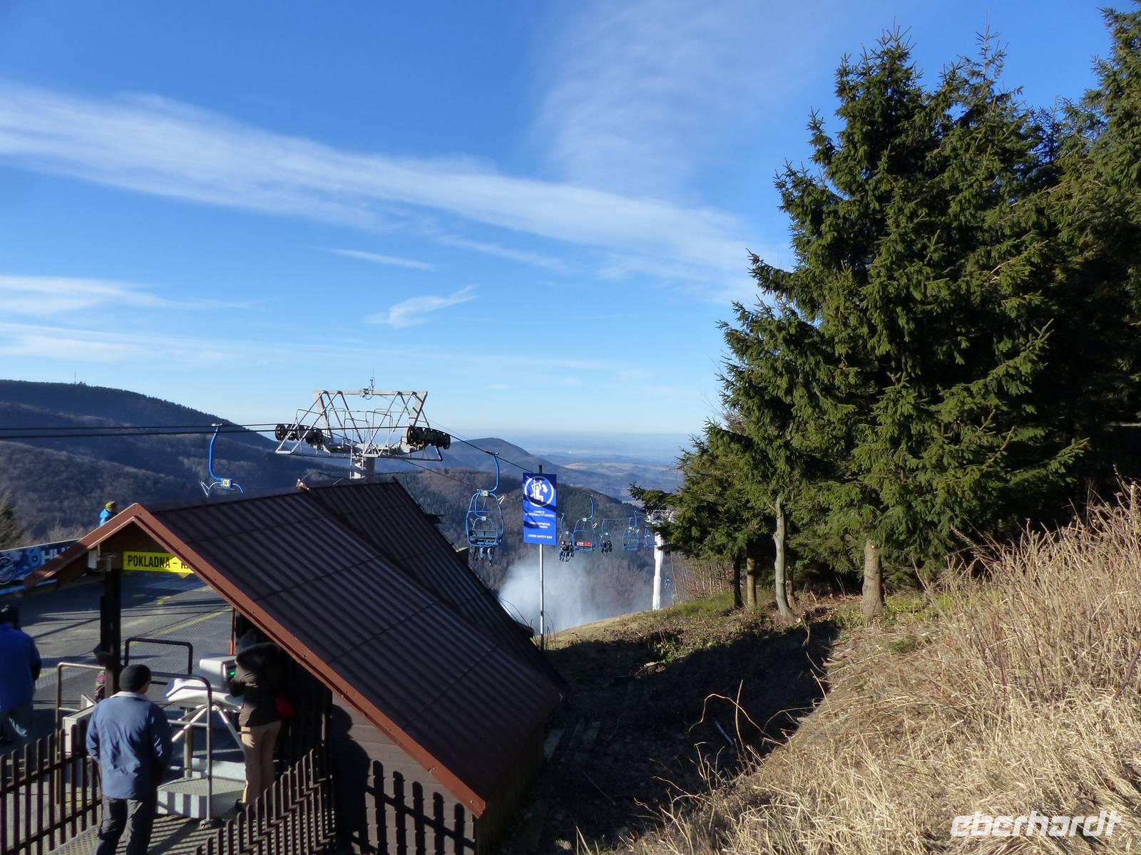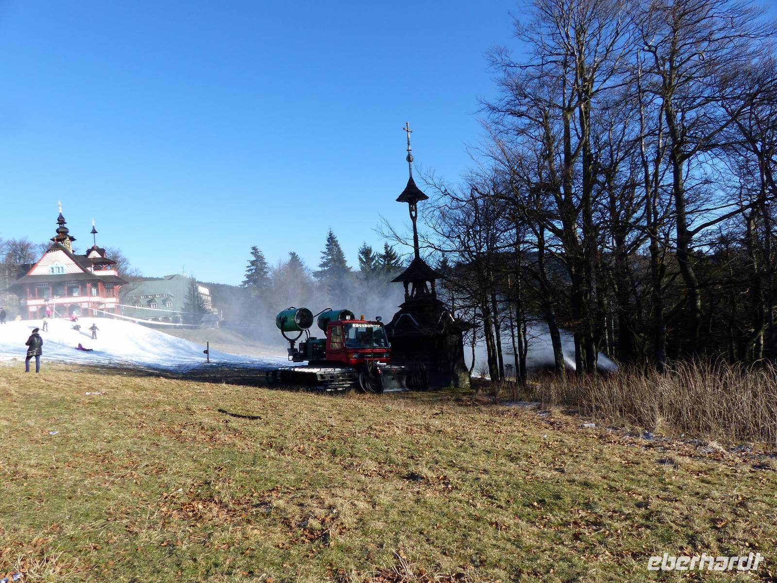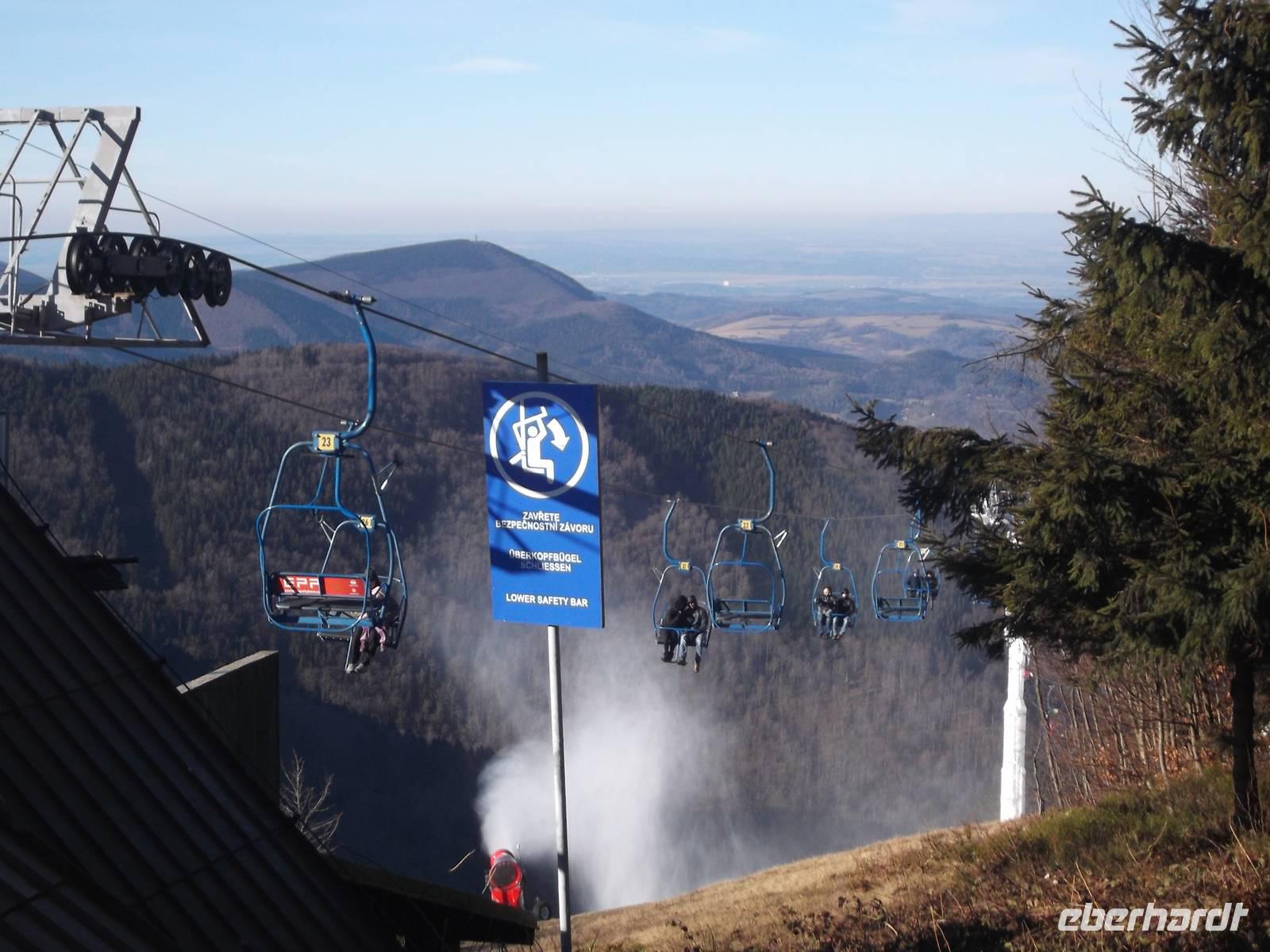 Wir hatten Zeit, dem Leben und Treiben hier oben zuzusehen - mehrere Schneekanonen versuchten mit emsigem Betrieb die Pisten wenigstens mit etwas Kunstschnee zu bedecken, zahlreiche Behelfsbuden und Kioske boten Glühwein, Bier und Snacks an und man hatte einen weiten Blick über die Berge. Nach einem Mittagsimbiss - Bockwurst, wer eine wollte - und Kaffee im Bus fuhren wir auf den Beskidenstraßen und durch die mährische Landschaft zurück nach Olomouc.