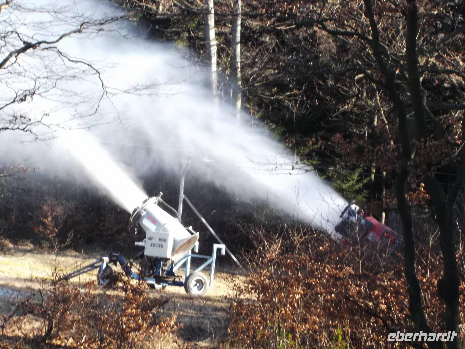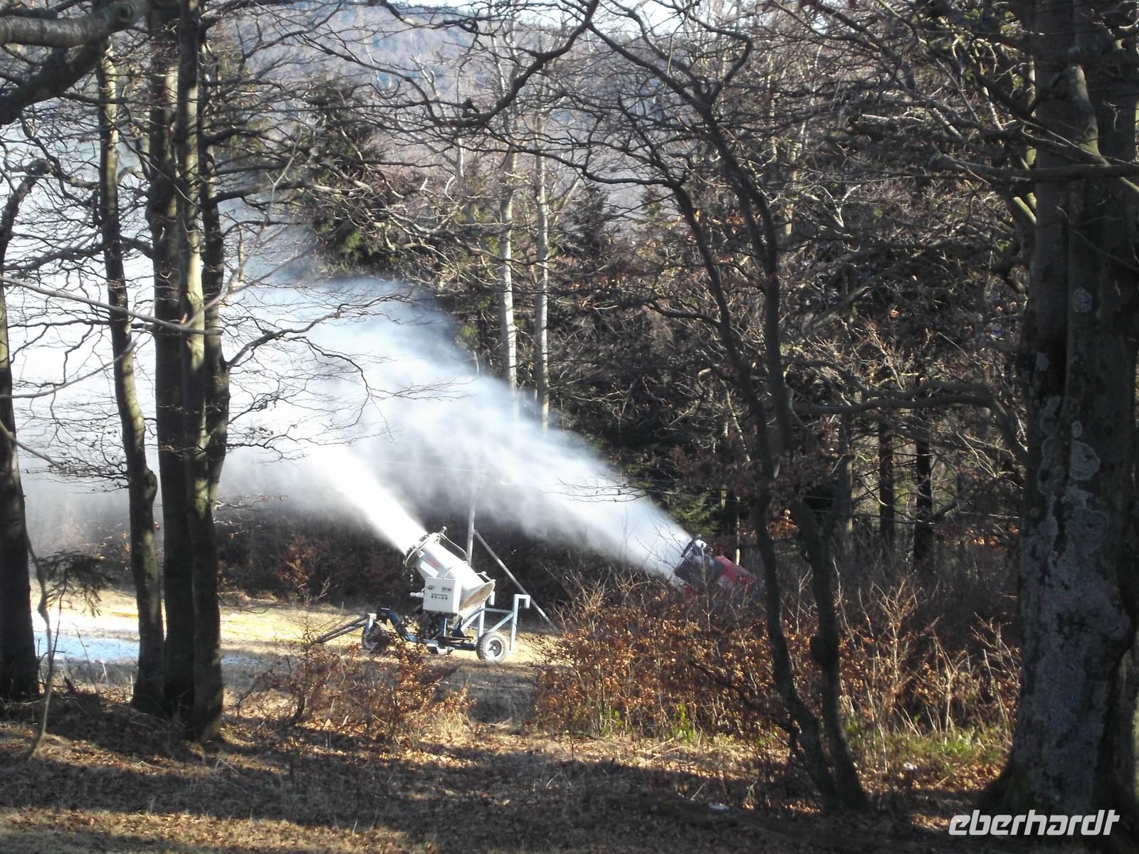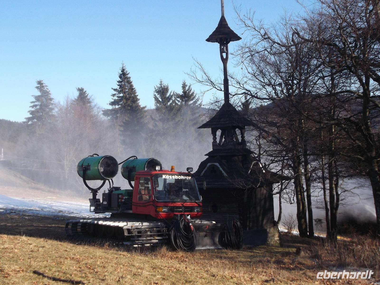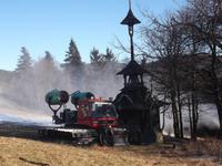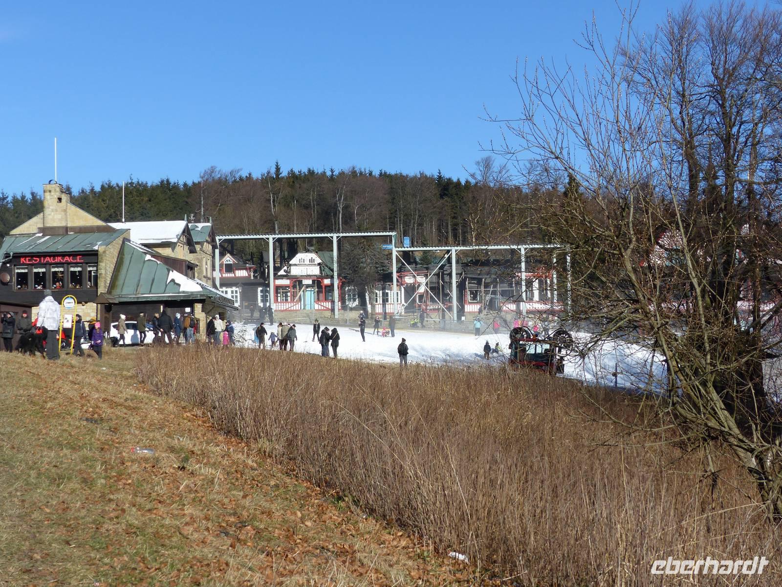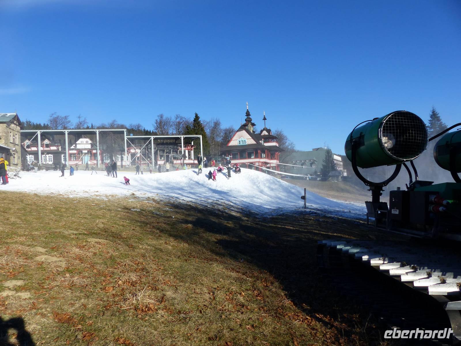 Wir hatten Zeit, dem Leben und Treiben hier oben zuzusehen - mehrere Schneekanonen versuchten mit emsigem Betrieb die Pisten wenigstens mit etwas Kunstschnee zu bedecken, zahlreiche Behelfsbuden und Kioske boten Glühwein, Bier und Snacks an und man hatte einen weiten Blick über die Berge. Nach einem Mittagsimbiss - Bockwurst, wer eine wollte - und Kaffee im Bus fuhren wir auf den Beskidenstraßen und durch die mährische Landschaft zurück nach Olomouc.