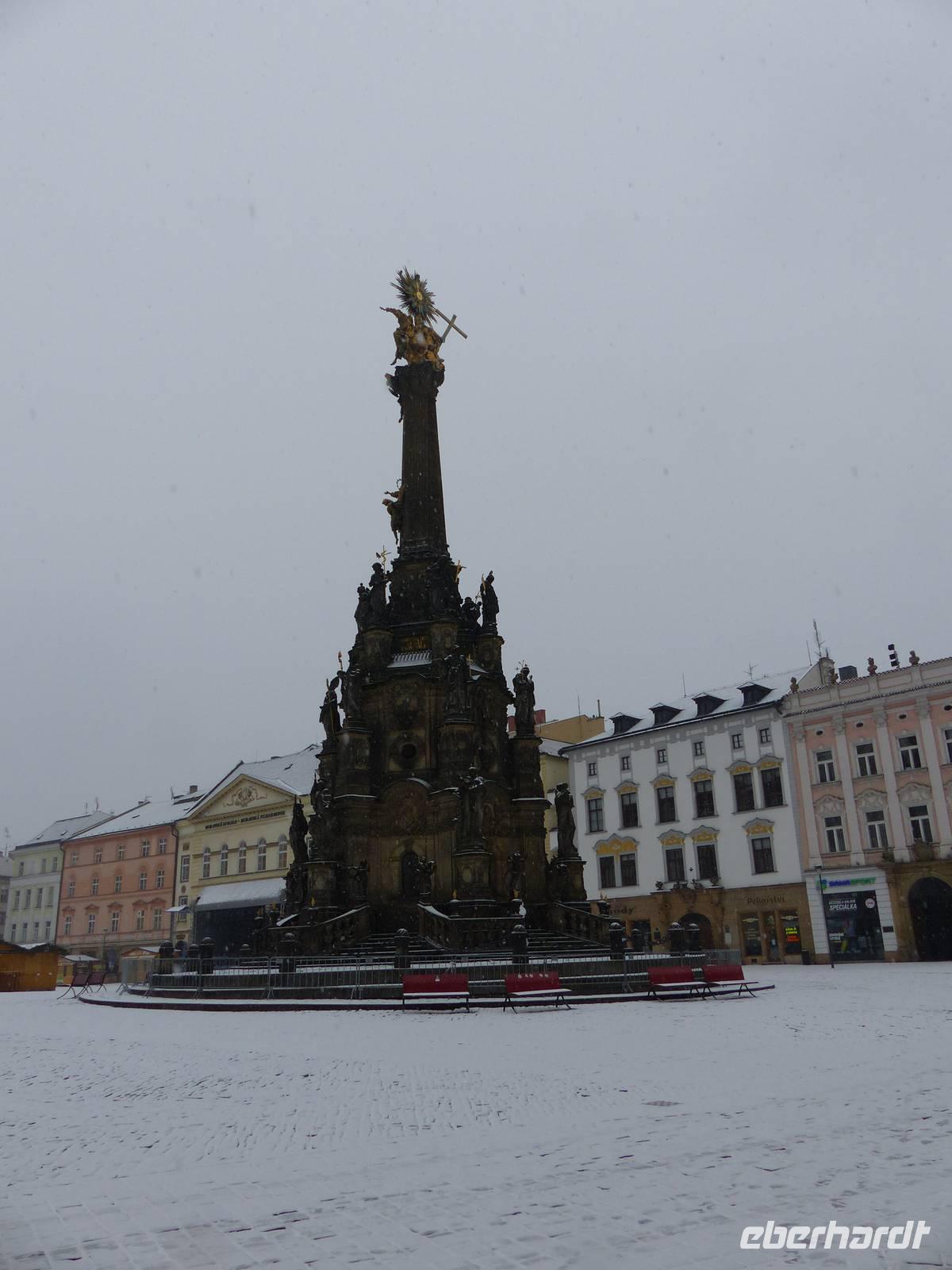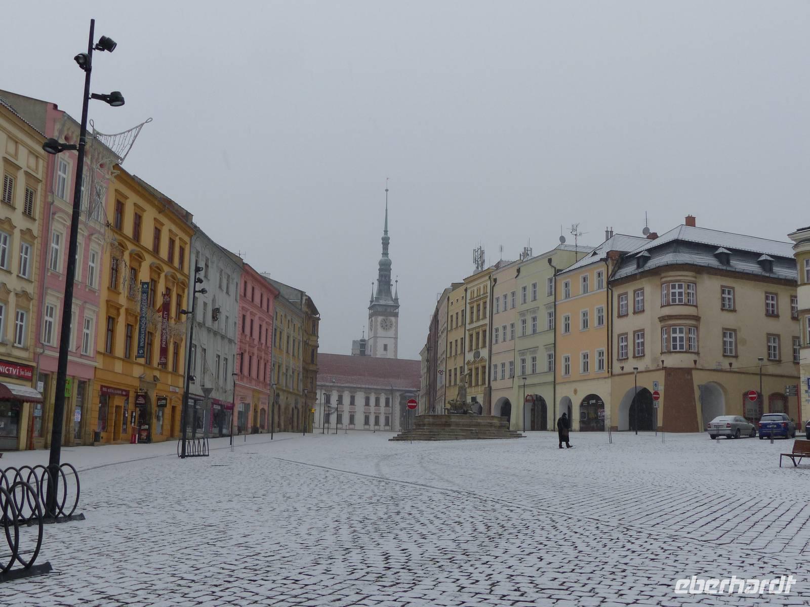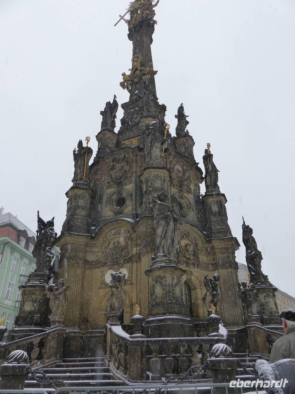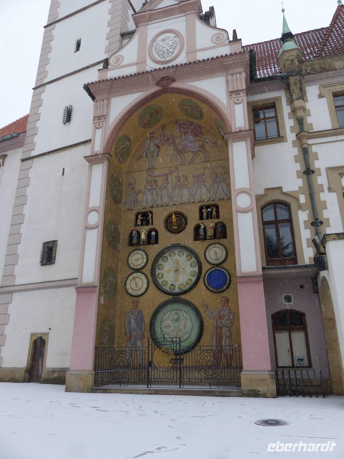 Das Frühstück durfte - nach der Feier vom Vortag - heute ruhig ein wenig später sein. Auch unser Tagesprogramm begann heute nicht so früh wie sonst gewohnt. Der Neujahrstag sollte zunächst die wunderschöne Altstadt von Olomouc etwas näherbringen. Heute allerdings war das Wetter nicht so auf unserer Seite wie in den vergangenen Tagen! Was als diesiger Tag begonnen hatte, wurde bereits beim Start unseres Stadtrundganges zu einem echten Wintertag: bei teilweise recht heftigem Schneefall lernten wir die Sehenswürdigkeiten des Olmützer Stadtkerns kennen: Wir begannen bei einigen erhaltenen Resten der von den Österreichern komplett um die Stadtfestung gezogenen Umwallung mit Kugelfang-Mauern und dem noch erhaltenen Theresientor. Dann erreichten wir den Untermarkt - hier „Niederring" genannt mit der Marien- oder Pestsäule und einigen Häusern aus der Renaissancezeit sowie einigen der meist mythologischen Figuren gewidmeten historischen Brunnen. Das Zentrum des nun folgenden Obermarktes oder „Oberrings" bildet das Rathaus Der von einem 75 m hohen Turm überragte gewaltige Bau stammt aus der Gotik mit Erweiterungen aus späteren Zeiten, überwiegend der Renaissance. Eines seiner besonderen Elemente ist die astronomische Uhr. Eigentlich stammt sie schon aus dem 15. Jh., wurde aber nach ihrer 1945 erfolgten Zerstörung in den 50er Jahren des 20. Jh. im Stil des „sozialistischen Realismus" neu aufgebaut.