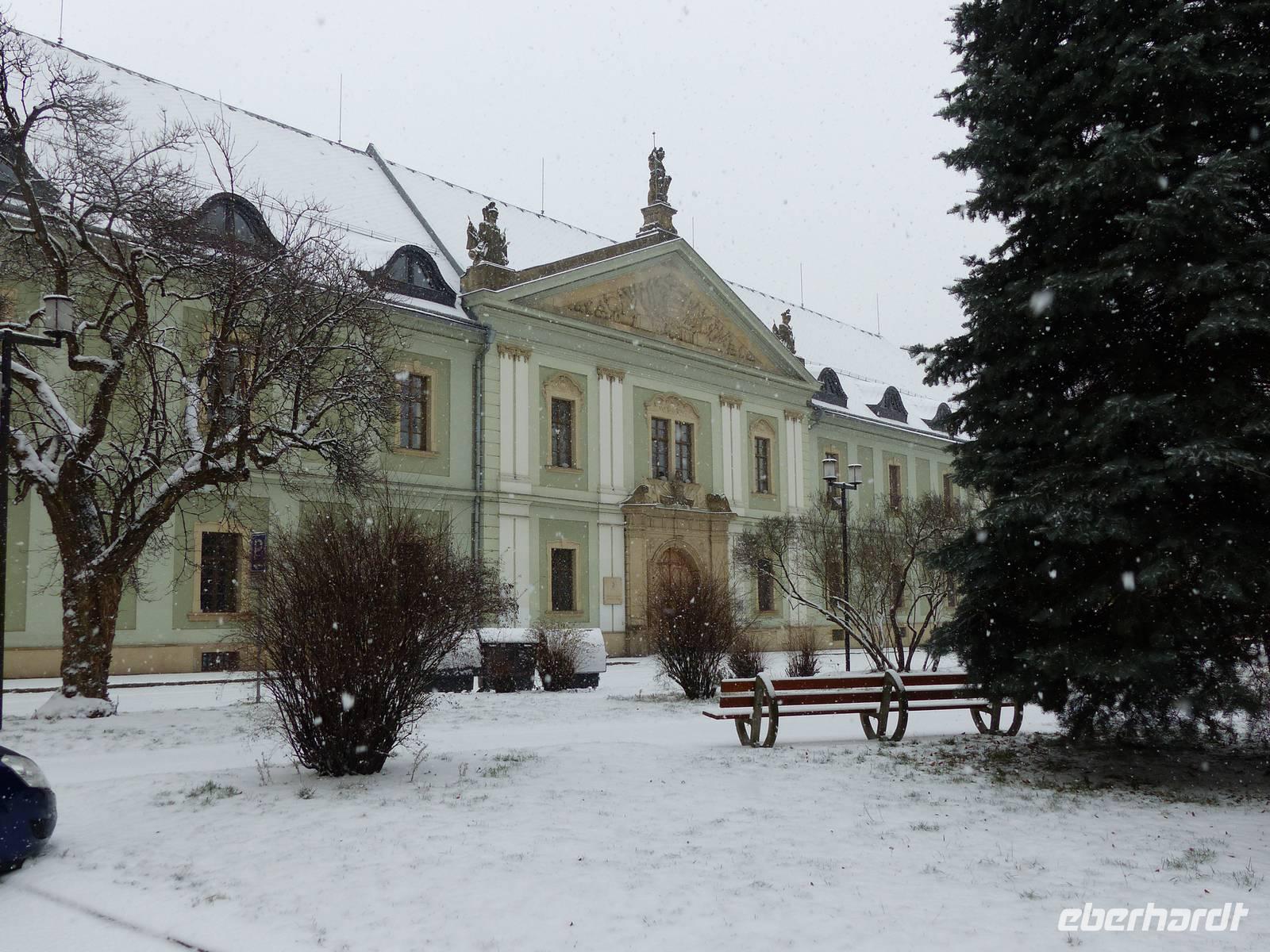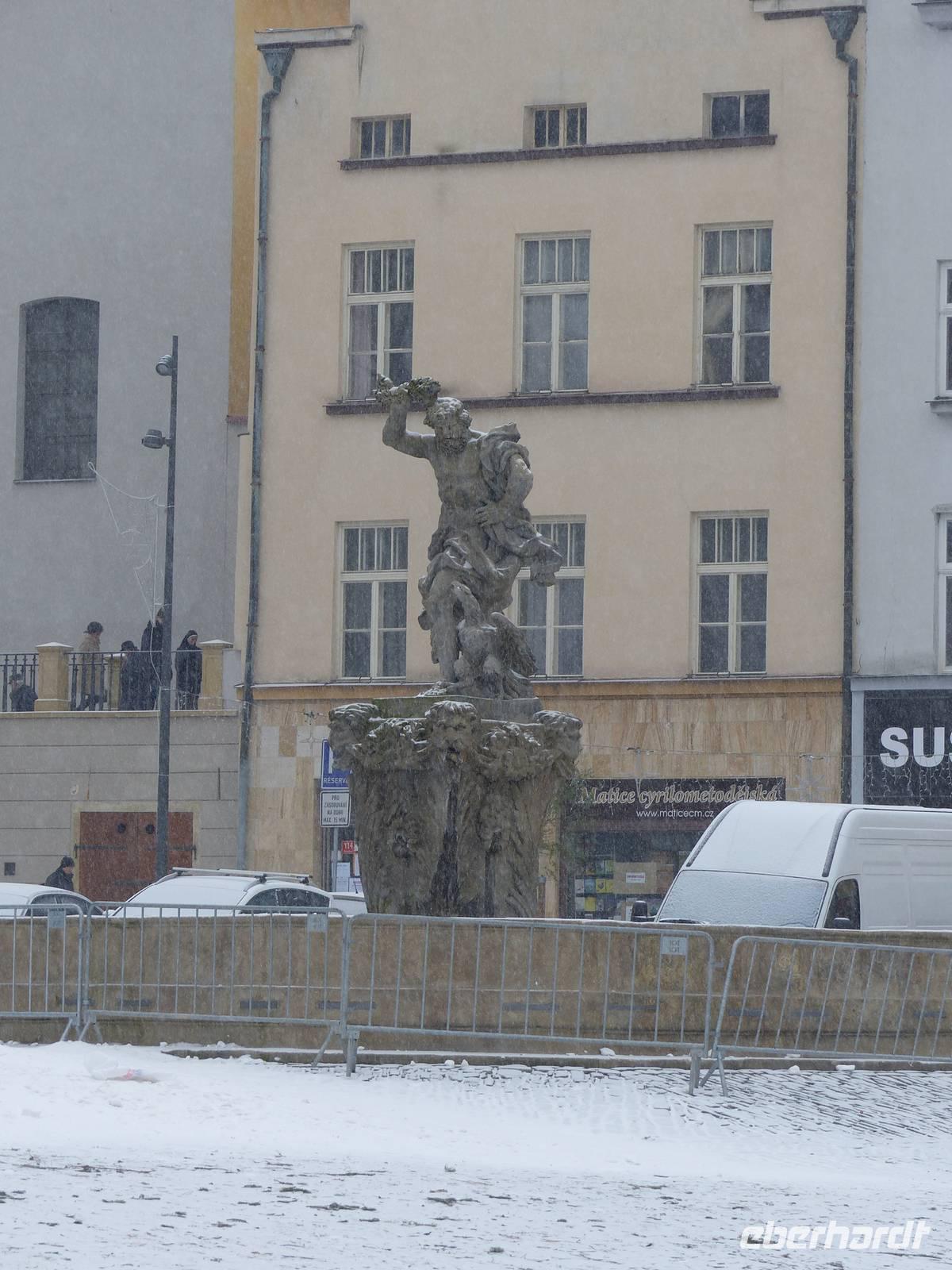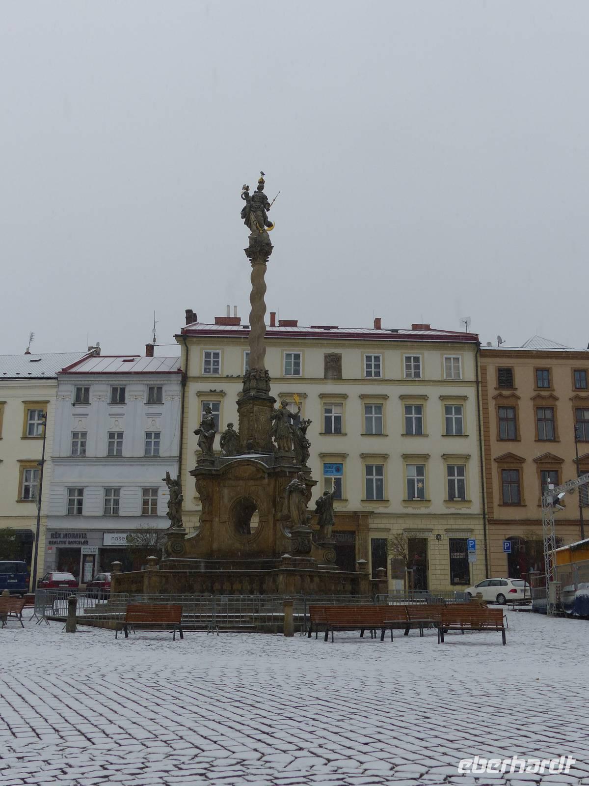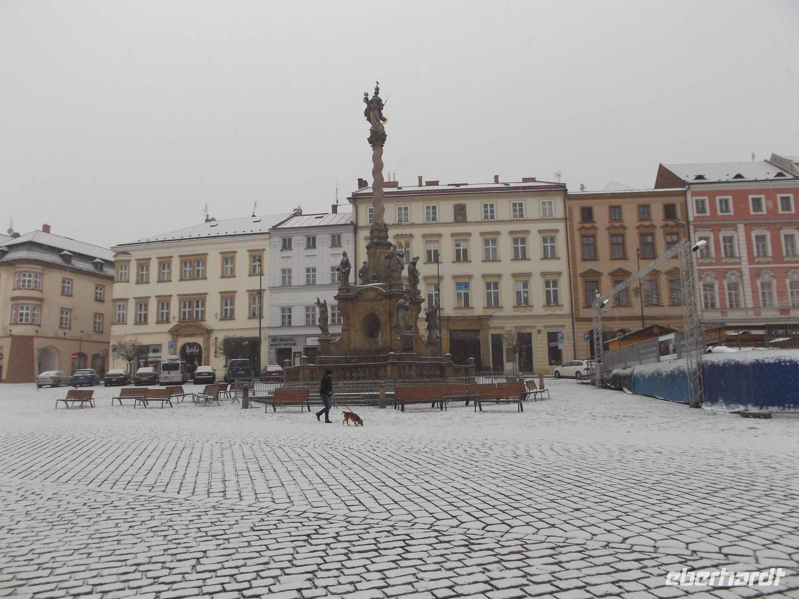 Das Frühstück durfte - nach der Feier vom Vortag - heute ruhig ein wenig später sein. Auch unser Tagesprogramm begann heute nicht so früh wie sonst gewohnt. Der Neujahrstag sollte zunächst die wunderschöne Altstadt von Olomouc etwas näherbringen. Heute allerdings war das Wetter nicht so auf unserer Seite wie in den vergangenen Tagen! Was als diesiger Tag begonnen hatte, wurde bereits beim Start unseres Stadtrundganges zu einem echten Wintertag: bei teilweise recht heftigem Schneefall lernten wir die Sehenswürdigkeiten des Olmützer Stadtkerns kennen: Wir begannen bei einigen erhaltenen Resten der von den Österreichern komplett um die Stadtfestung gezogenen Umwallung mit Kugelfang-Mauern und dem noch erhaltenen Theresientor. Dann erreichten wir den Untermarkt - hier „Niederring" genannt mit der Marien- oder Pestsäule und einigen Häusern aus der Renaissancezeit sowie einigen der meist mythologischen Figuren gewidmeten historischen Brunnen. Das Zentrum des nun folgenden Obermarktes oder „Oberrings" bildet das Rathaus Der von einem 75 m hohen Turm überragte gewaltige Bau stammt aus der Gotik mit Erweiterungen aus späteren Zeiten, überwiegend der Renaissance. Eines seiner besonderen Elemente ist die astronomische Uhr. Eigentlich stammt sie schon aus dem 15. Jh., wurde aber nach ihrer 1945 erfolgten Zerstörung in den 50er Jahren des 20. Jh. im Stil des „sozialistischen Realismus" neu aufgebaut.