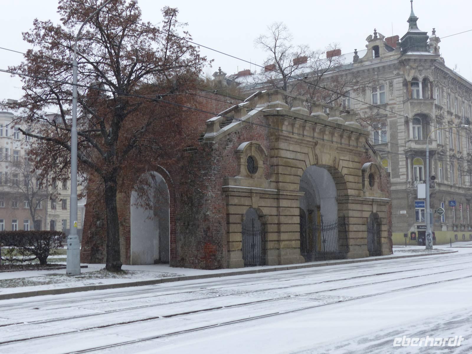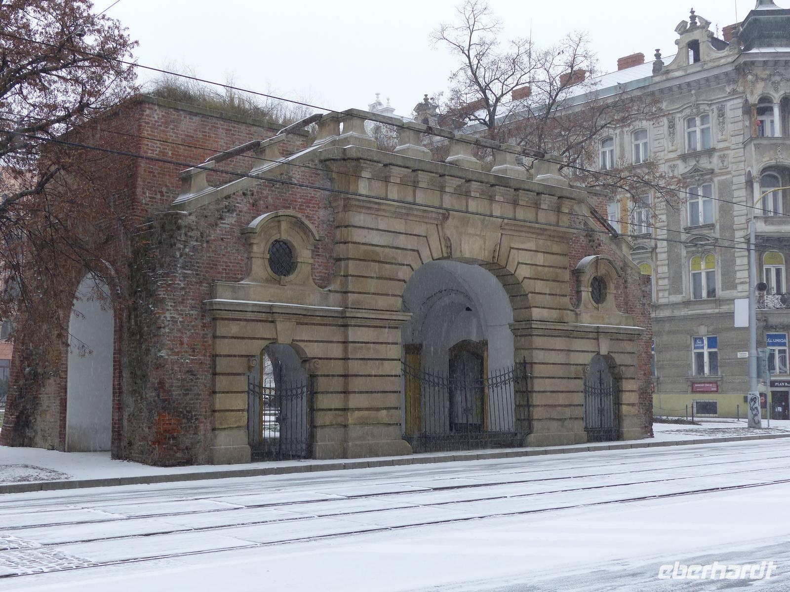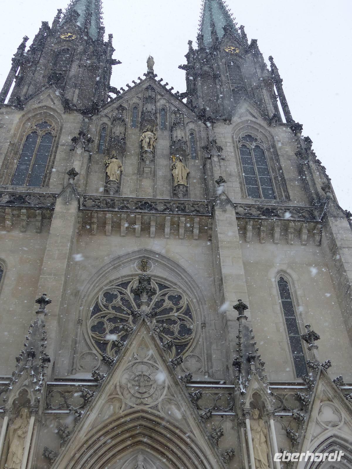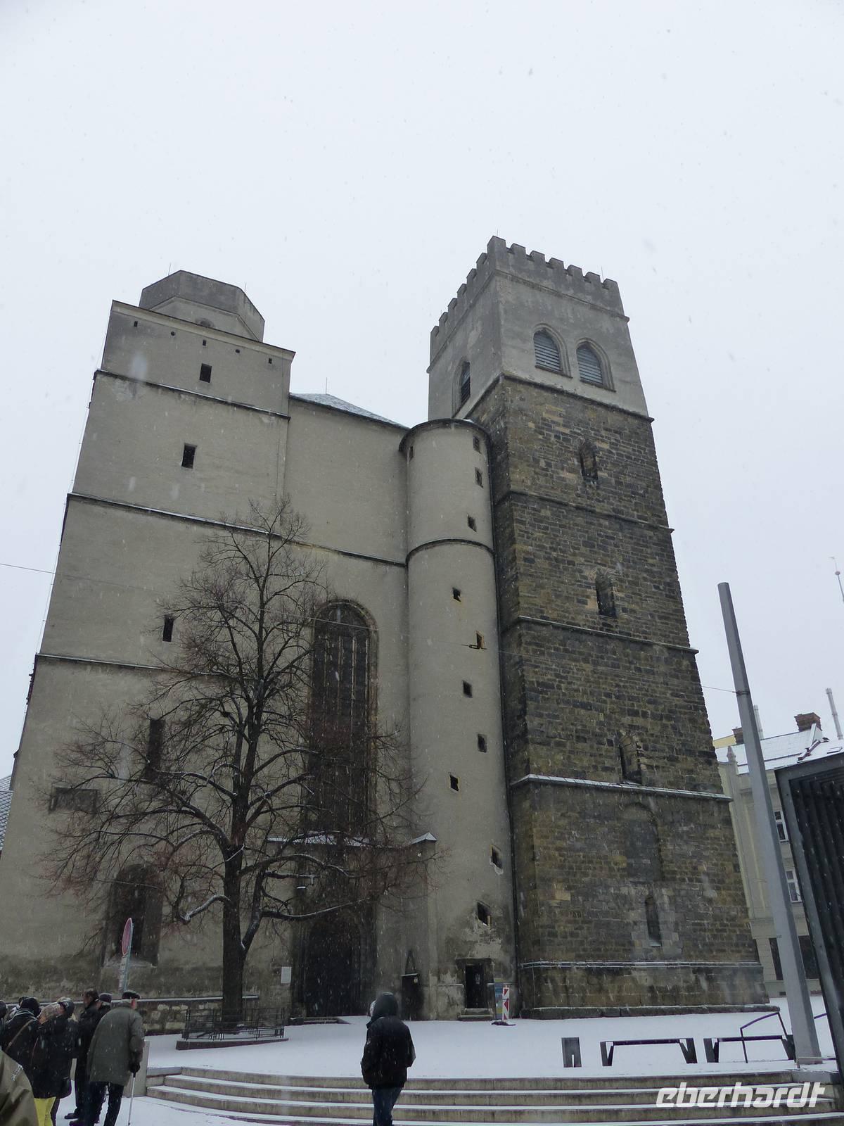 Das Frühstück durfte - nach der Feier vom Vortag - heute ruhig ein wenig später sein. Auch unser Tagesprogramm begann heute nicht so früh wie sonst gewohnt. Der Neujahrstag sollte zunächst die wunderschöne Altstadt von Olomouc etwas näherbringen. Heute allerdings war das Wetter nicht so auf unserer Seite wie in den vergangenen Tagen! Was als diesiger Tag begonnen hatte, wurde bereits beim Start unseres Stadtrundganges zu einem echten Wintertag: bei teilweise recht heftigem Schneefall lernten wir die Sehenswürdigkeiten des Olmützer Stadtkerns kennen: Wir begannen bei einigen erhaltenen Resten der von den Österreichern komplett um die Stadtfestung gezogenen Umwallung mit Kugelfang-Mauern und dem noch erhaltenen Theresientor. Dann erreichten wir den Untermarkt - hier „Niederring" genannt mit der Marien- oder Pestsäule und einigen Häusern aus der Renaissancezeit sowie einigen der meist mythologischen Figuren gewidmeten historischen Brunnen. Das Zentrum des nun folgenden Obermarktes oder „Oberrings" bildet das Rathaus Der von einem 75 m hohen Turm überragte gewaltige Bau stammt aus der Gotik mit Erweiterungen aus späteren Zeiten, überwiegend der Renaissance. Eines seiner besonderen Elemente ist die astronomische Uhr. Eigentlich stammt sie schon aus dem 15. Jh., wurde aber nach ihrer 1945 erfolgten Zerstörung in den 50er Jahren des 20. Jh. im Stil des „sozialistischen Realismus" neu aufgebaut.