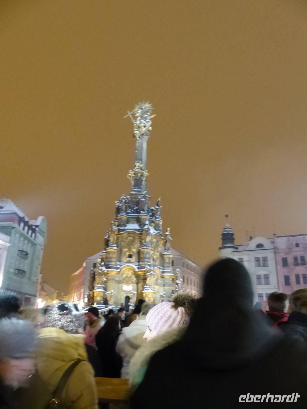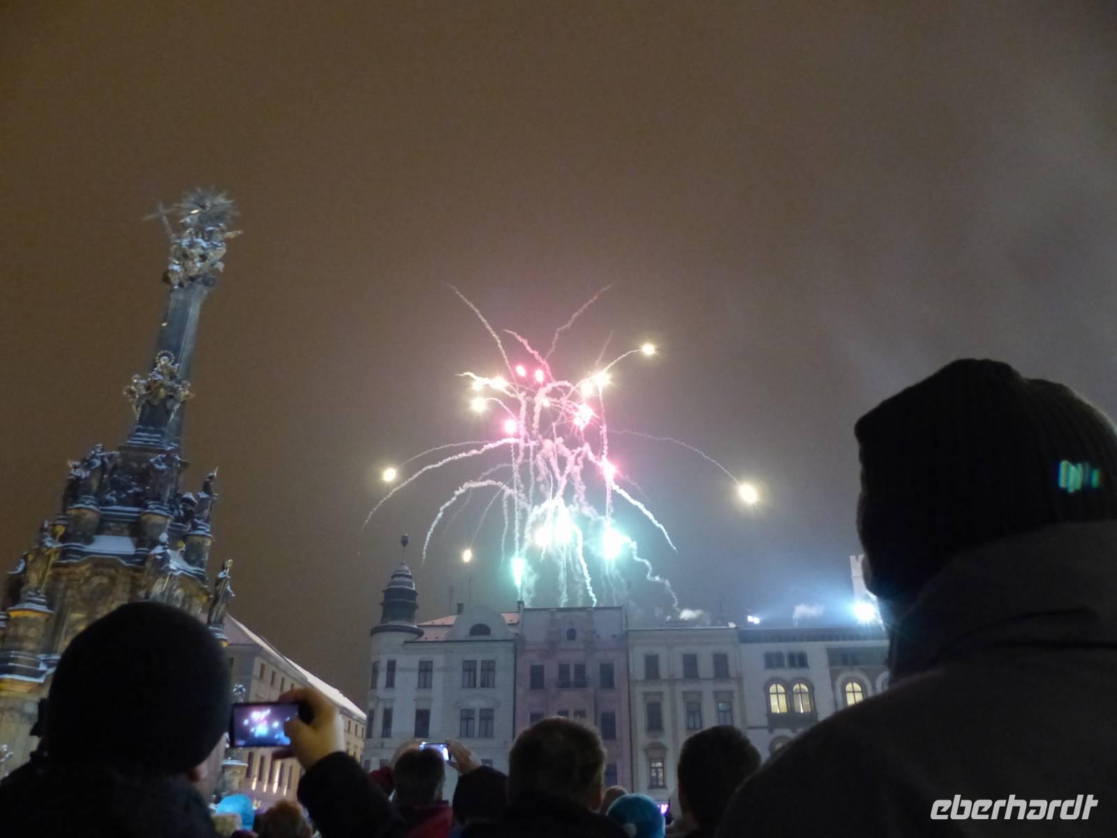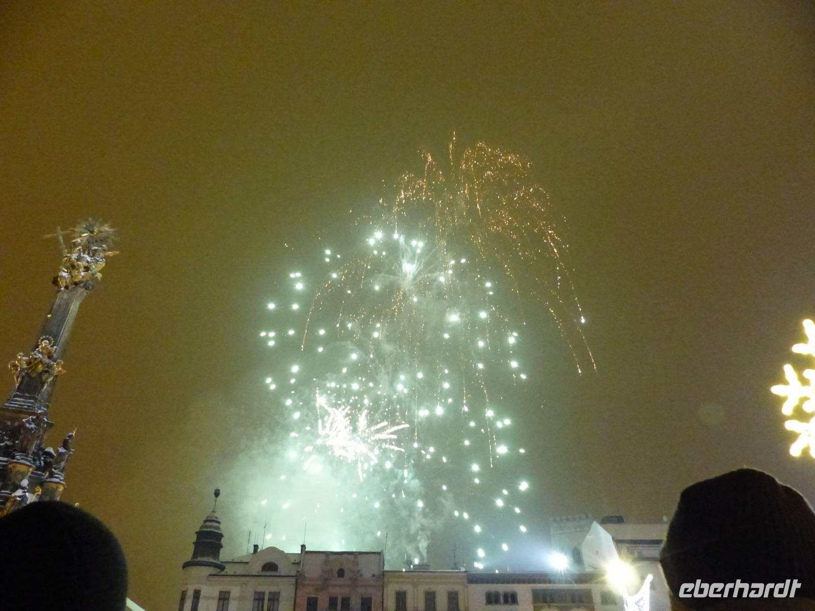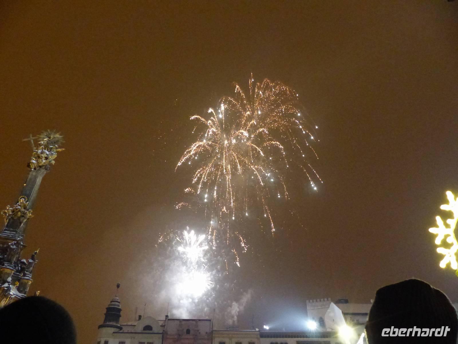 Wer wollte, konnte vor dem Abendessen noch einen Abstecher zum Obermarkt unternehmen: Hier gab die Stadt bei geöffneten Punsch-, Glühwein und Imbissbuden einen Neujahrsempfang für die Olmützer und ihre Gäste, der um 18.00 Uhr in einem zwar nicht allzu langen, aber sehr schönen und intensiven Neujahrs-Feuerwerk gipfelte.