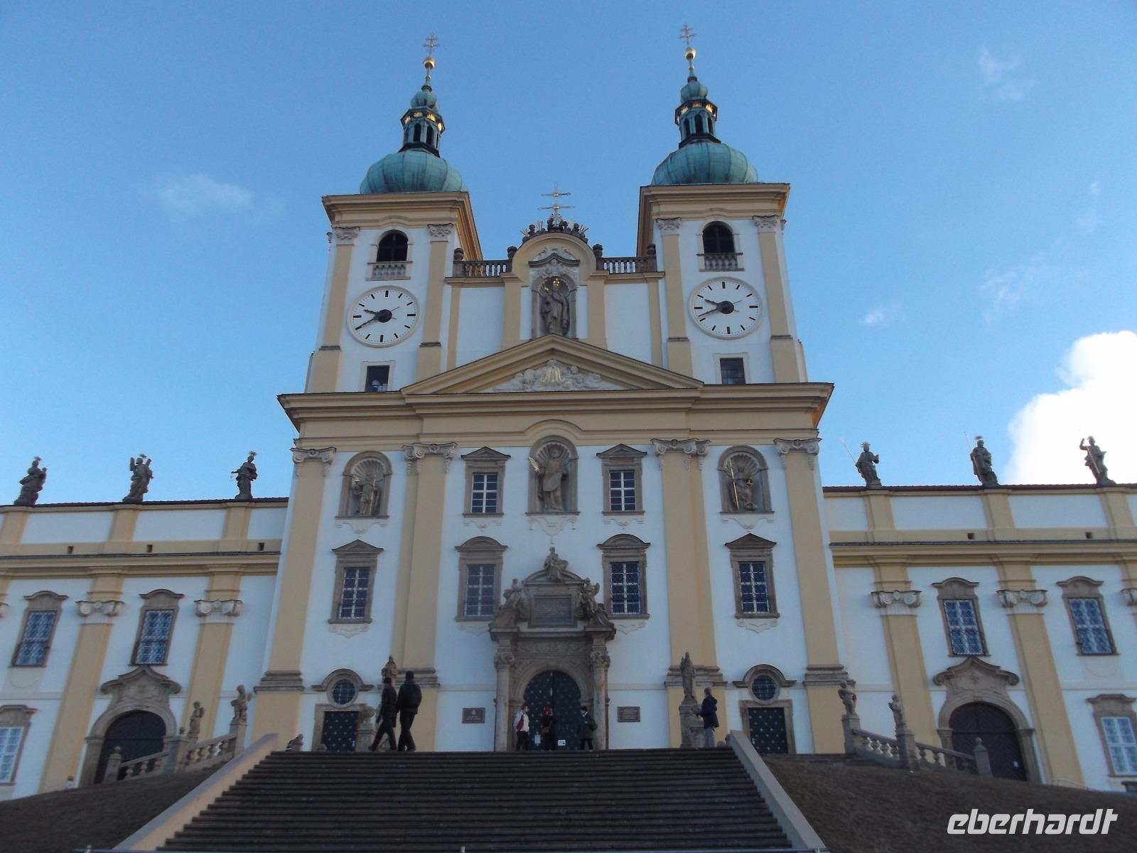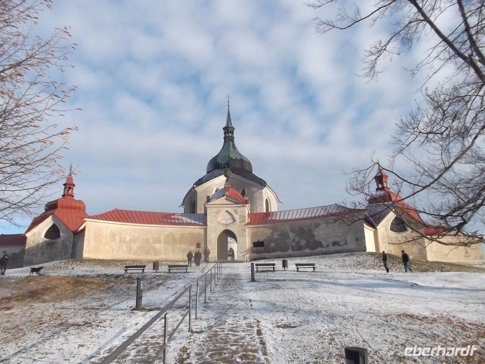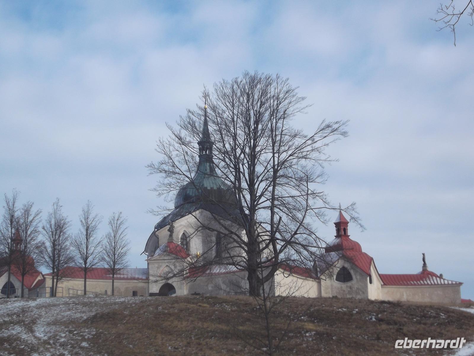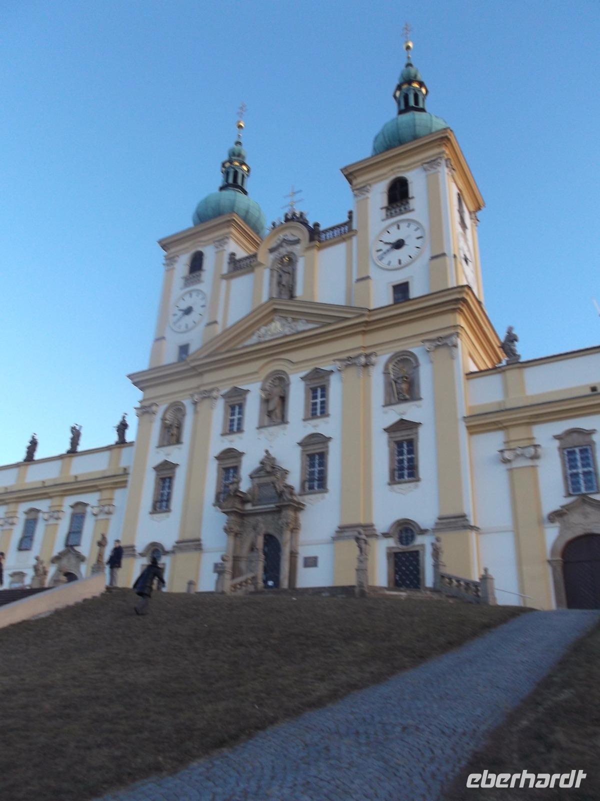 Den Herkunftsorten unserer Gäste und der Strecke nach Tschechien Rechnung tragend, startetet unser Bus zur Silvesterreise bereits in Chemnitz und fuhr über Hainichen und den Flughafen Dresden in Richtung Autobahn nach Prag.. Nach einem Fahrerwechsel kurz vor der Grenze zu Tschechien und einem Stopp kurz dahinter wegen der Tauschmöglichkeit für tschechische Kronen ging es quer durch die tschechische Hauptstadt und weiter auf der Autobahn bis zum Halt an einer Raststätte in der Nähe von Prag. Auf der weiteren Strecke nach Südosten fuhren wir gegen Mittag auf der Landstraße weiter bis nach Žd'ár nad Sázavou. Im kleinen Dörfchen, das auf Deutsch „Saar" hieß, war schon im Mittelalter ein bedeutendes Zisterzienserkloster gegründet worden, heute etwas außerhalb des Ortszentrums gelegen. Hier hielten wir in der Nähe der alten Klosteranlage zur Mittagspause an. Der Gebäudekomplex, der im späten 18. Jh. säkularisiert und zum Schloss umgebaut wurde, enthält heute ein Museum. Wesentlich aufregender als dieses ist aber die Wallfahrtskirche, die ebenfalls im 18. Jh. entstand, auf Veranlassung des damals noch amtierenden Abtes von Saar, der die Verehrung des Nationalheiligen Johannes Nepomuk verbreiten wollte. Deshalb wurde der Berg nach Nepomuks Geburtsort Zelená Hora (Grüner Berg) umbenannt und die Kirche in ganz besonderem Stil erbaut. Schon seit 1994 wurde sie zum Objekt des UNESCO-Weltkulturerbes erklärt. Als eines der Hauptwerke des böhmischen Malers und Architekten Johann Blasius Santini-Aichl, der aus Prag stammt und an vielen Kirchen, Palästen und Schlössern in Böhmen und Mähren mitgewirkt hat, gelang diesem mit der hiesigen Nepomuk-Kirche eine besonders gestaltete Anlage. In Europa einzigartig, weist sie eine äußerst eigenwillige und völlig ungewohnte Mischung gotischer und barocker Stilelemente auf. In ihrer Form sieht sie aus der Vogelperspektive aus wie eine Blüte, wird aber auch als vielzackiger Stern interpretiert. Ihr Schöpfer hat die im frühen 18. Jh. in Böhmen verbreitete Nepomuk-Symbolik mit den Sternen und auch immer wieder die Zahl fünf in seiner Architektur verwendet, wohl in Anlehnung an die Legende, dass fünf Flammen den Leichnam des als Märtyrer gestorbenen Johannes Nepomuk bei seiner Auffindung im Flussbett der Moldau umgeben hätten. In jedem Fall ist die Anlage grandios und auch die zentrale Wallfahrtskirche auf sternförmigem Grundriss ist neben ihrem Kapellenkranz voller Symbolik. Wir hatten Nach Aufstieg zur und Außenbesichtigung dieser interessanten Wallfahrtskirche noch etwas Freizeit und setzten danach unseren Weg in die historische Stadt Olomouc, unser Quartier für die kommende Silvesterreise, fort und erreichten einige Zeit vor dem Abendessen unser modernes Hotel.