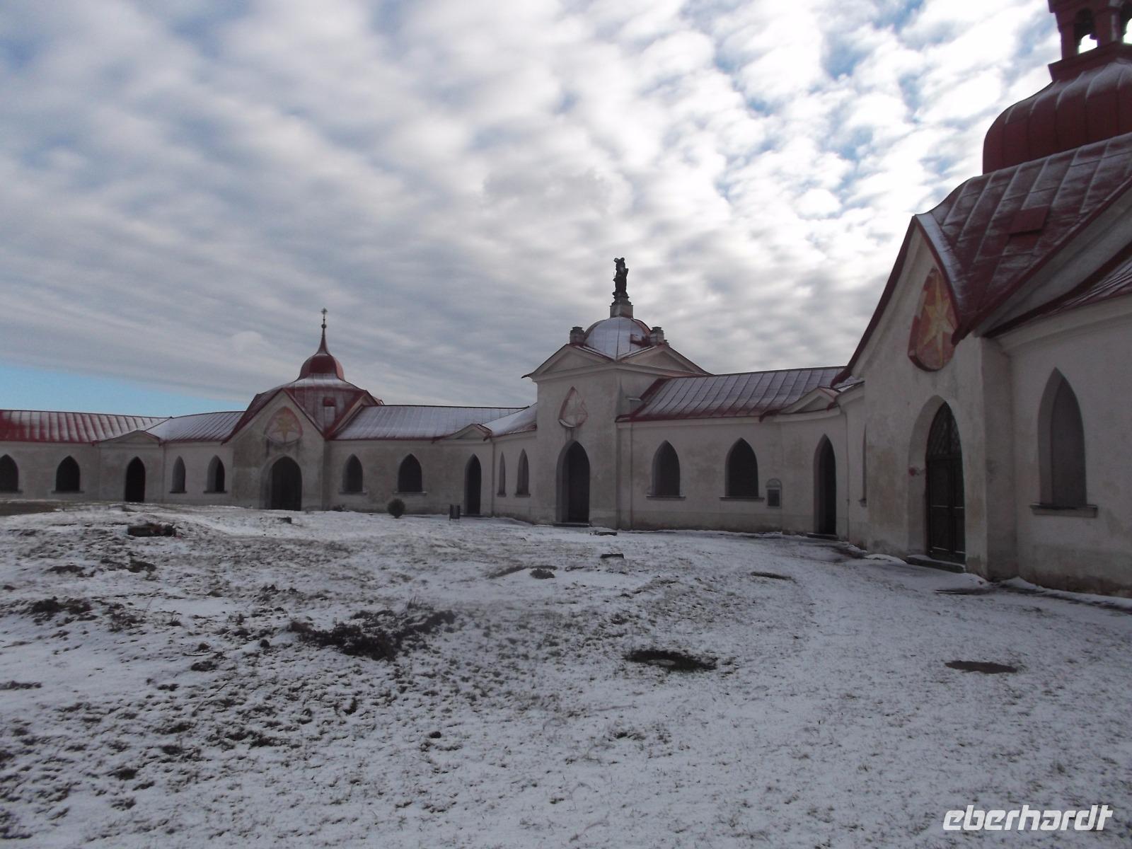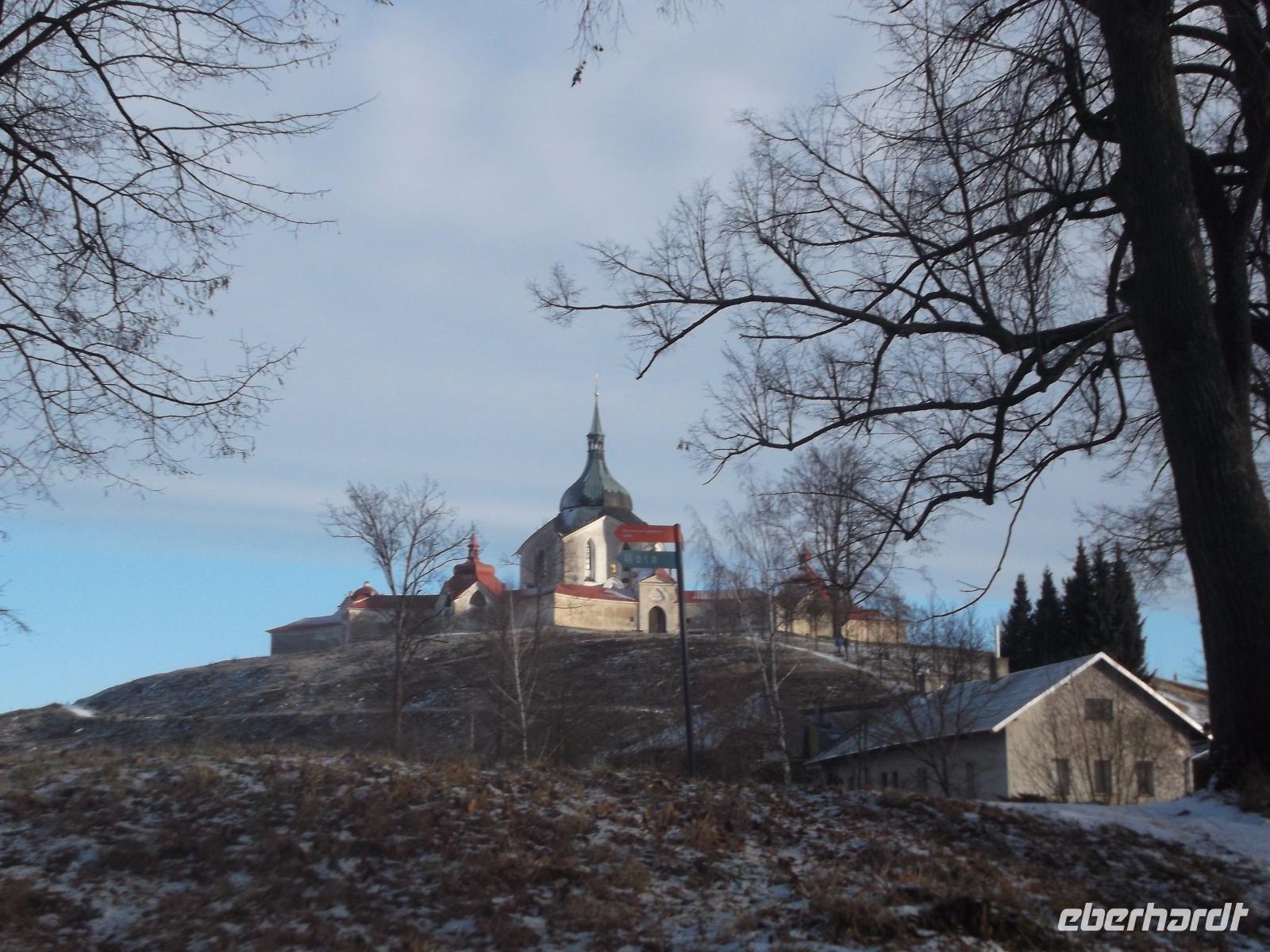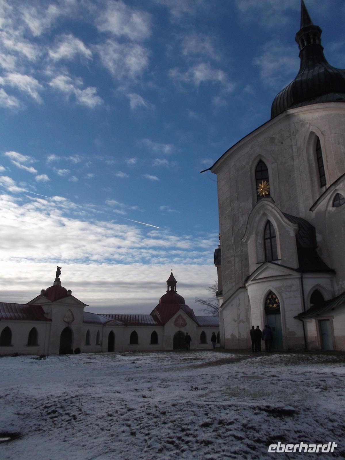 Den Herkunftsorten unserer Gäste und der Strecke nach Tschechien Rechnung tragend, startetet unser Bus zur Silvesterreise bereits in Chemnitz und fuhr über Hainichen und den Flughafen Dresden in Richtung Autobahn nach Prag.. Nach einem Fahrerwechsel kurz vor der Grenze zu Tschechien und einem Stopp kurz dahinter wegen der Tauschmöglichkeit für tschechische Kronen ging es quer durch die tschechische Hauptstadt und weiter auf der Autobahn bis zum Halt an einer Raststätte in der Nähe von Prag. Auf der weiteren Strecke nach Südosten fuhren wir gegen Mittag auf der Landstraße weiter bis nach Žd'ár nad Sázavou. Im kleinen Dörfchen, das auf Deutsch „Saar" hieß, war schon im Mittelalter ein bedeutendes Zisterzienserkloster gegründet worden, heute etwas außerhalb des Ortszentrums gelegen. Hier hielten wir in der Nähe der alten Klosteranlage zur Mittagspause an. Der Gebäudekomplex, der im späten 18. Jh. säkularisiert und zum Schloss umgebaut wurde, enthält heute ein Museum. Wesentlich aufregender als dieses ist aber die Wallfahrtskirche, die ebenfalls im 18. Jh. entstand, auf Veranlassung des damals noch amtierenden Abtes von Saar, der die Verehrung des Nationalheiligen Johannes Nepomuk verbreiten wollte. Deshalb wurde der Berg nach Nepomuks Geburtsort Zelená Hora (Grüner Berg) umbenannt und die Kirche in ganz besonderem Stil erbaut. Schon seit 1994 wurde sie zum Objekt des UNESCO-Weltkulturerbes erklärt. Als eines der Hauptwerke des böhmischen Malers und Architekten Johann Blasius Santini-Aichl, der aus Prag stammt und an vielen Kirchen, Palästen und Schlössern in Böhmen und Mähren mitgewirkt hat, gelang diesem mit der hiesigen Nepomuk-Kirche eine besonders gestaltete Anlage. In Europa einzigartig, weist sie eine äußerst eigenwillige und völlig ungewohnte Mischung gotischer und barocker Stilelemente auf. In ihrer Form sieht sie aus der Vogelperspektive aus wie eine Blüte, wird aber auch als vielzackiger Stern interpretiert. Ihr Schöpfer hat die im frühen 18. Jh. in Böhmen verbreitete Nepomuk-Symbolik mit den Sternen und auch immer wieder die Zahl fünf in seiner Architektur verwendet, wohl in Anlehnung an die Legende, dass fünf Flammen den Leichnam des als Märtyrer gestorbenen Johannes Nepomuk bei seiner Auffindung im Flussbett der Moldau umgeben hätten. In jedem Fall ist die Anlage grandios und auch die zentrale Wallfahrtskirche auf sternförmigem Grundriss ist neben ihrem Kapellenkranz voller Symbolik. Wir hatten Nach Aufstieg zur und Außenbesichtigung dieser interessanten Wallfahrtskirche noch etwas Freizeit und setzten danach unseren Weg in die historische Stadt Olomouc, unser Quartier für die kommende Silvesterreise, fort und erreichten einige Zeit vor dem Abendessen unser modernes Hotel.