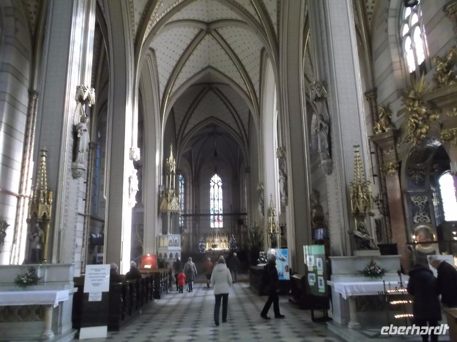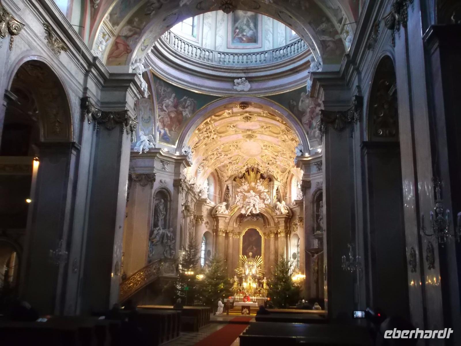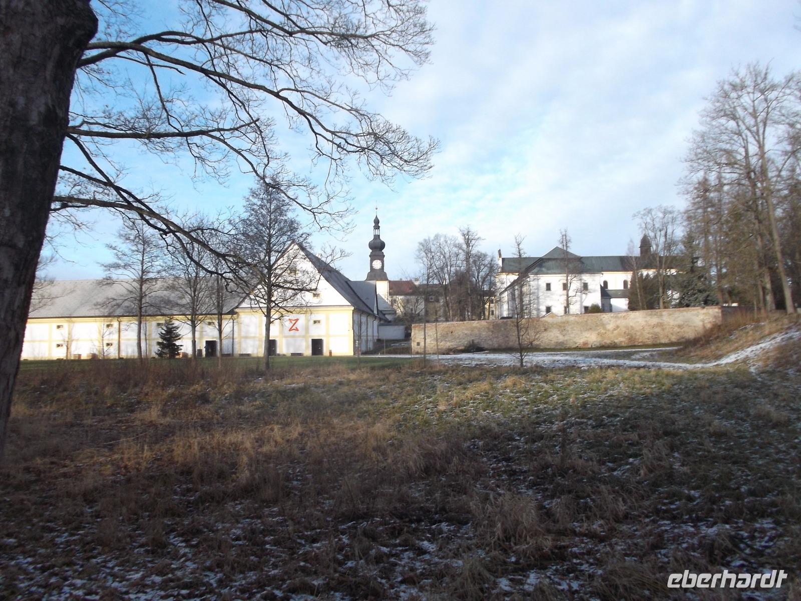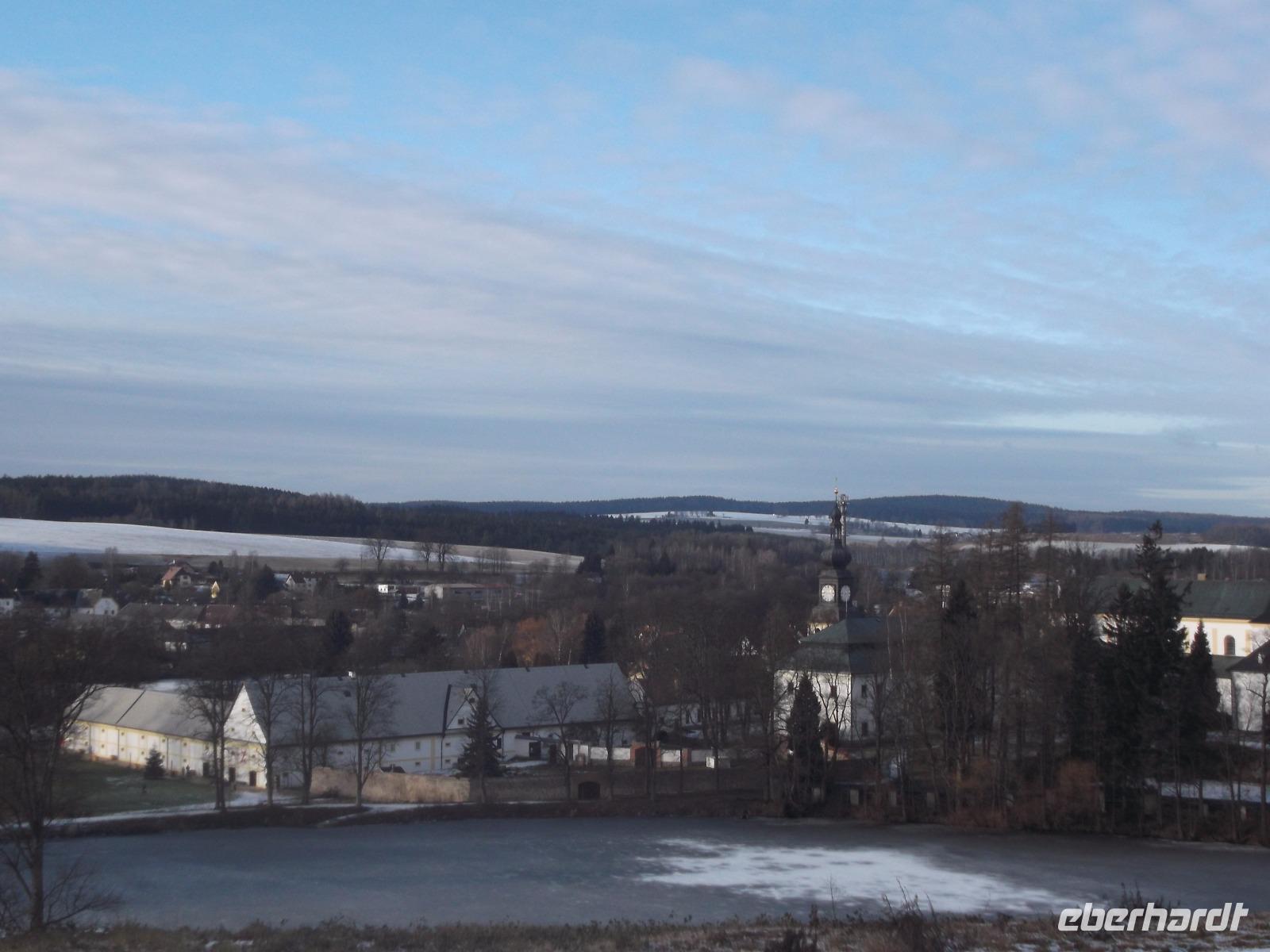 Den Herkunftsorten unserer Gäste und der Strecke nach Tschechien Rechnung tragend, startetet unser Bus zur Silvesterreise bereits in Chemnitz und fuhr über Hainichen und den Flughafen Dresden in Richtung Autobahn nach Prag.. Nach einem Fahrerwechsel kurz vor der Grenze zu Tschechien und einem Stopp kurz dahinter wegen der Tauschmöglichkeit für tschechische Kronen ging es quer durch die tschechische Hauptstadt und weiter auf der Autobahn bis zum Halt an einer Raststätte in der Nähe von Prag. Auf der weiteren Strecke nach Südosten fuhren wir gegen Mittag auf der Landstraße weiter bis nach Žd'ár nad Sázavou. Im kleinen Dörfchen, das auf Deutsch „Saar" hieß, war schon im Mittelalter ein bedeutendes Zisterzienserkloster gegründet worden, heute etwas außerhalb des Ortszentrums gelegen. Hier hielten wir in der Nähe der alten Klosteranlage zur Mittagspause an. Der Gebäudekomplex, der im späten 18. Jh. säkularisiert und zum Schloss umgebaut wurde, enthält heute ein Museum. Wesentlich aufregender als dieses ist aber die Wallfahrtskirche, die ebenfalls im 18. Jh. entstand, auf Veranlassung des damals noch amtierenden Abtes von Saar, der die Verehrung des Nationalheiligen Johannes Nepomuk verbreiten wollte. Deshalb wurde der Berg nach Nepomuks Geburtsort Zelená Hora (Grüner Berg) umbenannt und die Kirche in ganz besonderem Stil erbaut. Schon seit 1994 wurde sie zum Objekt des UNESCO-Weltkulturerbes erklärt. Als eines der Hauptwerke des böhmischen Malers und Architekten Johann Blasius Santini-Aichl, der aus Prag stammt und an vielen Kirchen, Palästen und Schlössern in Böhmen und Mähren mitgewirkt hat, gelang diesem mit der hiesigen Nepomuk-Kirche eine besonders gestaltete Anlage. In Europa einzigartig, weist sie eine äußerst eigenwillige und völlig ungewohnte Mischung gotischer und barocker Stilelemente auf. In ihrer Form sieht sie aus der Vogelperspektive aus wie eine Blüte, wird aber auch als vielzackiger Stern interpretiert. Ihr Schöpfer hat die im frühen 18. Jh. in Böhmen verbreitete Nepomuk-Symbolik mit den Sternen und auch immer wieder die Zahl fünf in seiner Architektur verwendet, wohl in Anlehnung an die Legende, dass fünf Flammen den Leichnam des als Märtyrer gestorbenen Johannes Nepomuk bei seiner Auffindung im Flussbett der Moldau umgeben hätten. In jedem Fall ist die Anlage grandios und auch die zentrale Wallfahrtskirche auf sternförmigem Grundriss ist neben ihrem Kapellenkranz voller Symbolik. Wir hatten Nach Aufstieg zur und Außenbesichtigung dieser interessanten Wallfahrtskirche noch etwas Freizeit und setzten danach unseren Weg in die historische Stadt Olomouc, unser Quartier für die kommende Silvesterreise, fort und erreichten einige Zeit vor dem Abendessen unser modernes Hotel.