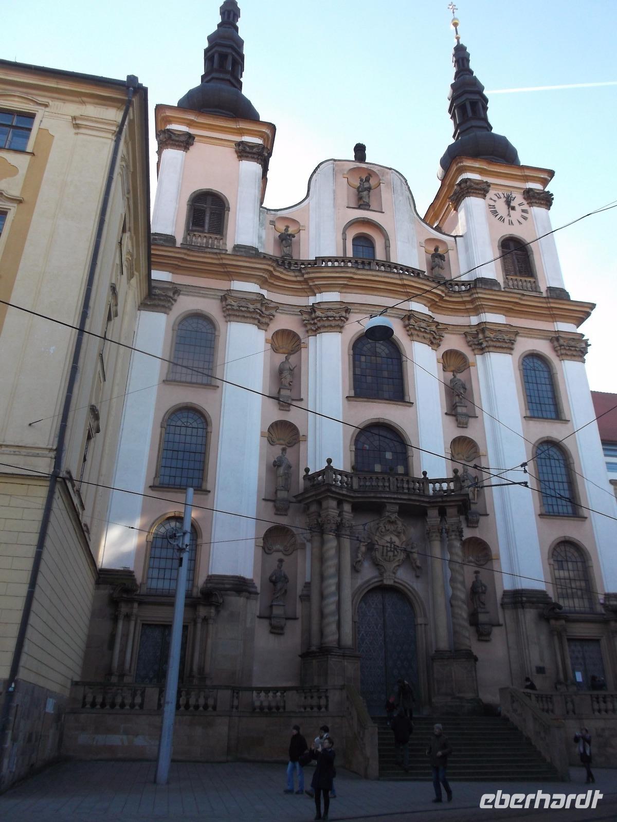 Unser Tagesprogramm begann heute mit einer kleinen Bustour zu einem Vorort vom Olomouc - Svatý Kopecek - der von einer mächtigen Wallfahrtskirche dominiert wird. Der „Heilige Berg" trug seit dem 17. Jh. eine privat gestiftete Marienkapelle, die aber den Wirren des 30jährigen Krieges zum Opfer fiel. Doch schon bald danach wurde sie auf Bestreben des Olmützer Klosters Hradisko neu erbaut und zog bald so viele Pilger an, dass ein regelrechter Wallfahrtsdom auf dem Berg im Auftrag des Olmützer Bischofs errichtet wurde. Die Bauausführung der zweitürmigen barocken Basilikia übernahm der kaiserliche Baumeister Giovanni Pietro Tencalla aus Wien. Verschiedene bekannte italienische und österreichische Bildhauer schufen den Figurenschmuck außen und innen an der Kirche. Nach kurzem Besuch des Heiligen Berges, um dessen Kirche sich seit dem Ende des 18. Jh. ein Dörfchen gebildet hat, kehrten wir nach Olomouc, deutsch Olmütz, zurück, um uns einem kleinen Stadtrundgang zu widmen.