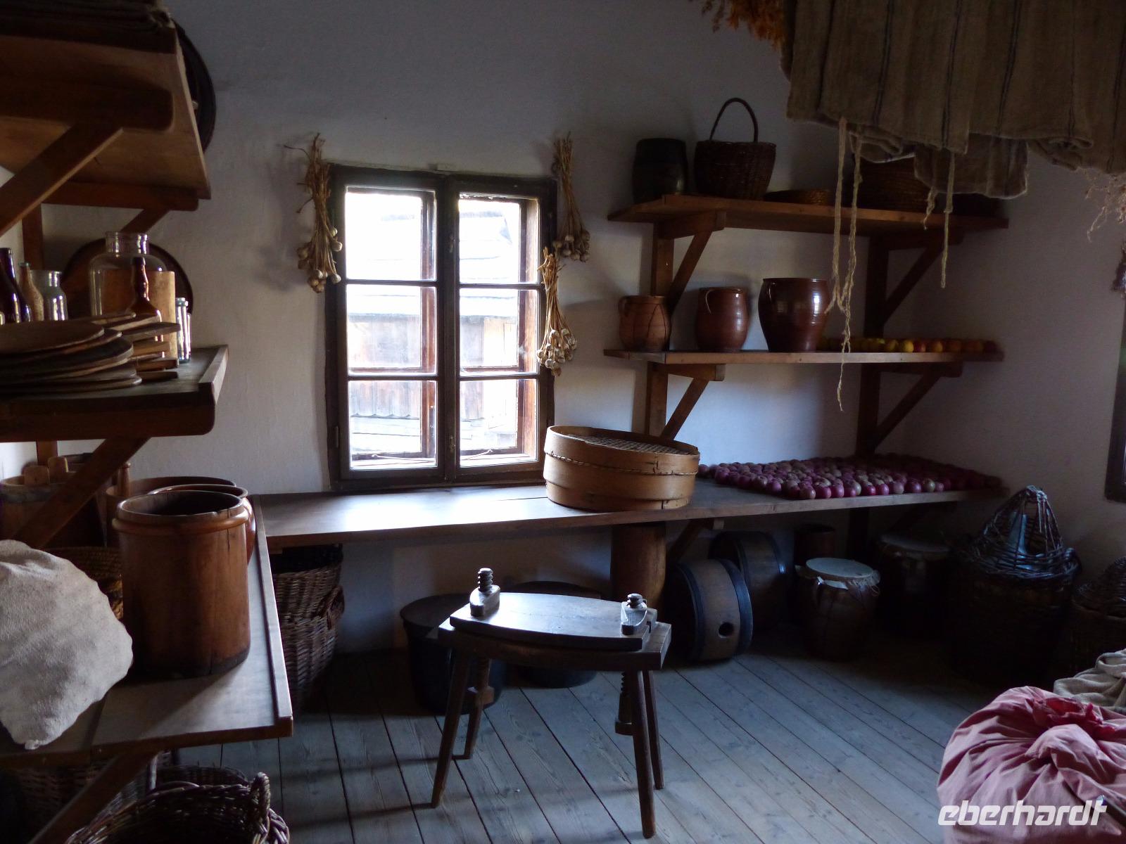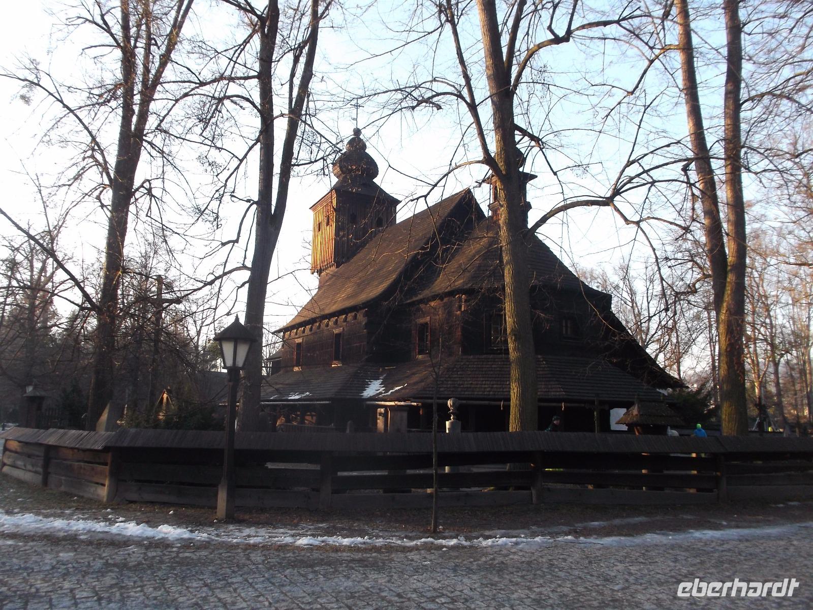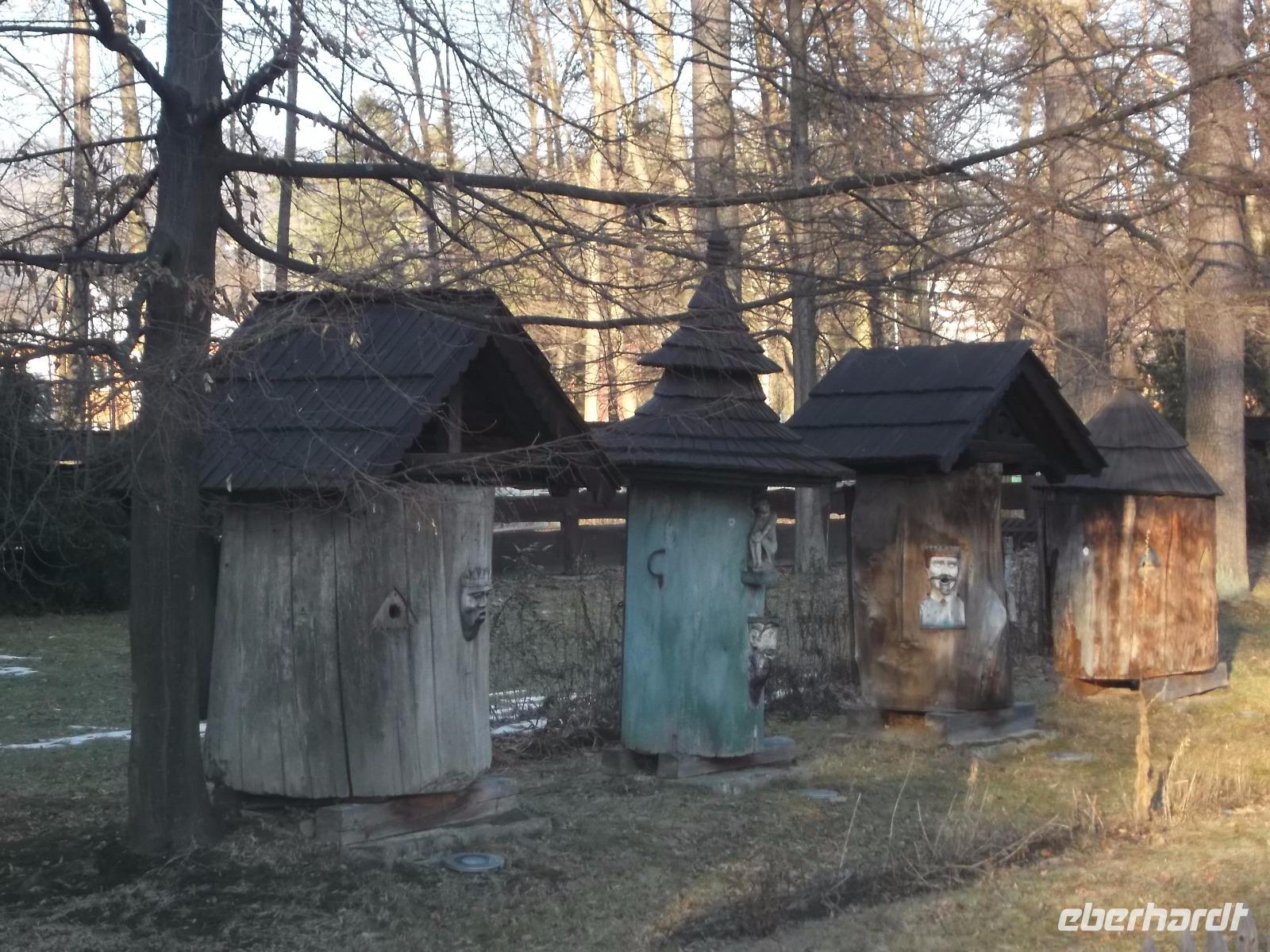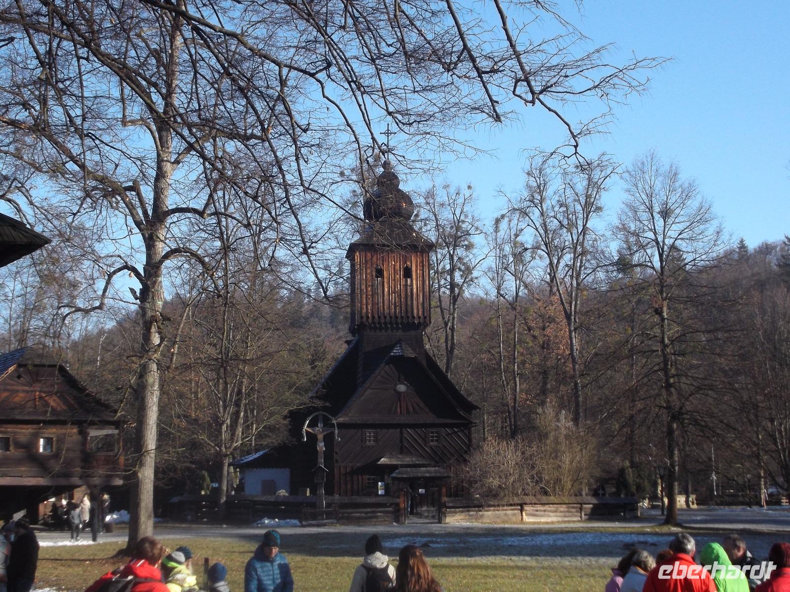 Anschließend konnten wir bei einer kleinen Führung das Volkskunde und Volkskunst-Museum näher kennenlernen, das entstand, nachdem man seit 1925 Wohnhäuser, ein Gasthaus und schließlich mehrere vom Abriss bedrohte, aber erhalten gebliebene Holzgebäude aus der Umgebung hier aufgestellt hatte. So wurden schließlich nicht nur einige Holzbauten vom Rožnover Marktplatz, sondern sogar eine historische, der heiligen Anna gewidmete, Holzkirche hierher gebracht und aufgebaut. In seinem jetzigen Zustand macht das Museum den Eindruck eines völlig intakten Dorfes, in dem wir einige der mit verschiedensten Möbeln und Gebrauchsgegenständen eingerichteten Häuser besichtigen konnten. Durch die Erläuterungen unseres Begleiters Honza lernten wir auch einiges über das tägliche Leben der Walachen und hatten danach noch ein paar Minuten Freizeit, um beispielsweise die ungewöhnlichen historischen Bienenstöcke oder die alte Mühle zu bewundern.