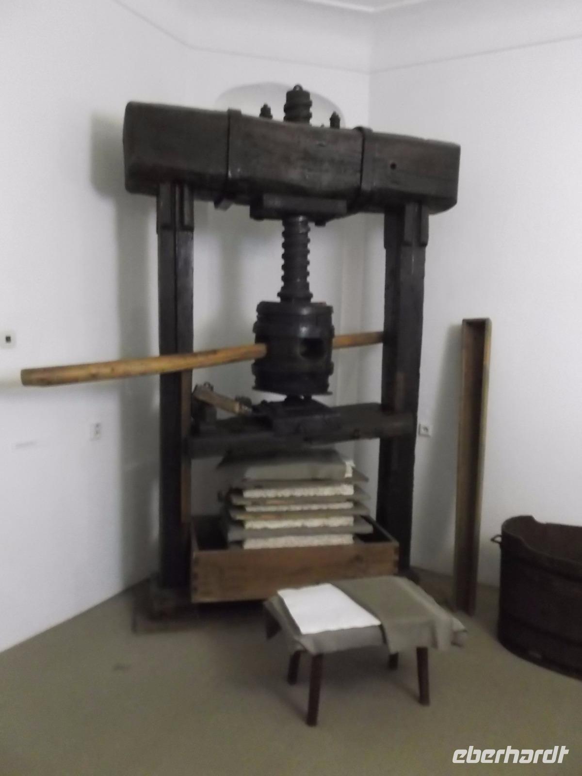 Immer wieder hatten wir Blicke auf die Höhenzüge des Altvatergebirges, bis wir am frühen Nachmittag Velké Losiny erreichtemn, auf Deutsch Groß Ullersdorf. Der von einem großen Schloss - das wir nicht besuchten - beherrschte Ort ist nicht nur etwas unrühmlich für seine ausufernden Hexenprozesse in der Zeit vor dem 30jährigen Krieg bekannt, sondern wesentlich positiver durch eine der ältesten noch arbeitenden Papiermanufakturen Mitteleuropas im Gedächtnis. Handgeschöpftes Büttenpapier wird in der Papiermühle von Velké Losiny in begrenzter Auflage hergestellt, auf dem schon bedeutende Verträge niedergelegt worden sind. Seit dem Ende des 16. Jh. besteht die immer noch produktive Manufaktur, in deren Museum wir bei einer Führung vieles zur Geschichte und Bedeutung der Papierherstellung erfuhren. Auch der „echte" Vorgang der Handschöpfung von Papier lässt sich in der Werkstatt der Museums-Papiermühle beobachten.