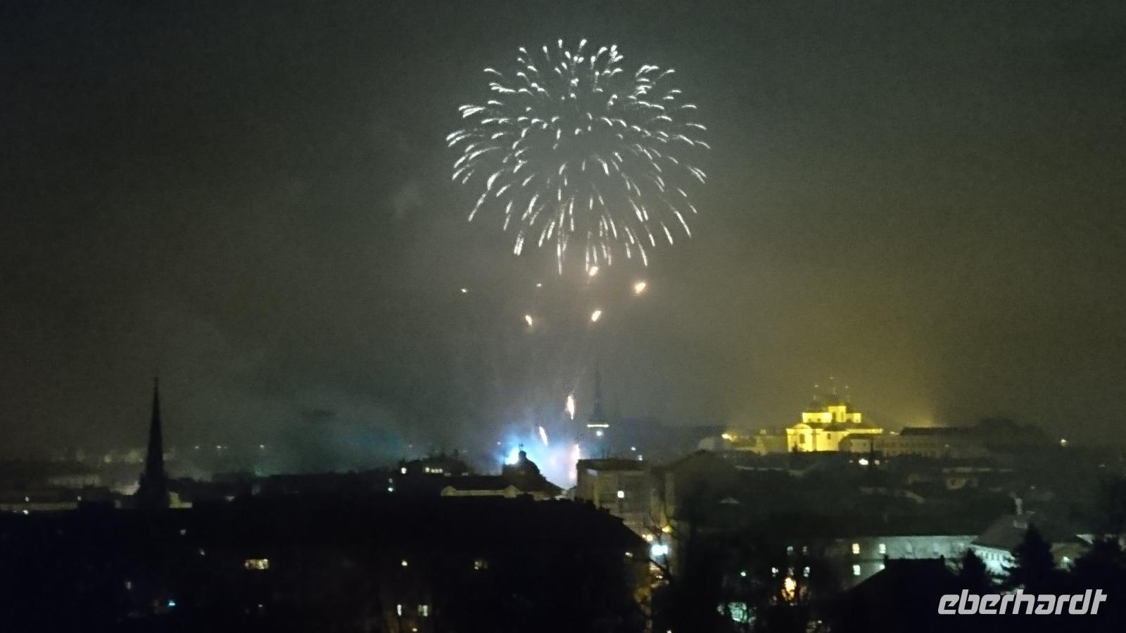 Nach einer langen Silvesternacht begann der Tag etwas später mit einem kleinen Frühstück. Wer Lust hatte, konnte noch einem kleinen Neujahrsbummel in die Stadt oder in den Flora-Park am Hotel unternehmen. Dann trafen wir Lutz, Petr und Stefan an der Rezeption und bald fuhren wir mit unserem Bus gen Roznov pod Radhostem in den Beskiden. Der gestrige Nebel hatte sich etwas verzogen und so sahen wir mehr von den Bergen, als auf unserer Rundfahrt durchs Altvatergebirge. Gegen Mittag erreichten wir Roznov, hielten am Walachischen Freilichtmuseum und besuchten gleich darauf das dortige Restaurant. Hier erwartete man uns bereits und wir ließen uns eine leckere Knoblauchsuppe, ein Knödelgericht und eine Nachspeise nach walachischer Art schmecken. Danach trafen wir bereits unseren Museumsführer, der uns interessante Geschichten erzählte und die alten, teilweise aus Orten der Umgebung hergebrachten Häuser, die Kirche und die Historie des Museums erklärte. Alles konnten wir besichtigen und die Zeit verging schnell. Später saßen wir wieder im Bus und verabschiedeten Petr, der heute nach Hause, also nach Ostrava zurückfuhr. Dann ging es zurück zum Hotel, wo wir uns schon auf das heutige, in Mähren meist erst am Abend des Neujahrstages stattfindende große städtische Feuerwerk in Olomouc freuten. Dieses mehr als zwanzig Minuten andauernde Spektakel mit vielen tollen Lichteffekten über der erleuchteten Altstadt von Olomouc schauten wir uns nach Stefans Organisation aus der oberen Etage des Hotels an, ehe wir noch einmal im Hotelrestaurant gemeinsam zu Abend aßen und uns dann von unseren Gästen mit Eigenanreise verabschiedeten, später den Tag im Restaurant oder bei einem Ortsbummel ausklingen ließen und uns danach zur Ruhe legten.