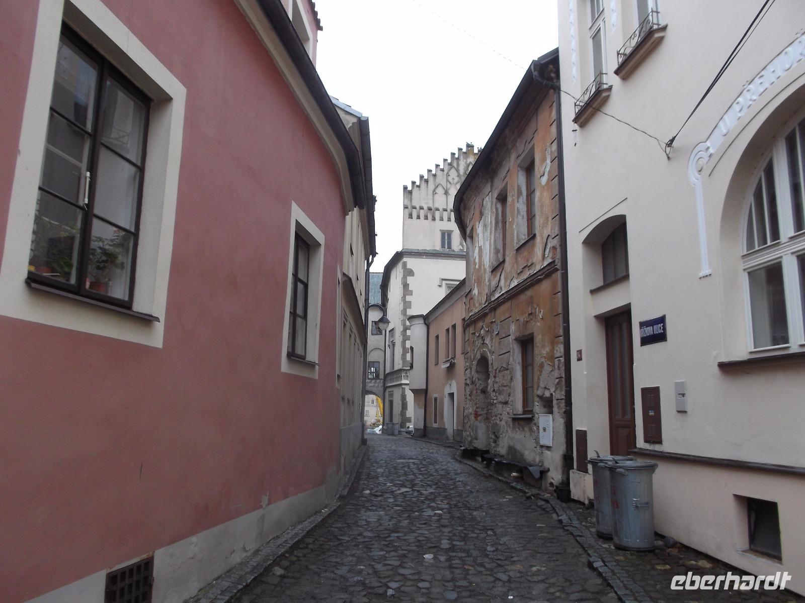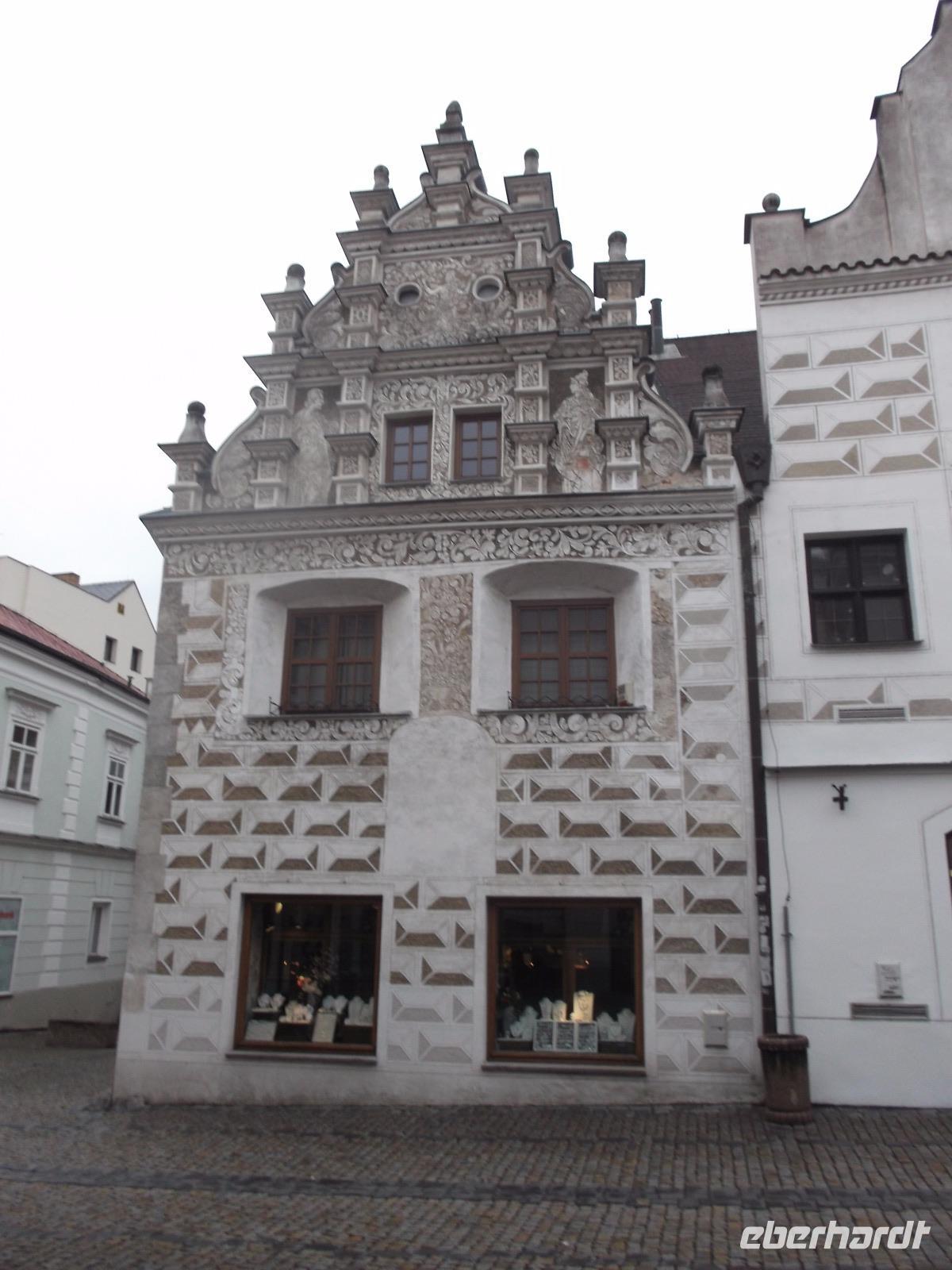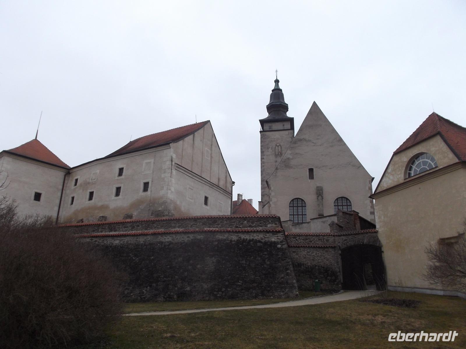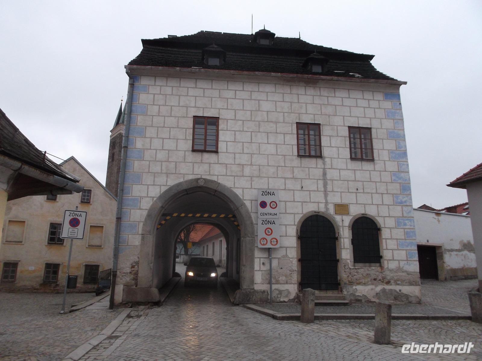 Eine der ersten bemerkenswerten Städte auf der historischen Route nach Wien ist selbst legendär: Tábor. Die Gründer des heute vielleicht 35.000 Einwohner zählenden Städtchens benannten den auf einem Hügel von vornherein als Befestigung errichteten Ort nach dem heiligen Berg der Bibel. Er entstand um 1420, als die später „Hussitenkriege" genannten Erhebungen der in Böhmen entstandenen Anhängerschaft des 1415 auf dem Konzil in Konstanz verbrannten Prager Magisters und Predigers Jan Hus ihre ersten Höhepunkte erreichten. Seit dieser Zeit gilt der Ort als „Hochburg" jener christlichen Glaubensrichtung und ist dies in gewisser Weise bis heute geblieben. Bemerkenswerterweise errichtete man den Ort vom Grundriss her wie eine Wagenburg - und der Legende nach soll er tatsächlich aus diesem von den hussitischen Kriegern gern und erfolgreich genutztem Verteidigungsmittel entstanden sein. Bis heute sieht man es den verschachtelt und mit ganz engen Straßen errichteten Stadtvierteln mit ihren Durchschlüpfen und mitunter tunnelartigen Unterführungen an, dass sie im ausgehenden Mittelalter vor allen zu Verteidigungszwecken entstand. Der große Marktplatz in der Mitte, dominiert von der Kirche mit hohem Turm, einen weiten Blick über die Umgebung ermöglichte und einem bis heute wehrhaft wirkenden Rathaus liegt immer noch fast genau mittig und die Gässchen mit ihren uralten Häusern, die tatsächlich häufig noch aus dem 15. Jh. stammen, laden zum Bummeln ein. Wir besahen uns das Ortszentrum ein wenig und setzten dann unseren Weg von der Region Südböhmen, in der Tábor liegt, ins Gebiet von Mähren fort.