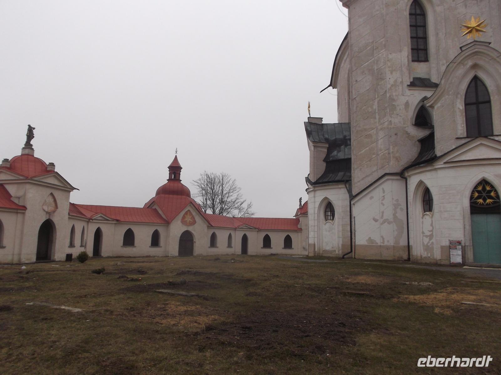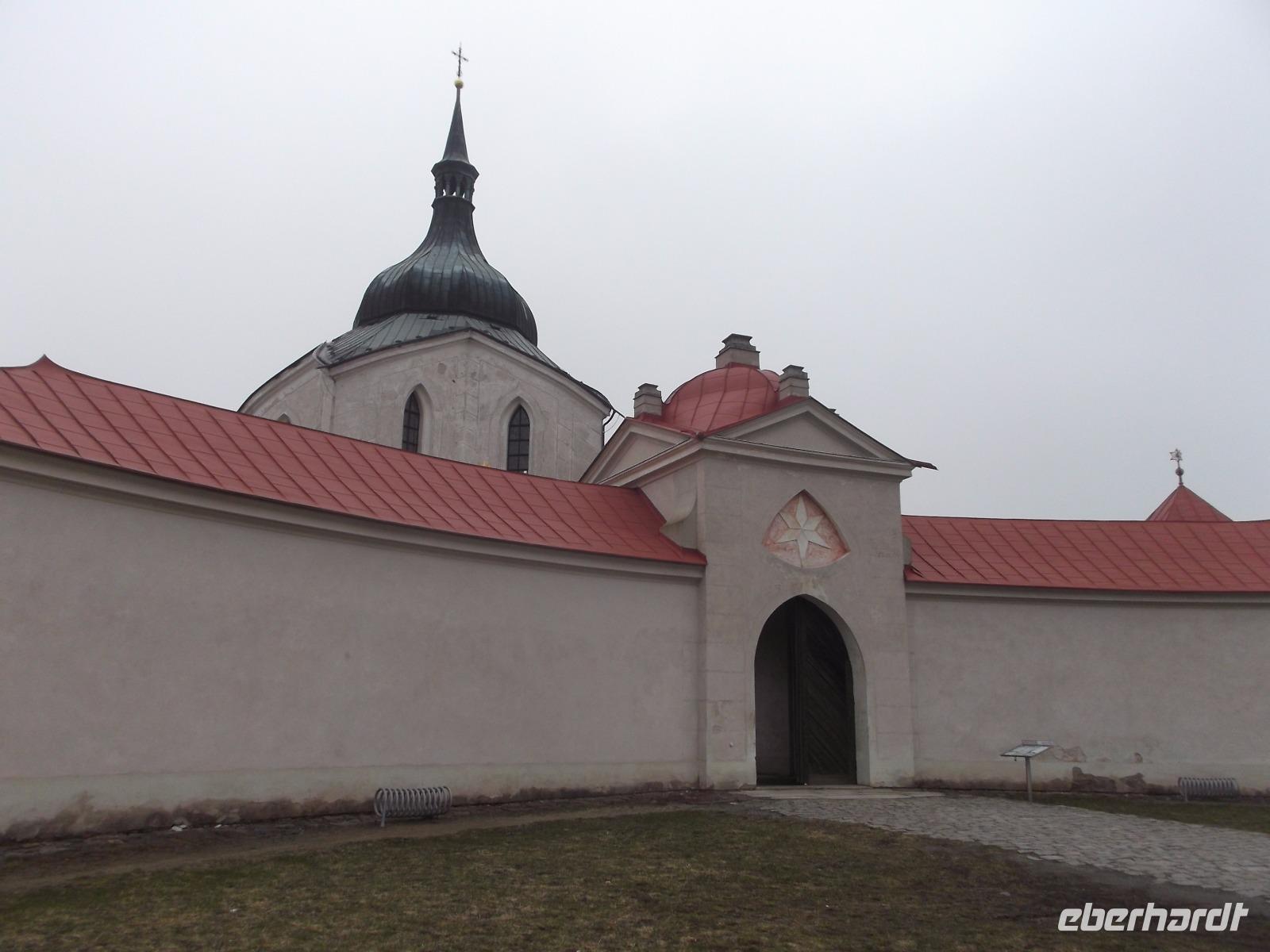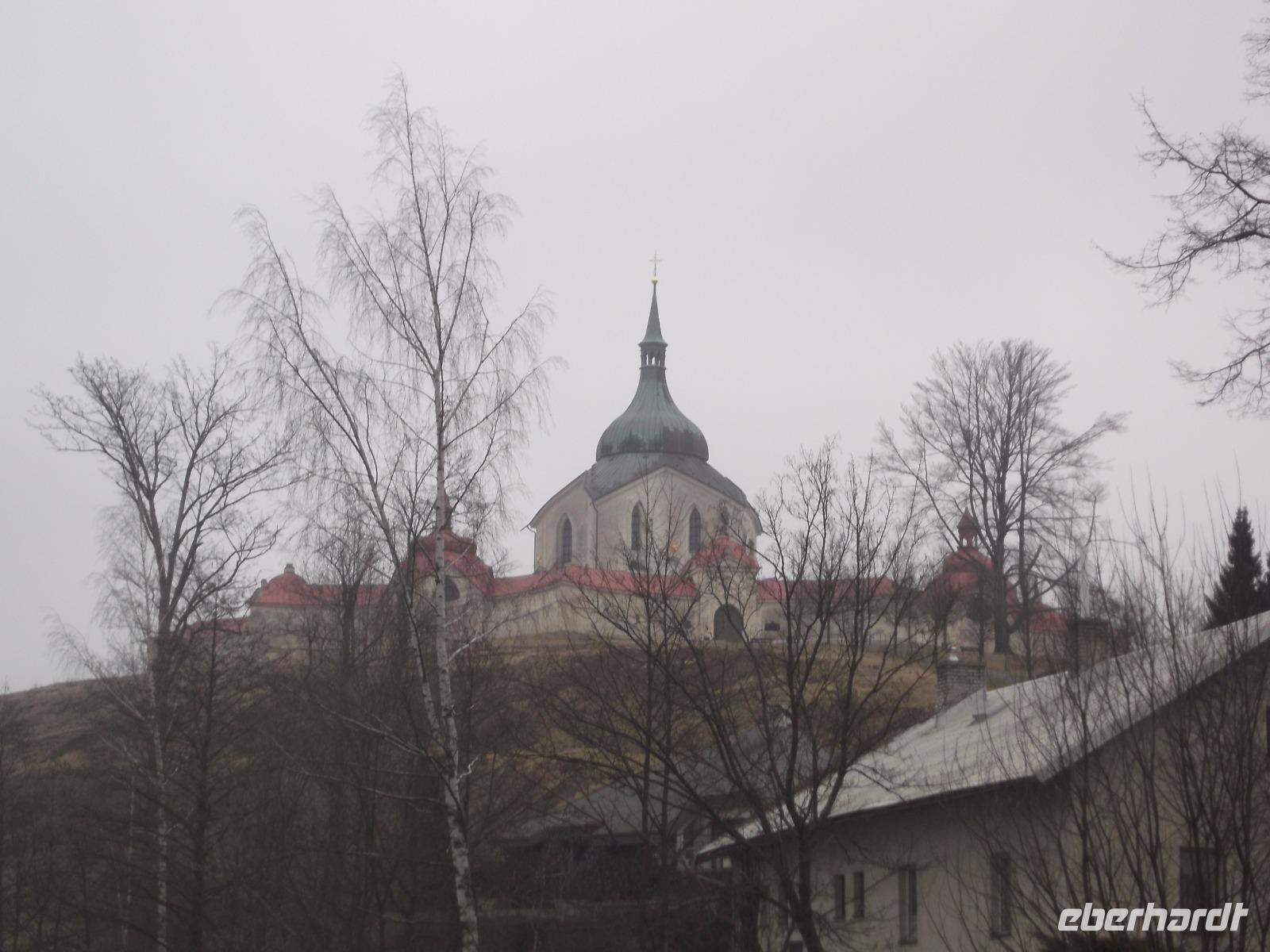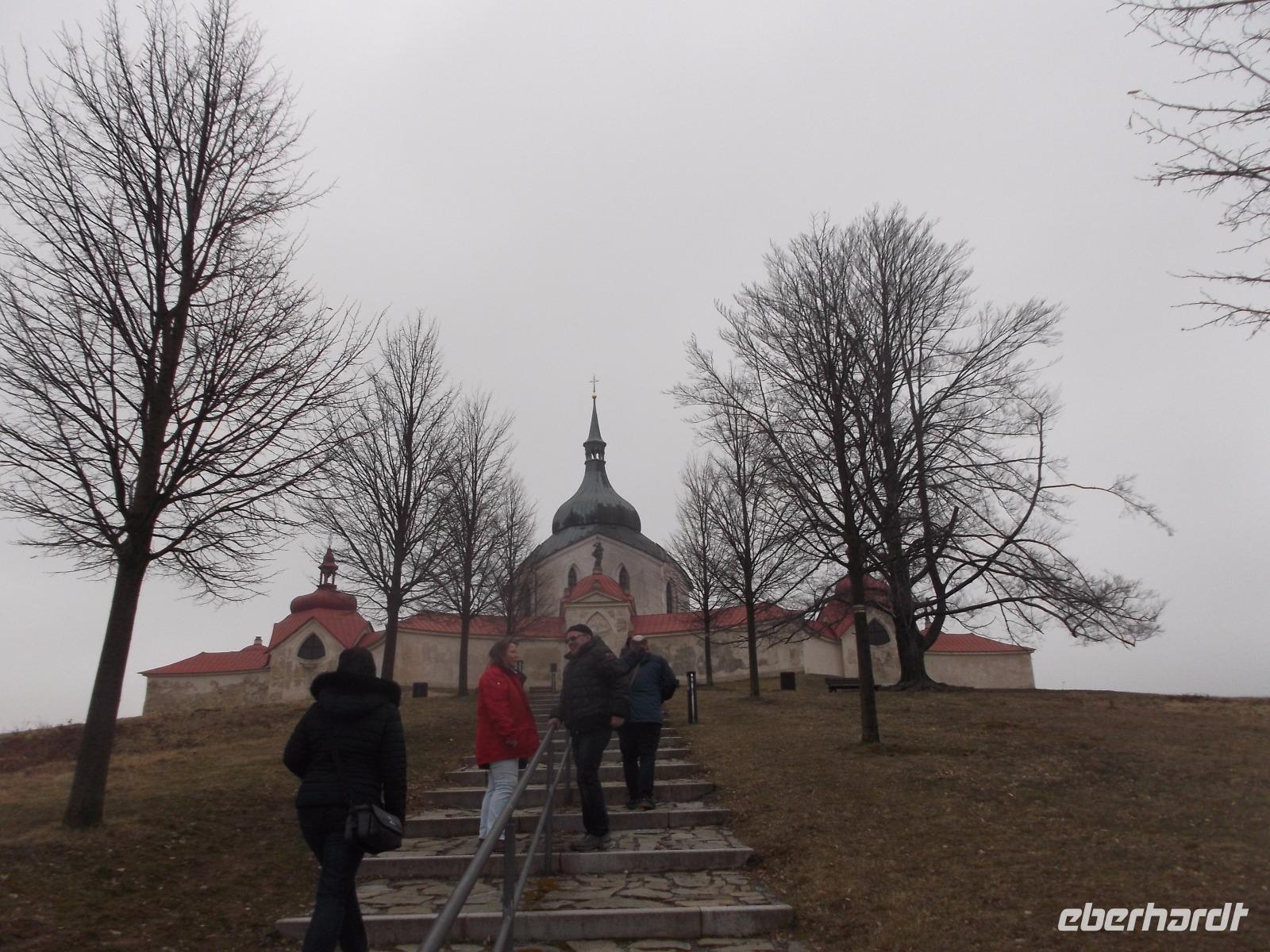 Bei der Weiterfahrt erreichten wir gegen Mittag, von der zuletzt in die Welterbeliste aufgenommenen Stätte Tschechiens eine, die gleich zuerst mit darauf stand: Žd'ár nad Sázavou, heute eine Kreisstadt in einer tschechischen Region, die teilweise auf historisch böhmischem, teilweise mährischem Gebiet liegt, war eins ein kleines auf Deutsch als „Saar" bekanntes Dörfchen, in dessen Nähe schon im Mittelalter ein bedeutendes Zisterzienserkloster lag. Zwar wurde die alte Klosteranlage im späten 18. Jh. säkularisiert und zum Schloss umgebaut, aber direkt daneben befindet sich gut sichtbar auf einem Berg eine außergewöhnliche Wallfahrtskirche. Ebenfalls im 18. Jh. entstanden sollte sie die Verehrung des Nationalheiligen Johannes Nepomuk verbreiten. Wohl deshalb wurde der ursprünglich anders heißende Berg umbenannt in Zelená Hora (Grüner Berg) - nach Nepomuks Geburtsort. Auf diesem wiederum wurde eine Kirche in ganz besonderem Stil erbaut - die übrigens schon 1994 auf die Liste des UNESCO-Weltkulturerbes gesetzt wurde. Sie gilt in Europa als einzigartig, weist sie doch eine sehr eigenwillige und ungewohnte Mischung aus gotischen und barocken Stilelementen auf und sieht in der Draufsicht bzw. als Grundriss fast aus wie eine Blüte. Sie ist eines der Hauptwerke des böhmischen Malers und Architekten Johann Blasius Santini-Aichl. Ihrem aus Prag stammenden Schöpfer, der auch an einigen anderen bedeutenden Kirchen, Palästen und Schlössern in Tschechien mitwirkte, gelang hier eine einzigartig gestaltete Anlage, in der er die im 18. Jh. in Böhmen beliebte und bekannte „Nepomuk-Symbolik" mit Sternen und oft auch die damit verbundenen Zahlen drei und fünf in seiner Architektur verwendete. Den Grund hierfür sieht man in der Heiligen-Legende, dass fünf Sterne oder Flammen den Leichnam des als Märtyrer gestorbenen Johannes Nepomuk umgeben hätten, als man seinen Körper in der Moldau fand...