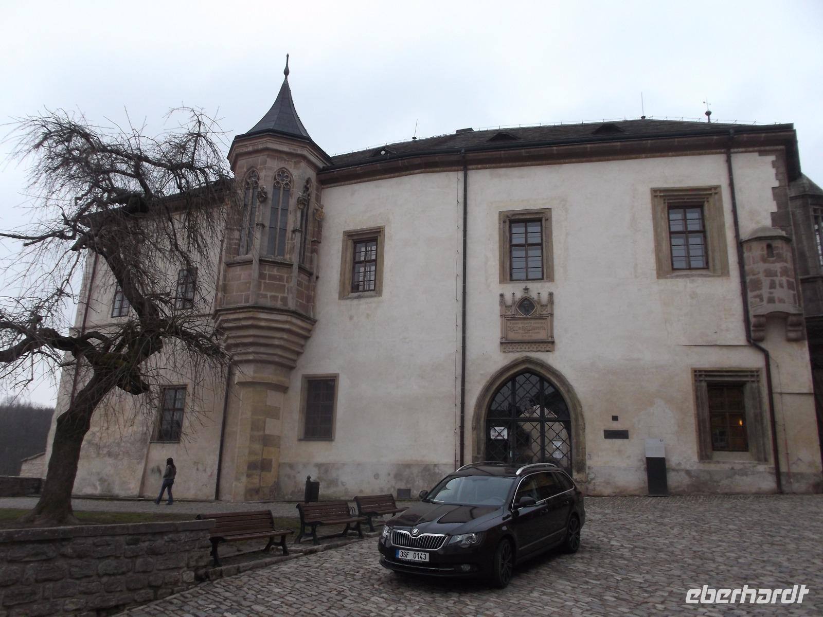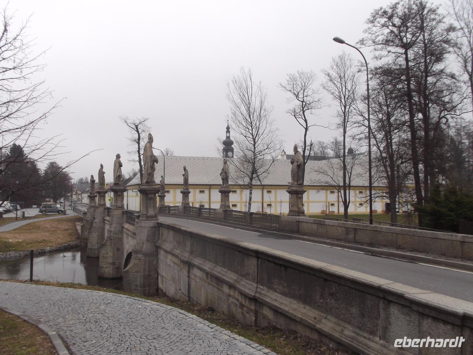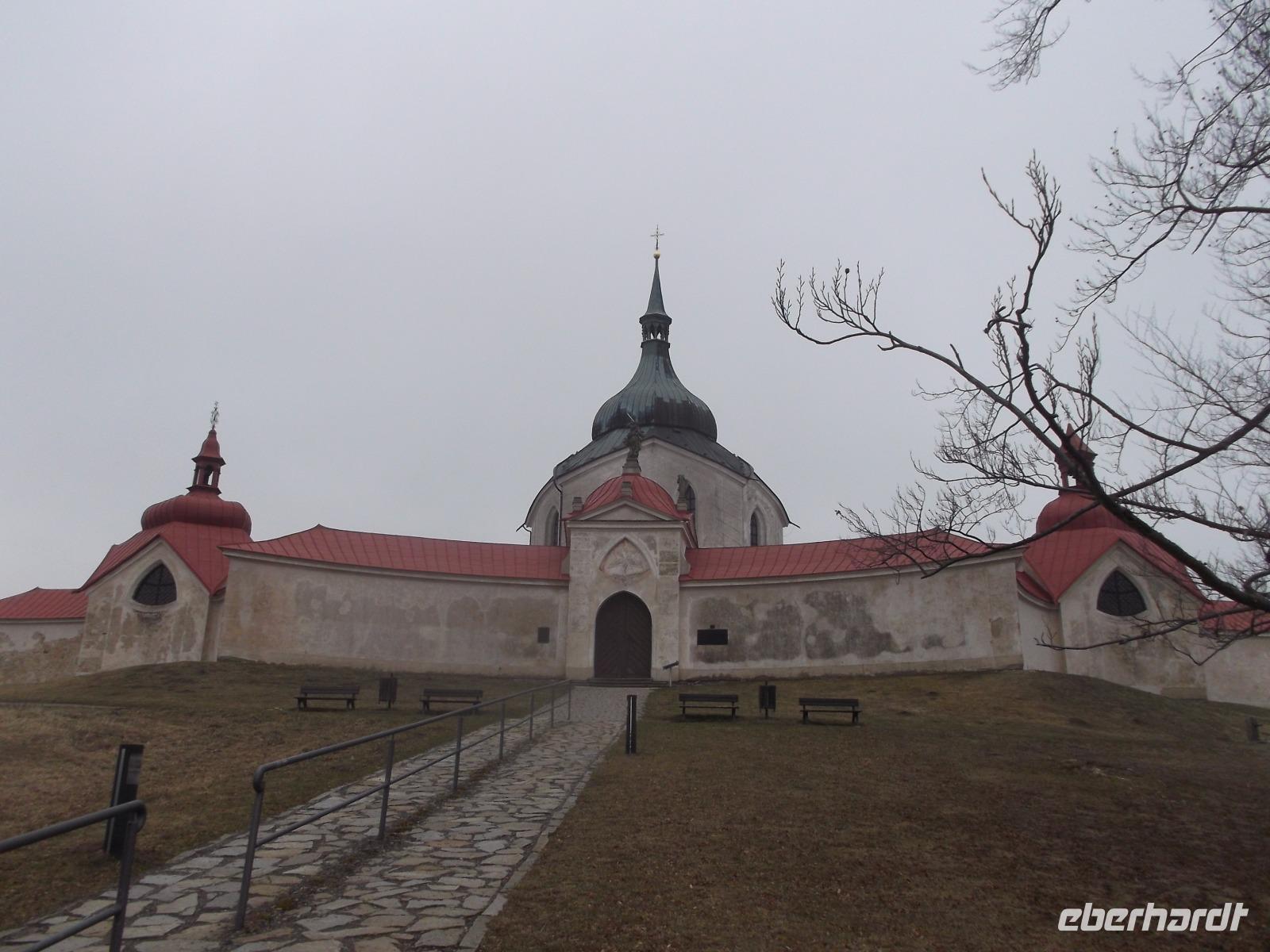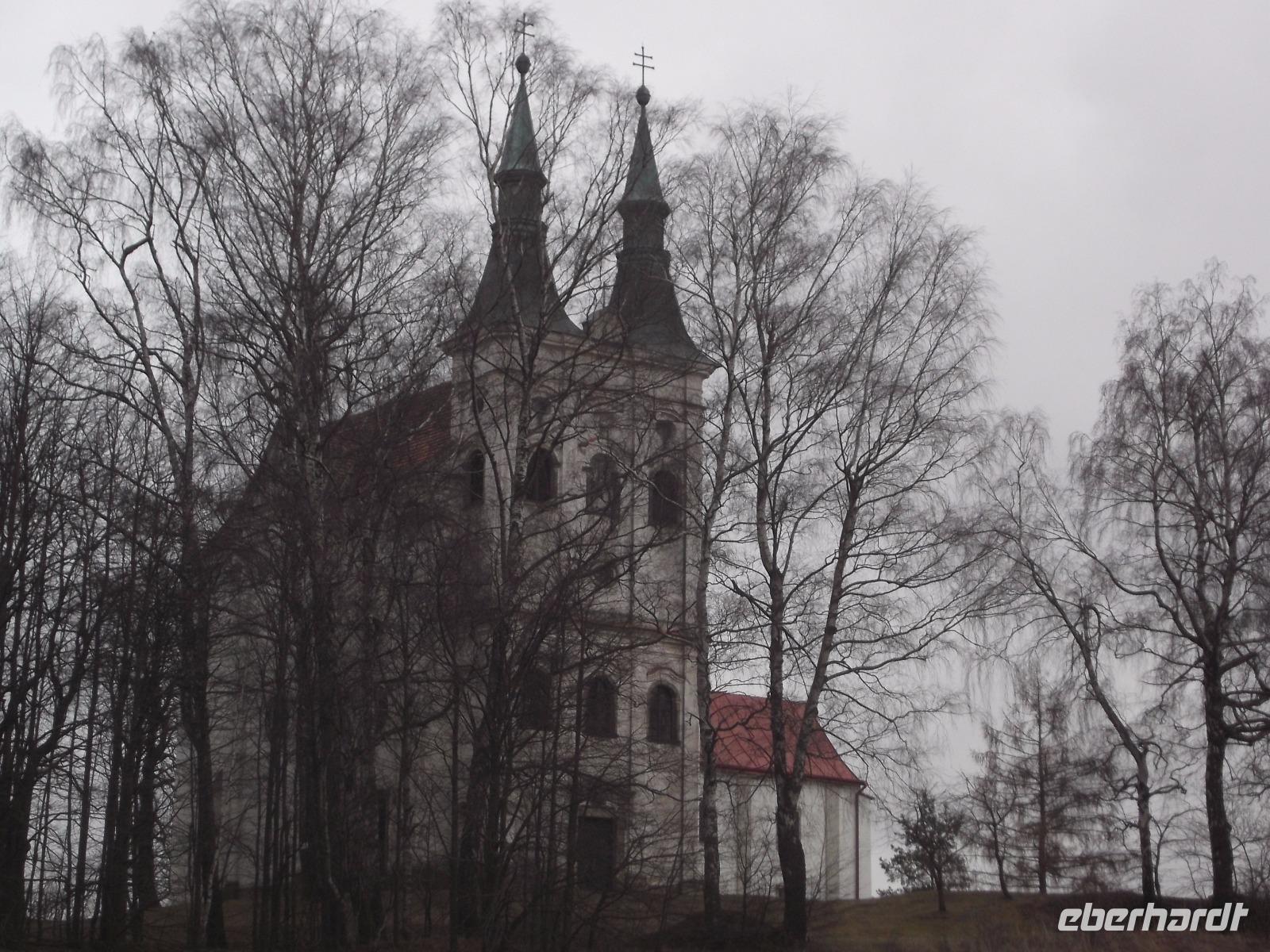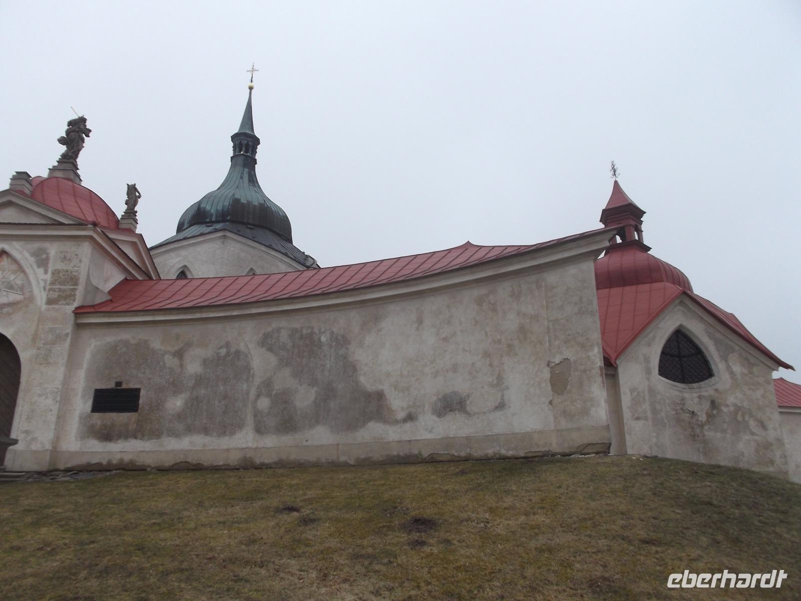 Bei der Weiterfahrt erreichten wir gegen Mittag, von der zuletzt in die Welterbeliste aufgenommenen Stätte Tschechiens eine, die gleich zuerst mit darauf stand: Žd'ár nad Sázavou, heute eine Kreisstadt in einer tschechischen Region, die teilweise auf historisch böhmischem, teilweise mährischem Gebiet liegt, war eins ein kleines auf Deutsch als „Saar" bekanntes Dörfchen, in dessen Nähe schon im Mittelalter ein bedeutendes Zisterzienserkloster lag. Zwar wurde die alte Klosteranlage im späten 18. Jh. säkularisiert und zum Schloss umgebaut, aber direkt daneben befindet sich gut sichtbar auf einem Berg eine außergewöhnliche Wallfahrtskirche. Ebenfalls im 18. Jh. entstanden sollte sie die Verehrung des Nationalheiligen Johannes Nepomuk verbreiten. Wohl deshalb wurde der ursprünglich anders heißende Berg umbenannt in Zelená Hora (Grüner Berg) - nach Nepomuks Geburtsort. Auf diesem wiederum wurde eine Kirche in ganz besonderem Stil erbaut - die übrigens schon 1994 auf die Liste des UNESCO-Weltkulturerbes gesetzt wurde. Sie gilt in Europa als einzigartig, weist sie doch eine sehr eigenwillige und ungewohnte Mischung aus gotischen und barocken Stilelementen auf und sieht in der Draufsicht bzw. als Grundriss fast aus wie eine Blüte. Sie ist eines der Hauptwerke des böhmischen Malers und Architekten Johann Blasius Santini-Aichl. Ihrem aus Prag stammenden Schöpfer, der auch an einigen anderen bedeutenden Kirchen, Palästen und Schlössern in Tschechien mitwirkte, gelang hier eine einzigartig gestaltete Anlage, in der er die im 18. Jh. in Böhmen beliebte und bekannte „Nepomuk-Symbolik" mit Sternen und oft auch die damit verbundenen Zahlen drei und fünf in seiner Architektur verwendete. Den Grund hierfür sieht man in der Heiligen-Legende, dass fünf Sterne oder Flammen den Leichnam des als Märtyrer gestorbenen Johannes Nepomuk umgeben hätten, als man seinen Körper in der Moldau fand...