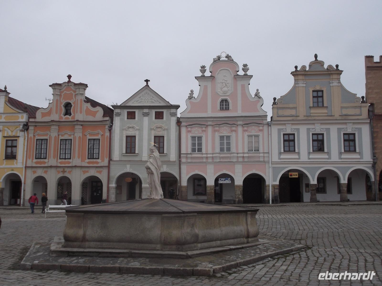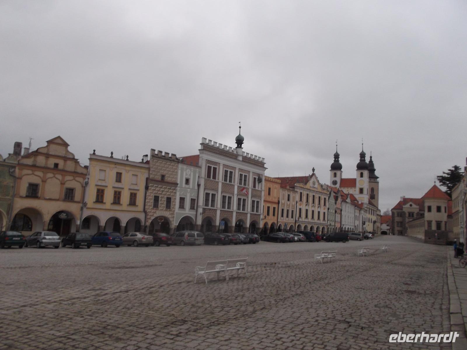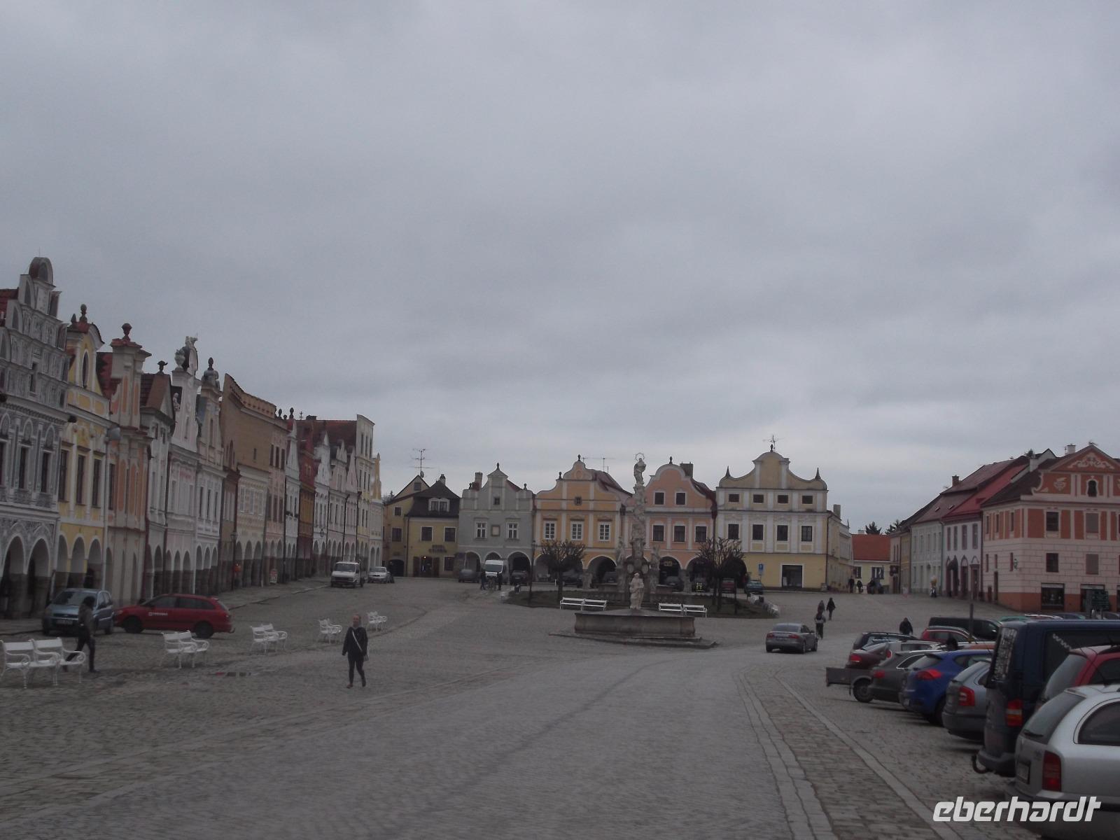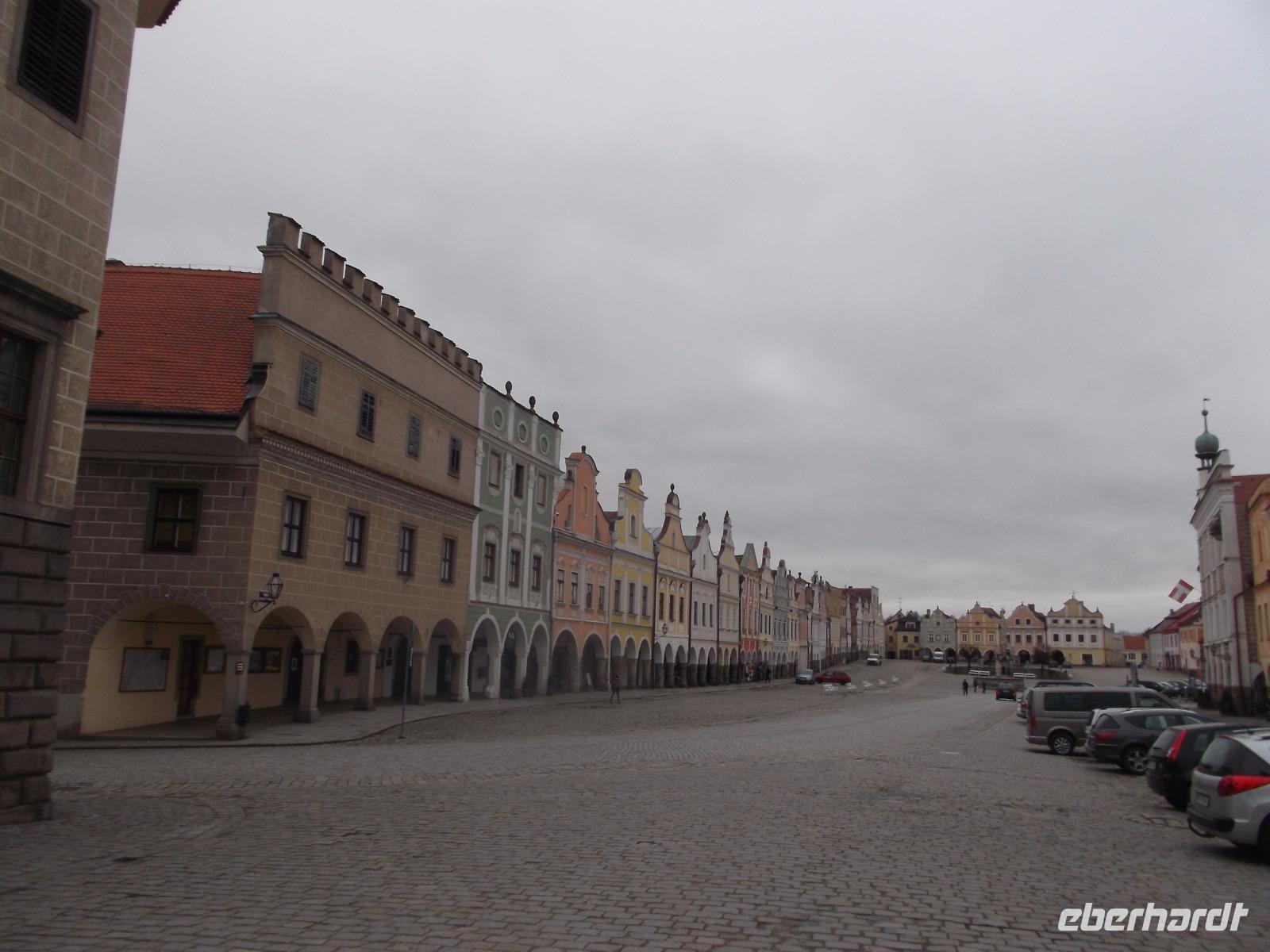 Schon seit 1992 zum UNESCO-Welterbe erklärt, bilden die historische Innenstadt und der riesige Altstadt-Markt von Telc eines der wertvollsten städtischen Denkmalreservate Tschechiens und zählen zu den „Prunkstücken" der Region Mähren. Von einem burgähnlichen Schloss im Renaissancestil dominiert, weiten sich das Stadtbild und sein riesiger, fast einem langgezogenen Dreieck entsprechender Markt völlig anders als wir das eben noch in der im Verhältnis kleiner und fast rund wirkenden Innenstadt von Tábor kennengelernt hatten. Man sieht Markt und Altstadt ihre Vergangenheit als wichtiger Handelsposten an einer der Hauptrouten von Böhmen nach Mähren förmlich an. Einen unverwechselbaren Eindruck hinterlassen die bunten, hervorragend in Renaissance- oder Barockstil erhaltenen Häuser und ihre geheimnisvoll wirkenden Arkadengänge. Gut kann man sich hier mittelalterliches Markttreiben vorstellen und ist doch überrascht von der schieren Größe des Marktplatzes, der tatsächlich zu räumlich größten ihrer Art in Europa gehört. Aber auch das Schloss, dem man seine einstige Wehrhaftigkeit noch ansieht und die ebenfalls zum Welterbe gehörende Kirche der Gottesmutter (Kostel Matky Boží) sind sehr beeindruckend und vervollständigen den Eindruck einer mittelalterlichen Handelshochburg - ein Gegensatz zum vorher gesehenen Ort, der von seiner Einwohnerzahl her sogar bedeutend größer war...