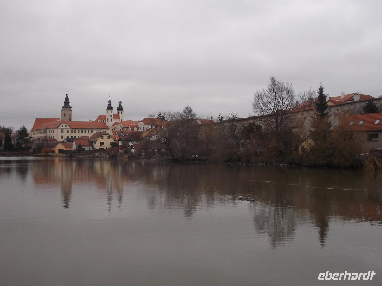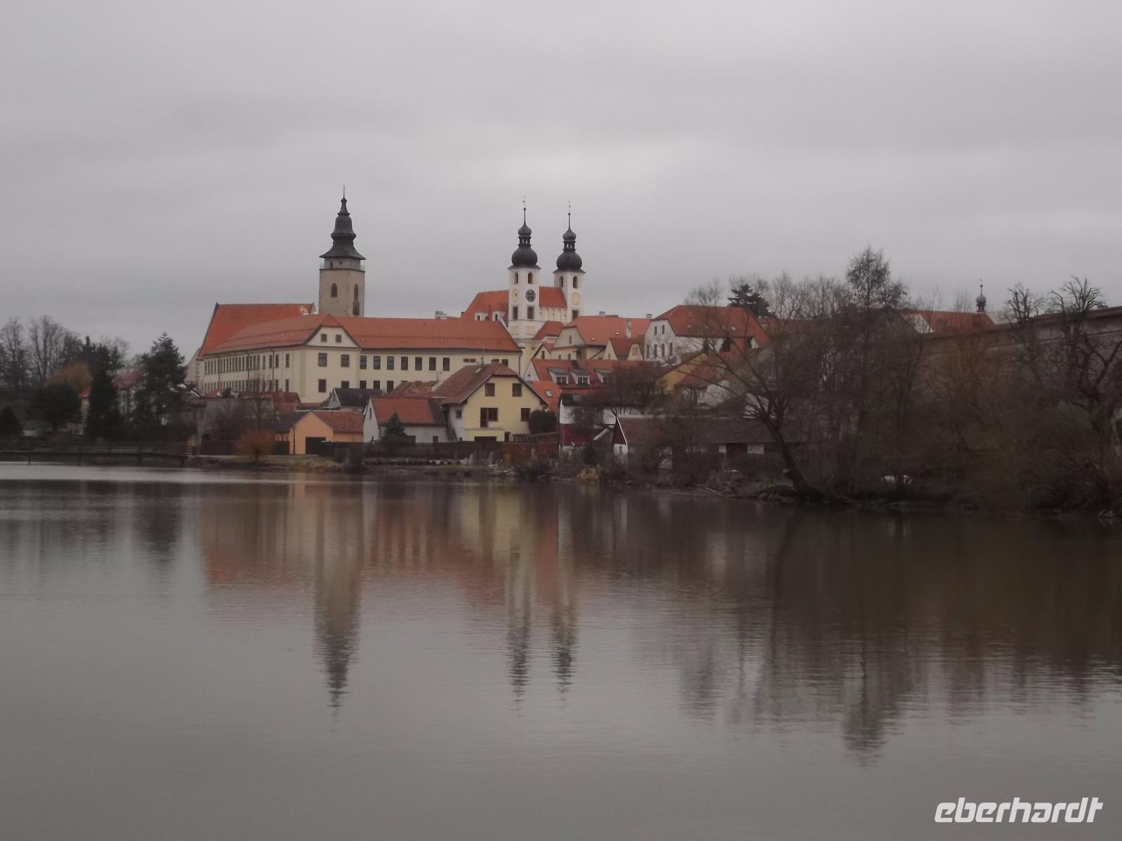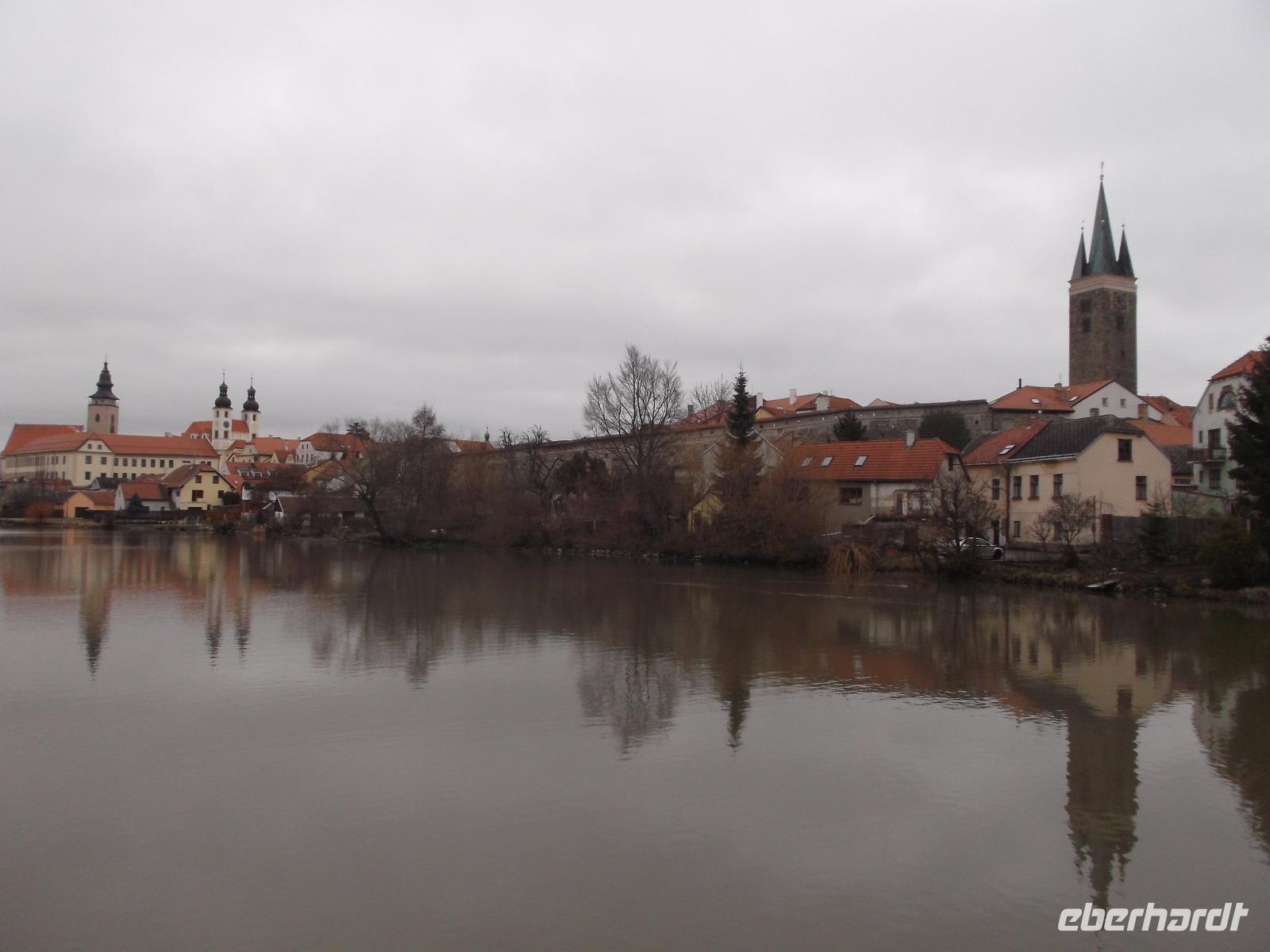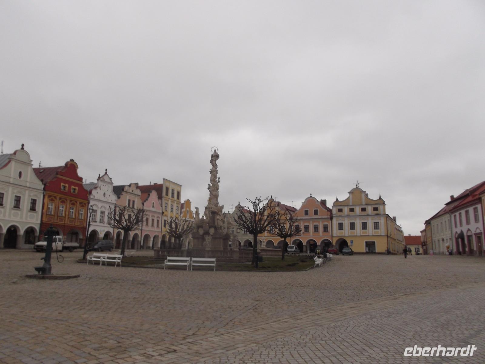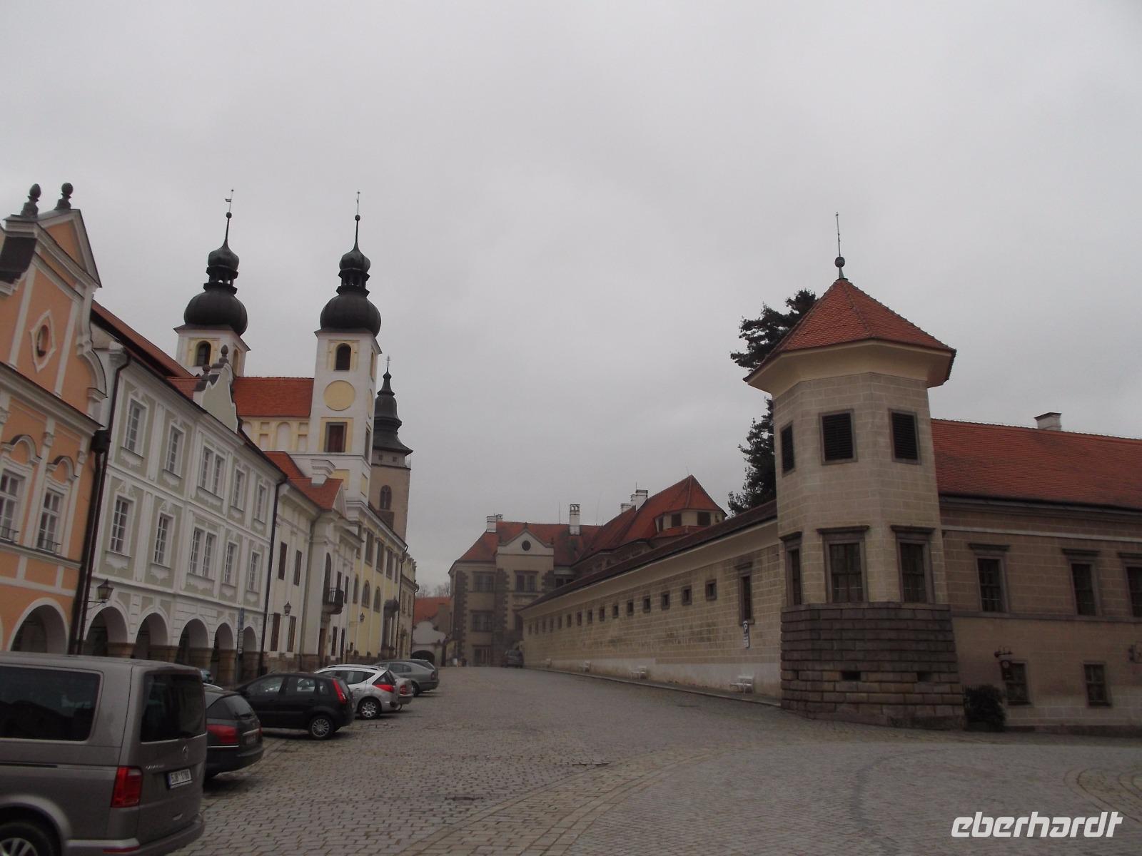 Schon seit 1992 zum UNESCO-Welterbe erklärt, bilden die historische Innenstadt und der riesige Altstadt-Markt von Telc eines der wertvollsten städtischen Denkmalreservate Tschechiens und zählen zu den „Prunkstücken" der Region Mähren. Von einem burgähnlichen Schloss im Renaissancestil dominiert, weiten sich das Stadtbild und sein riesiger, fast einem langgezogenen Dreieck entsprechender Markt völlig anders als wir das eben noch in der im Verhältnis kleiner und fast rund wirkenden Innenstadt von Tábor kennengelernt hatten. Man sieht Markt und Altstadt ihre Vergangenheit als wichtiger Handelsposten an einer der Hauptrouten von Böhmen nach Mähren förmlich an. Einen unverwechselbaren Eindruck hinterlassen die bunten, hervorragend in Renaissance- oder Barockstil erhaltenen Häuser und ihre geheimnisvoll wirkenden Arkadengänge. Gut kann man sich hier mittelalterliches Markttreiben vorstellen und ist doch überrascht von der schieren Größe des Marktplatzes, der tatsächlich zu räumlich größten ihrer Art in Europa gehört. Aber auch das Schloss, dem man seine einstige Wehrhaftigkeit noch ansieht und die ebenfalls zum Welterbe gehörende Kirche der Gottesmutter (Kostel Matky Boží) sind sehr beeindruckend und vervollständigen den Eindruck einer mittelalterlichen Handelshochburg - ein Gegensatz zum vorher gesehenen Ort, der von seiner Einwohnerzahl her sogar bedeutend größer war...