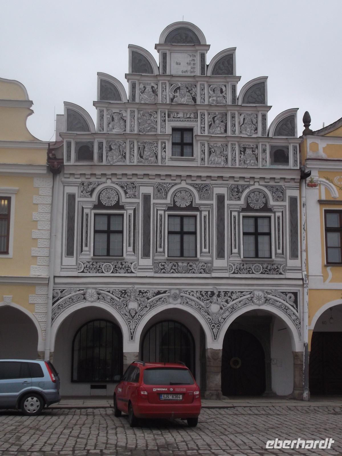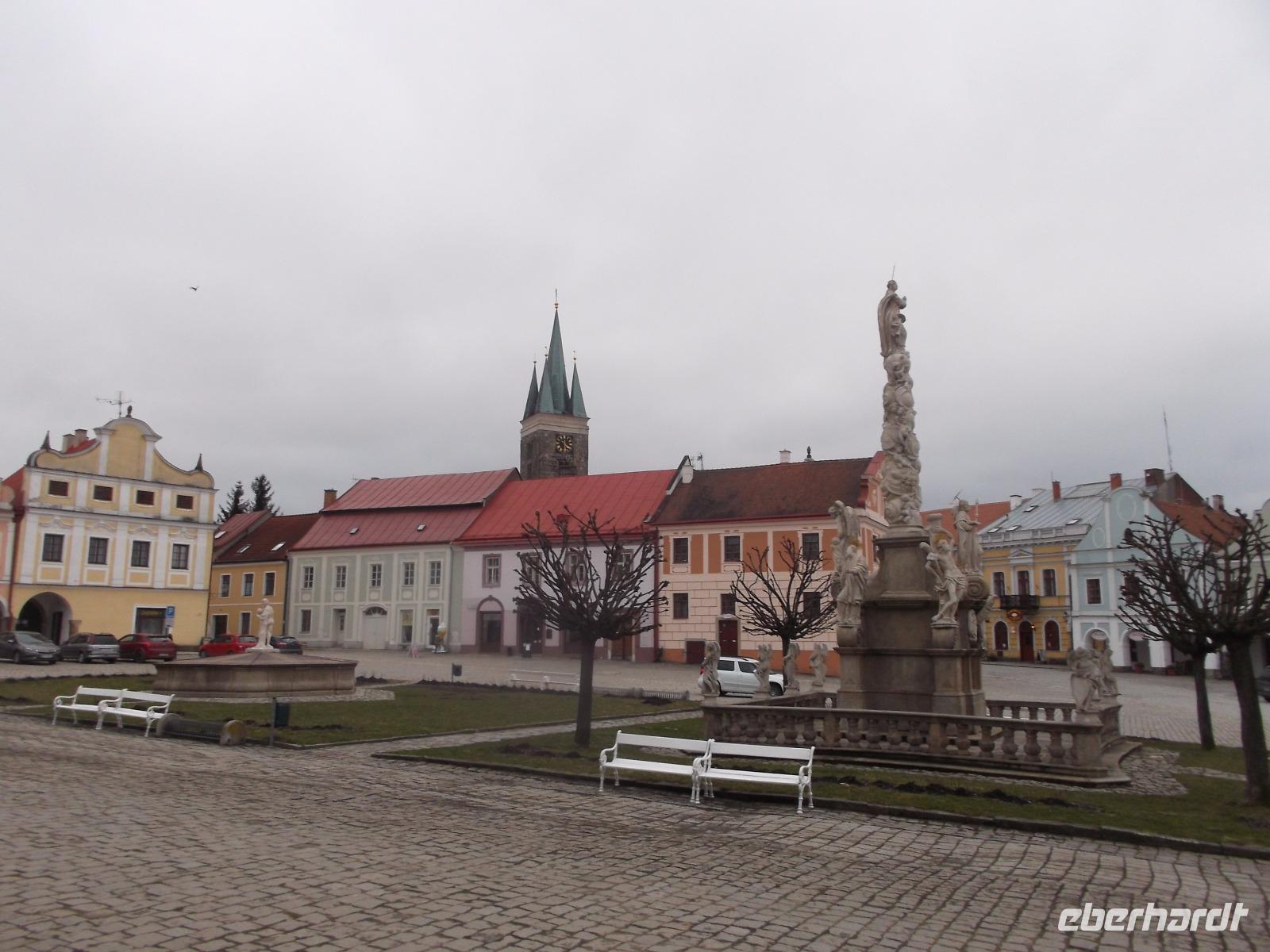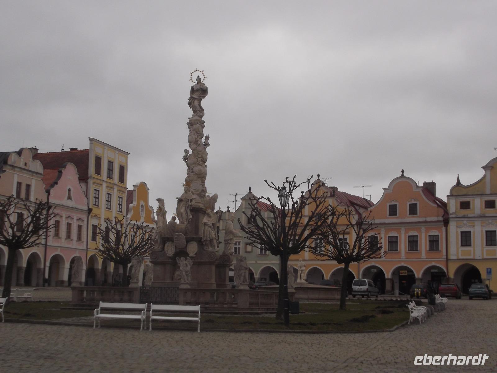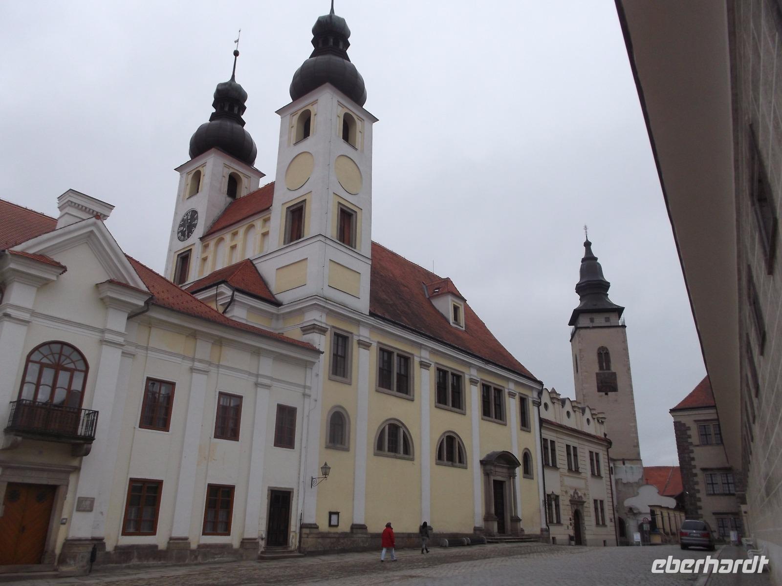 Schon seit 1992 zum UNESCO-Welterbe erklärt, bilden die historische Innenstadt und der riesige Altstadt-Markt von Telc eines der wertvollsten städtischen Denkmalreservate Tschechiens und zählen zu den „Prunkstücken" der Region Mähren. Von einem burgähnlichen Schloss im Renaissancestil dominiert, weiten sich das Stadtbild und sein riesiger, fast einem langgezogenen Dreieck entsprechender Markt völlig anders als wir das eben noch in der im Verhältnis kleiner und fast rund wirkenden Innenstadt von Tábor kennengelernt hatten. Man sieht Markt und Altstadt ihre Vergangenheit als wichtiger Handelsposten an einer der Hauptrouten von Böhmen nach Mähren förmlich an. Einen unverwechselbaren Eindruck hinterlassen die bunten, hervorragend in Renaissance- oder Barockstil erhaltenen Häuser und ihre geheimnisvoll wirkenden Arkadengänge. Gut kann man sich hier mittelalterliches Markttreiben vorstellen und ist doch überrascht von der schieren Größe des Marktplatzes, der tatsächlich zu räumlich größten ihrer Art in Europa gehört. Aber auch das Schloss, dem man seine einstige Wehrhaftigkeit noch ansieht und die ebenfalls zum Welterbe gehörende Kirche der Gottesmutter (Kostel Matky Boží) sind sehr beeindruckend und vervollständigen den Eindruck einer mittelalterlichen Handelshochburg - ein Gegensatz zum vorher gesehenen Ort, der von seiner Einwohnerzahl her sogar bedeutend größer war...