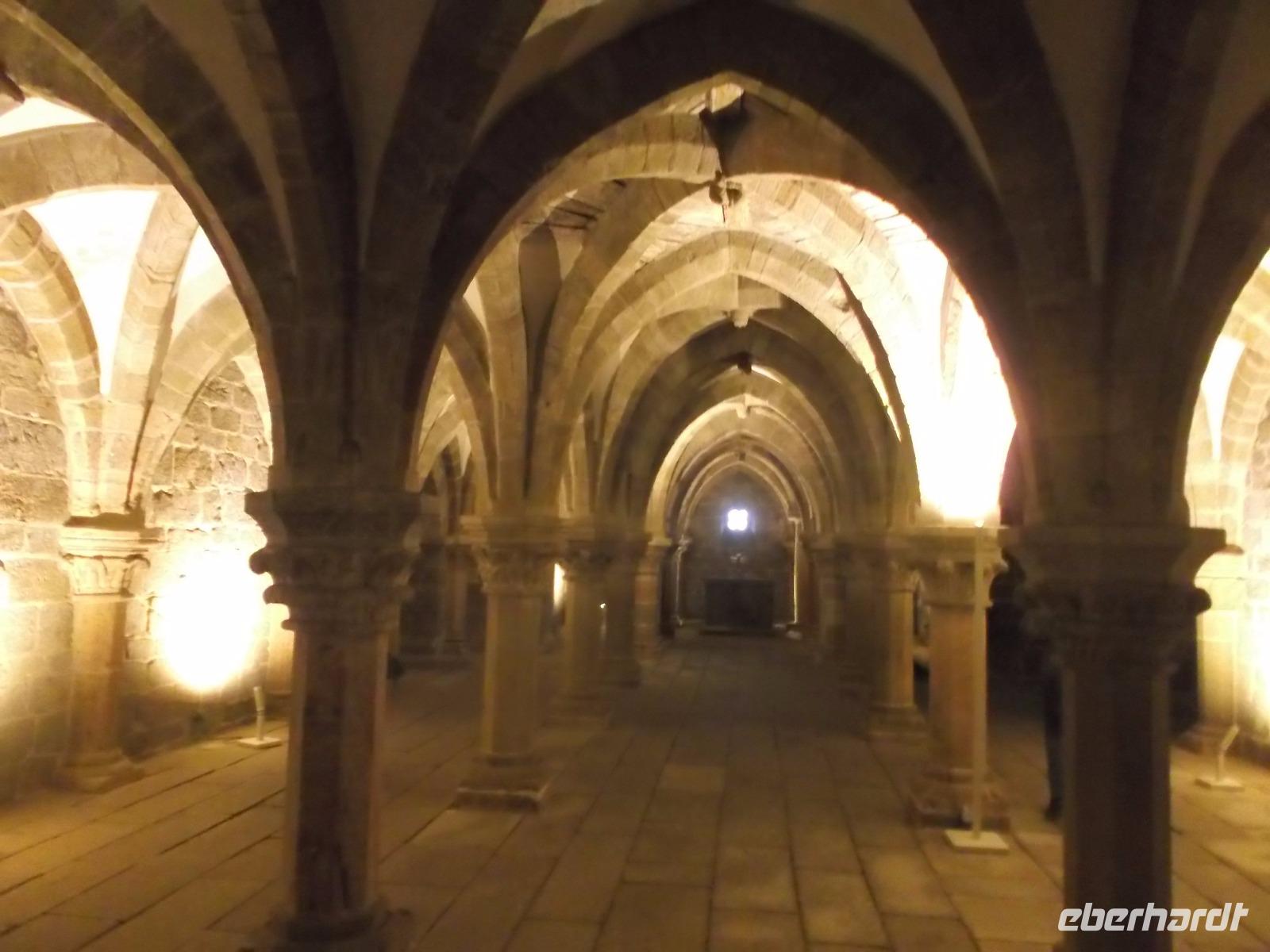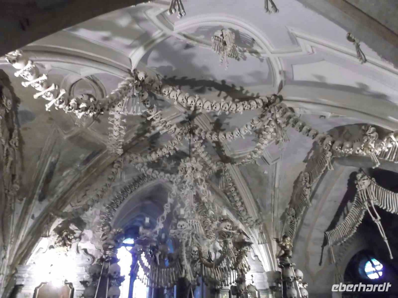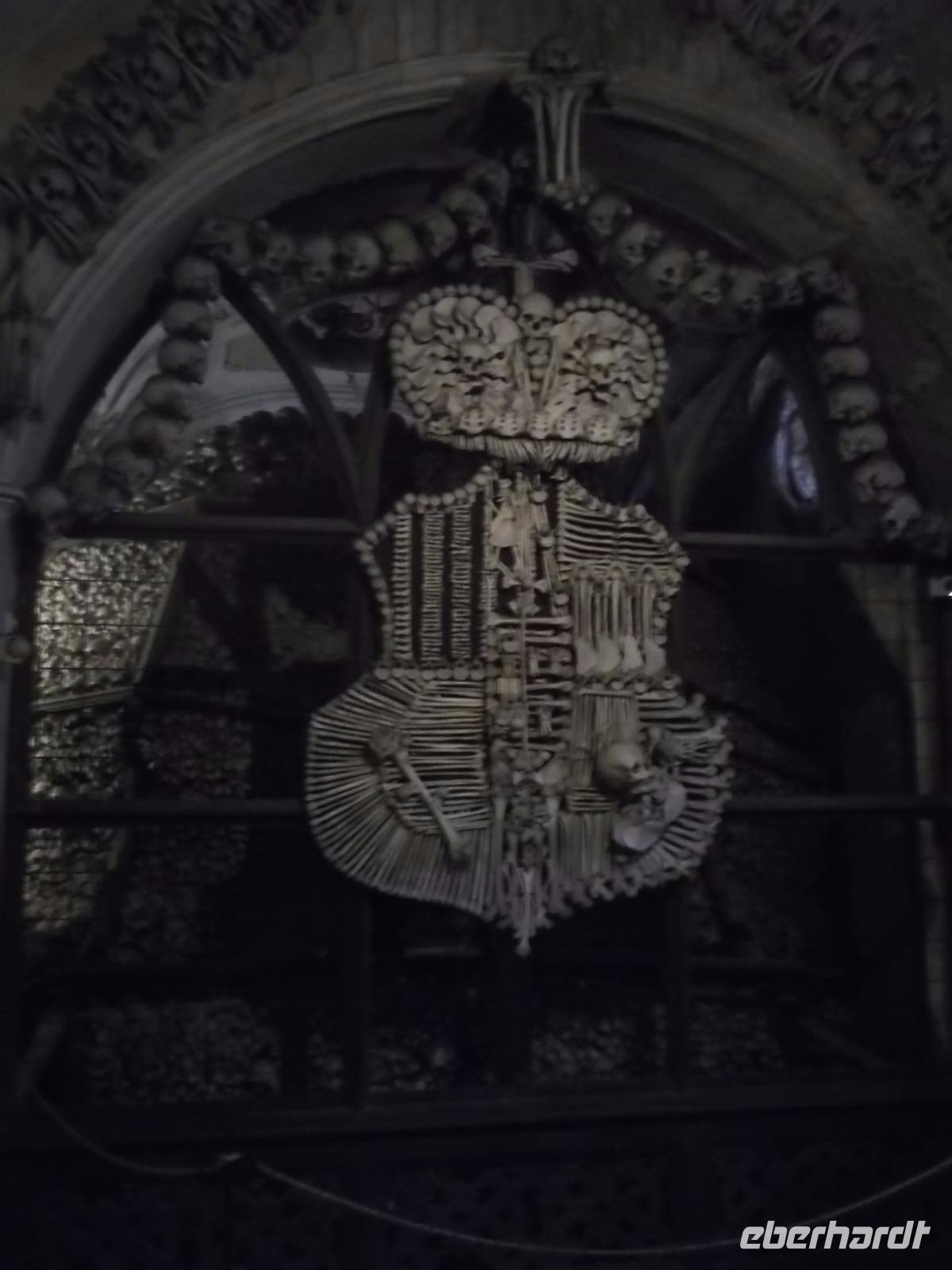 Dann setzten wir unsere Fahrt nach Kutná Hora fort und besichtigten hier im Vorort Sedlec die ebenfalls sehr seltsame Knochenkirche. Als „Beinhaus (oder Ossuarium) von Sedletz" bekannt, befindet sich der gruftähnliche Sakralbau im Untergeschoss bzw. Krypta der Allerheiligenkirche auf dem Friedhof des zu Kutná Hora gehörenden und einst selbständigen Ortes Sedlec. Unter Kennern ist sie berühmt: die Kirche wurde von ebenjenem Architekten Santini-Aichl erbaut, der auch die blütenartige Nepomuk-Kirche erbaute - aber hier werden fast 40.000 menschliche Skelette im gruft- oder kellerähnlichen Beinhaus aufbewahrt und sind zu Dekorationseinheiten gestapelt. Über 10.000 menschliche Schädel und zugehörige Gebeine benutzte um 1870. dann der Holzschnitzer und Tischler František Rint, als er vom Fürsten von Schwarzenberg mit dem Ordnender hier aufbewahrten Skelette beauftragt wurde. Er verarbeitete die Gebeine durchaus künstlerisch und schuf Dekorationen und Einrichtungsgegenstände wie glockenförmige Altäre, Girlanden, Kronleuchter und sogar das Schwarzenberger Wappen - äußerst originell, aber zugegeben auch makaber und etwas gruselig wirkend...