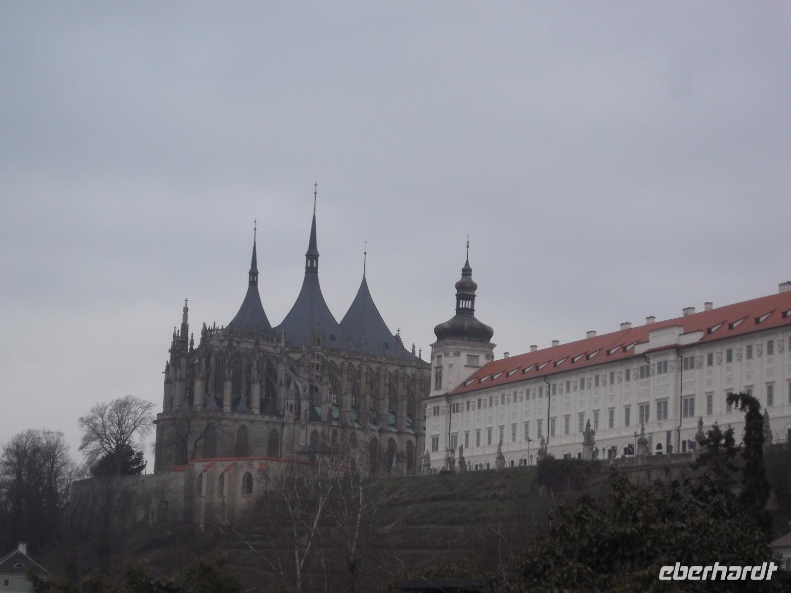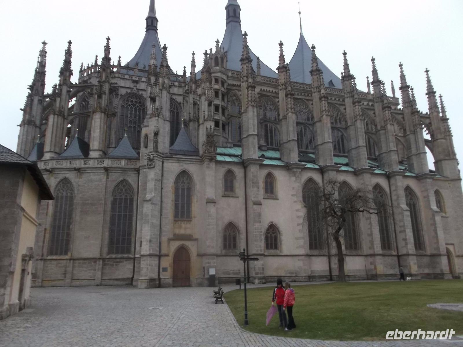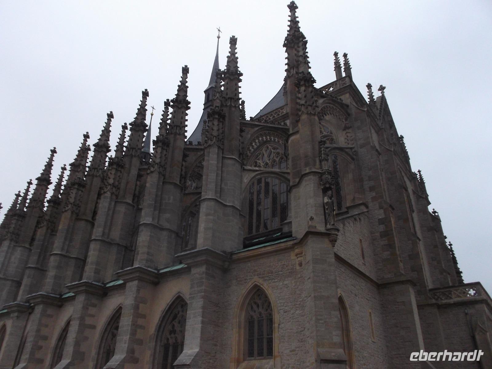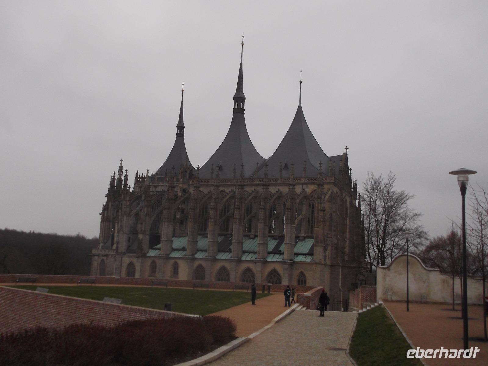 Das zweifellos imposanteste Gebäude in Kutná Hora aber ist der am Ende dieses Weges liegende und aufgrund seiner exponierten Lage weithin sichtbare Dom. Im Stil der Gotik nach französischem Vorbild begann man ihn ab kurz vor 1400 zu errichten und widmete ihn der Heiligen Barbara, der Schutzpatronin der Bergleute. Nach kriegsbedingten Bauunterbrechungen dauerte es lange, bis an ihm weitergearbeitet wurde, aber schließlich brach man den Bau ganz ab abbrach und vollendete das dennoch imposante Sakralbauwerk mit einer ungewöhnlichen, in drei Spitzen auslaufenden Dachkonstruktion - und ließ es ohne Turm!