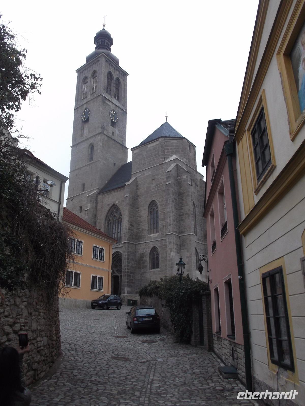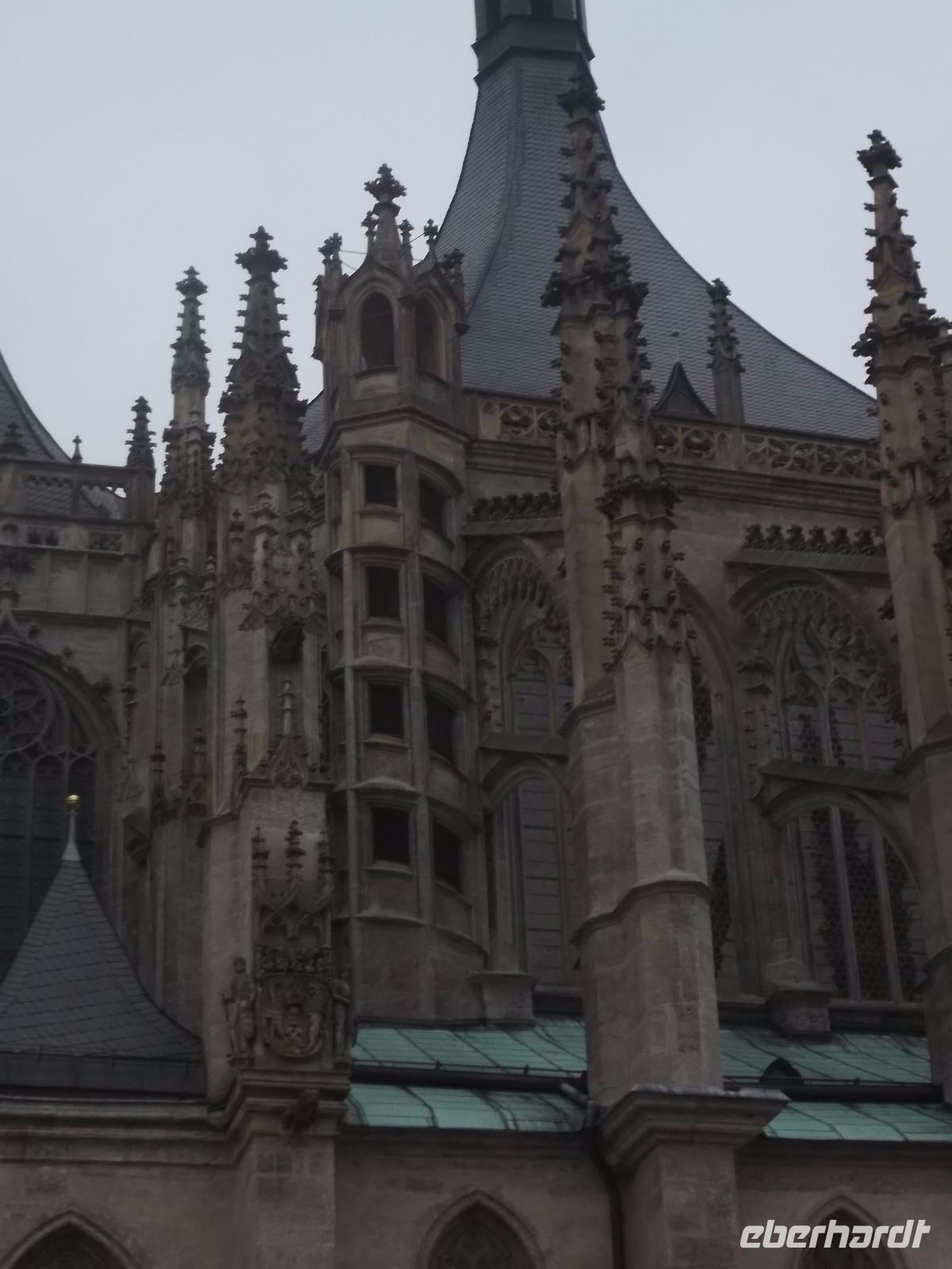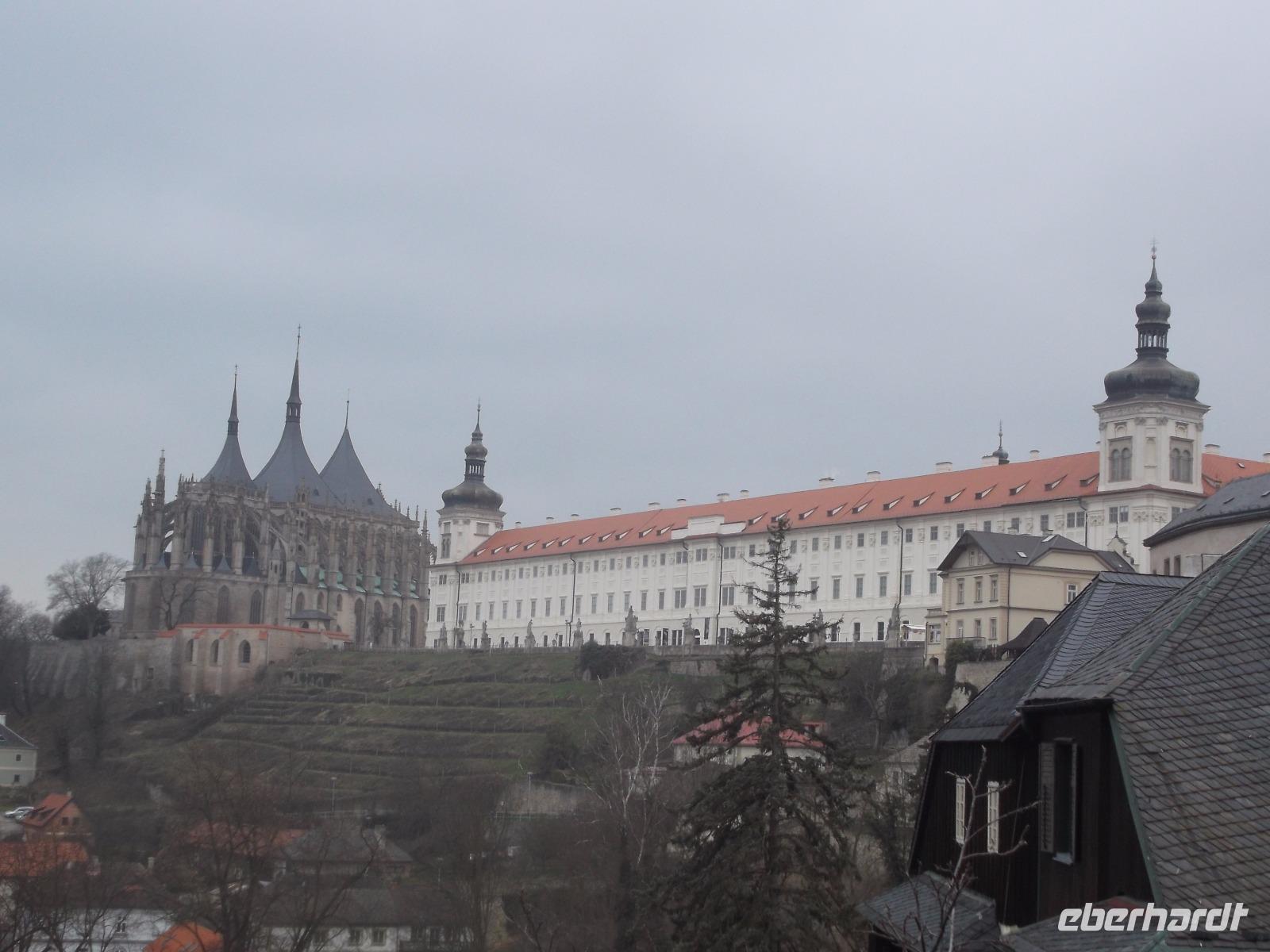 Das zweifellos imposanteste Gebäude in Kutná Hora aber ist der am Ende dieses Weges liegende und aufgrund seiner exponierten Lage weithin sichtbare Dom. Im Stil der Gotik nach französischem Vorbild begann man ihn ab kurz vor 1400 zu errichten und widmete ihn der Heiligen Barbara, der Schutzpatronin der Bergleute. Nach kriegsbedingten Bauunterbrechungen dauerte es lange, bis an ihm weitergearbeitet wurde, aber schließlich brach man den Bau ganz ab abbrach und vollendete das dennoch imposante Sakralbauwerk mit einer ungewöhnlichen, in drei Spitzen auslaufenden Dachkonstruktion - und ließ es ohne Turm!