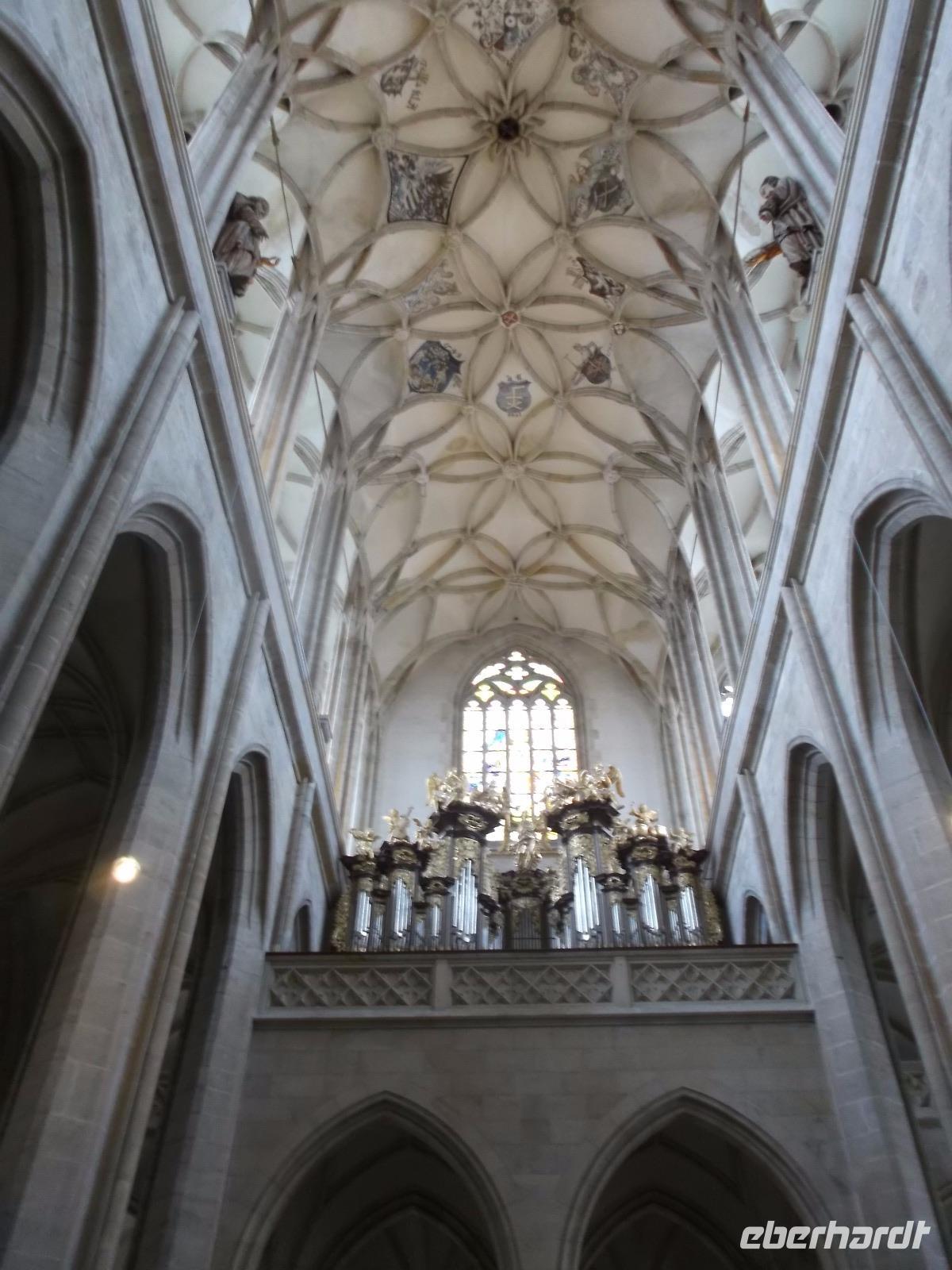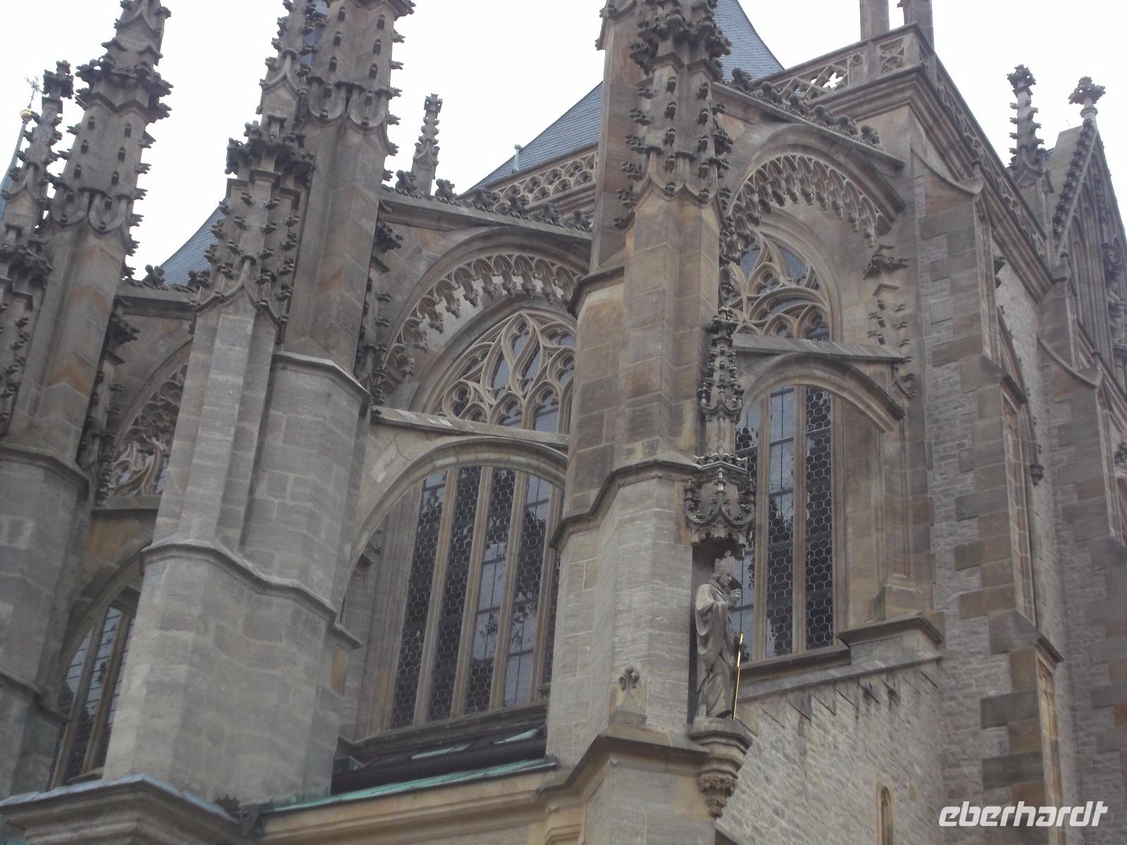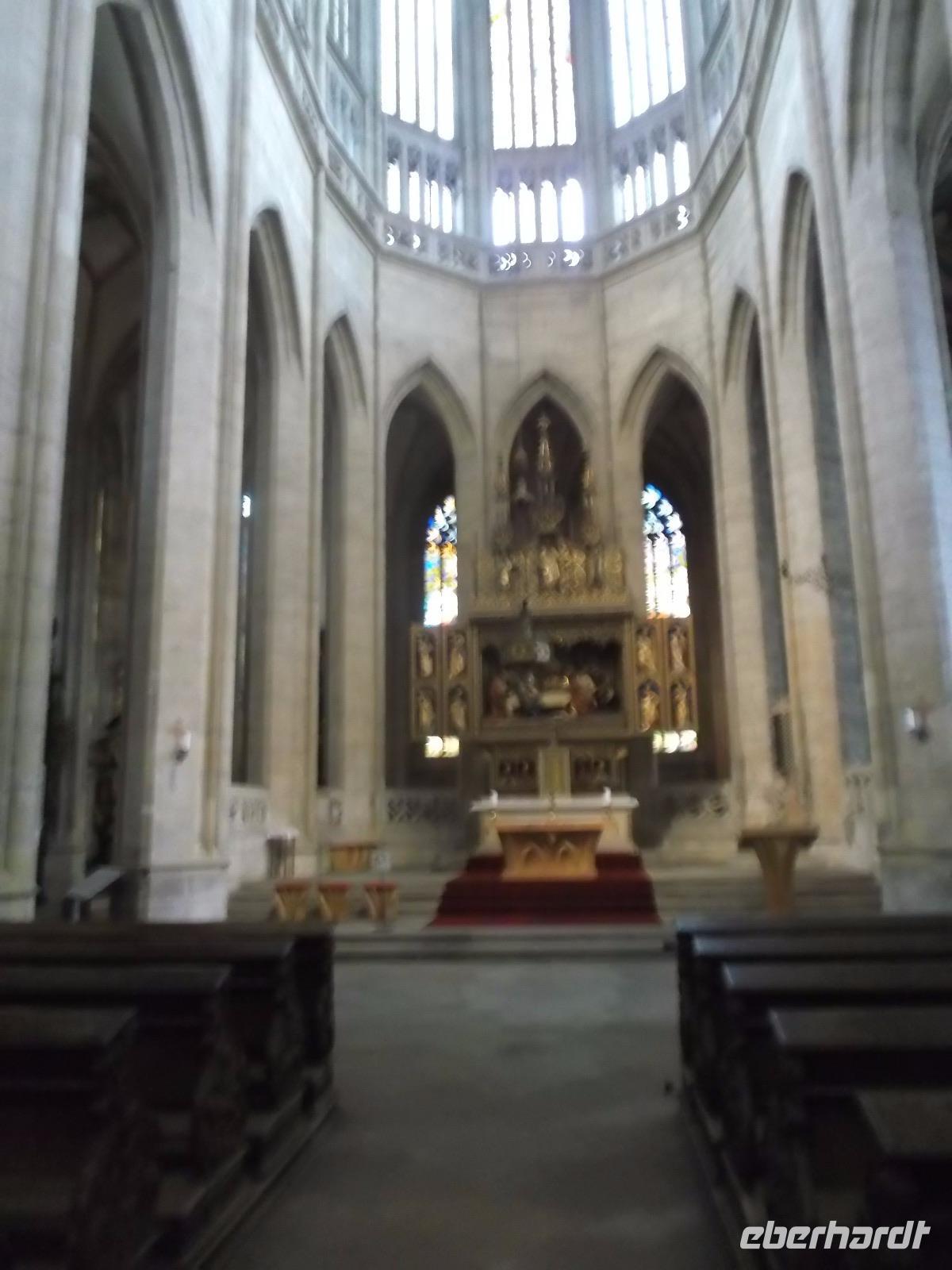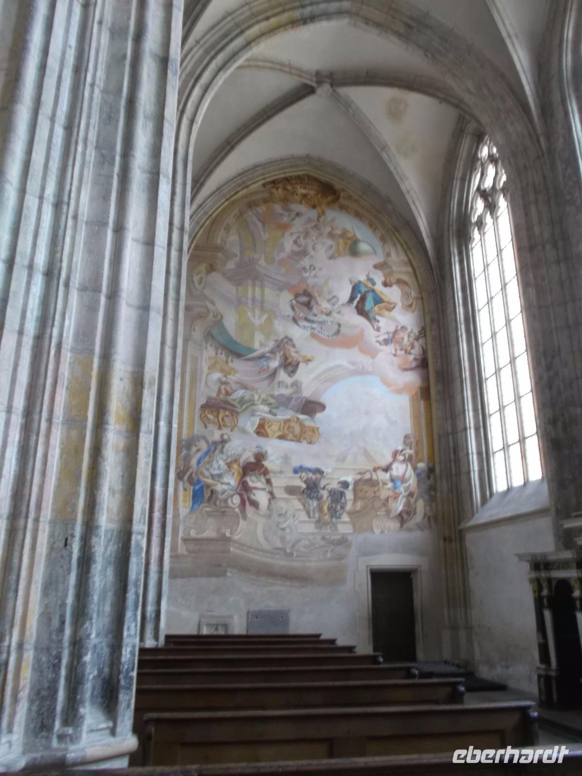 Das zweifellos imposanteste Gebäude in Kutná Hora aber ist der am Ende dieses Weges liegende und aufgrund seiner exponierten Lage weithin sichtbare Dom. Im Stil der Gotik nach französischem Vorbild begann man ihn ab kurz vor 1400 zu errichten und widmete ihn der Heiligen Barbara, der Schutzpatronin der Bergleute. Nach kriegsbedingten Bauunterbrechungen dauerte es lange, bis an ihm weitergearbeitet wurde, aber schließlich brach man den Bau ganz ab abbrach und vollendete das dennoch imposante Sakralbauwerk mit einer ungewöhnlichen, in drei Spitzen auslaufenden Dachkonstruktion - und ließ es ohne Turm!