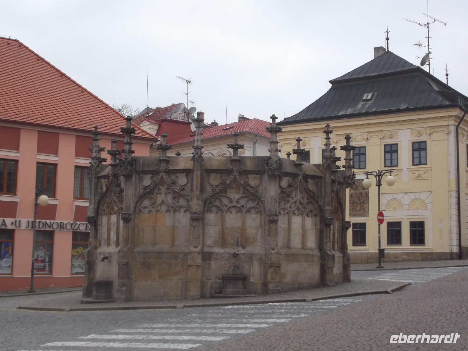 Nach Frühstück im Hotel und Koffer laden folgte noch einmal ein Spaziergang durch die Altstadt von Kutná Hora, die auf Deutsch einmal Kuttenberg hieß. Wir sahen den Markt und die historischen Gebäude der alten Silberbergbaustadt, zu denen unter anderem der interessante und in seiner Art einzigartige „Steinerne Brunnen" gehört. Als er im 15. Jh. errichtet wurde, herrschte noch der Architekturstil der Gotik vor und der prachvolle Ausbau dieser wichtigen öffentlichen Wasserentnahmestelle zeugte vom Reichtum und Kunstsinn der Bürger der damals noch sehr wohlhabenden Stadt. Noch älter sind der „Welsche Hof", den der böhmische König schon im 13. Jh. als sichere Aufbewahrung für das geschürfte Silber und als wichtige Münzprägestätte errichten ließ sowie die kleine Burg Hradek, die später auch Leute des Königs erwarben.