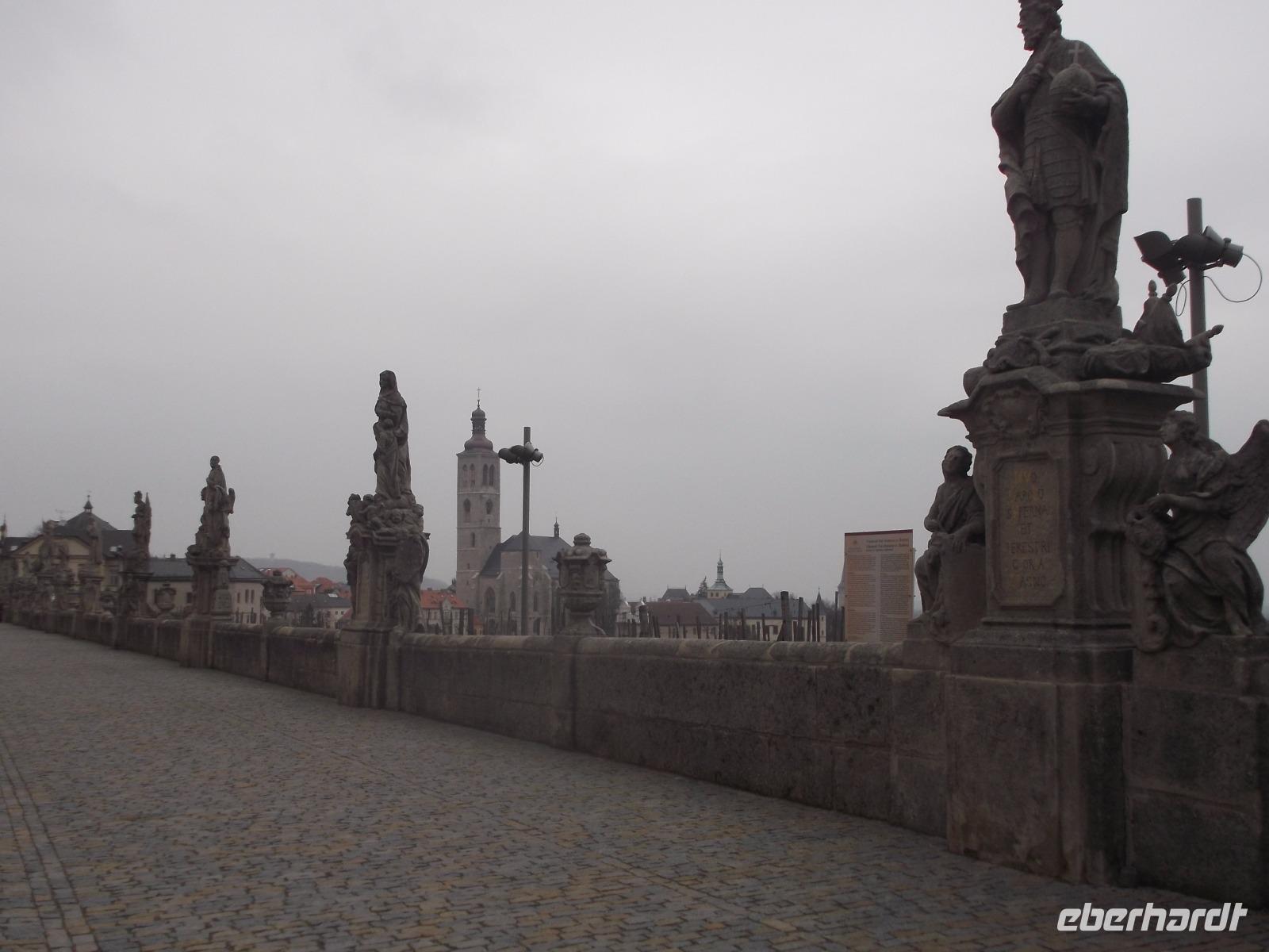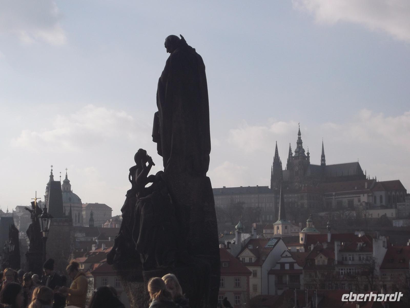 Vom Strahov mit seinem wunderschönen Lesesaal spazierten wir durch den Stadtteil Hradcany zur Burg, verschoben aber ihre Besichtigung wegen des gewaltigen Andranges nach der gerade erfolgten Wachablösung auf den Folgetag und bummelten den Burgberg hinunter zur Karlsbrücke. Unterwegs aßen wir noch in einem traditionellen böhmischen Gasthof zu Mittag und widmeten uns dann noch einmal der Karlsbrücke. Das Gedränge hier war natürlich nicht kleiner geworden als am Vortag, denn die Brücke, die zu den ältesten erhaltenen Steinbrücken Europas gehört, ist einer der bekanntesten Touristenmagneten der tschechischen Hauptstadt. Den Grundstein legte 1357 ihr Namenspatron, der bis heute noch verehrte böhmische König und deutsche Kaiser Karl IV. Allerdings wurde die Brücke offiziell erst 1870 nach ihm benannt und erhielt ihre heutige, dem Wesen nach barocke Gestalt mit symbolträchtigen Brückenfiguren über jedem Bogenpfeiler um 1700. Die älteste der Figuren, der böhmische Nationalheilige Nepomuk, stammt von 1683.